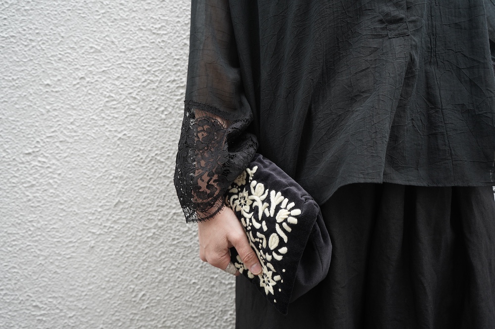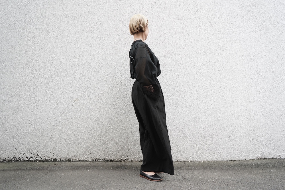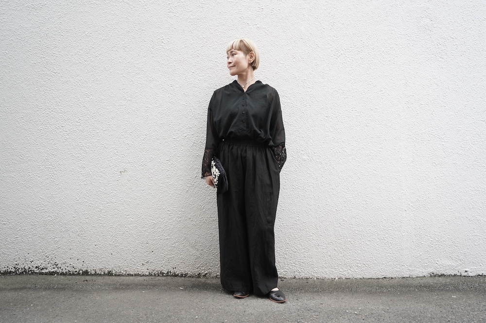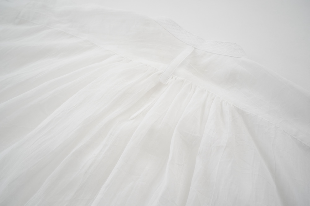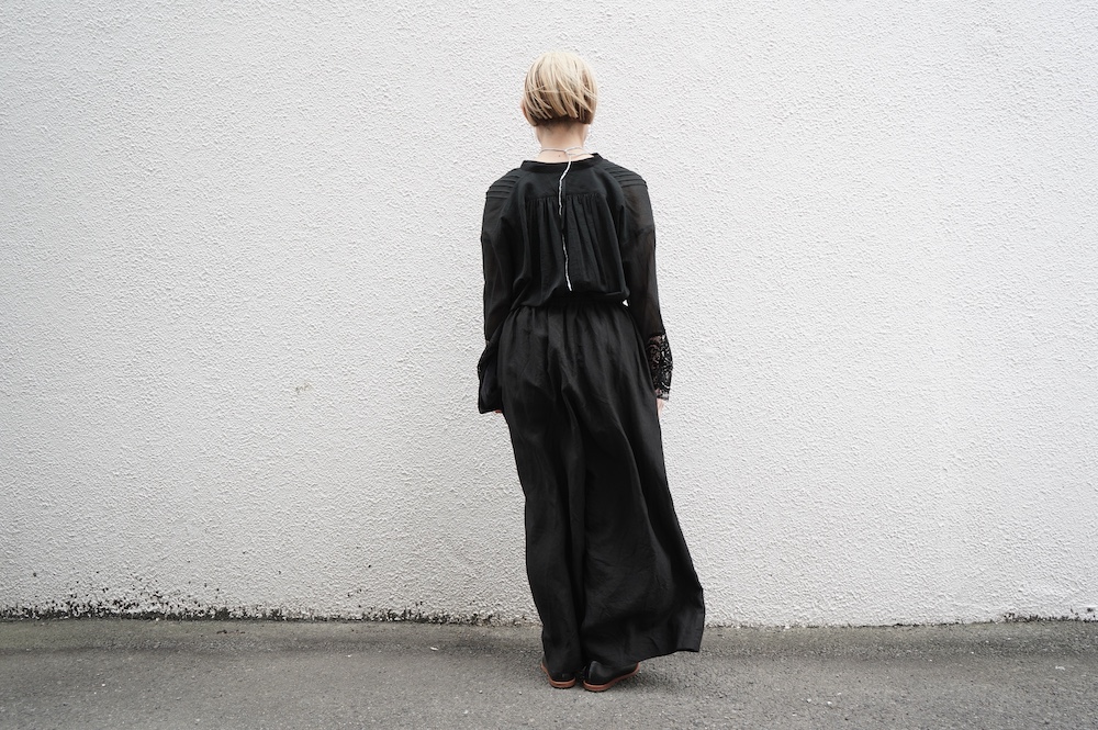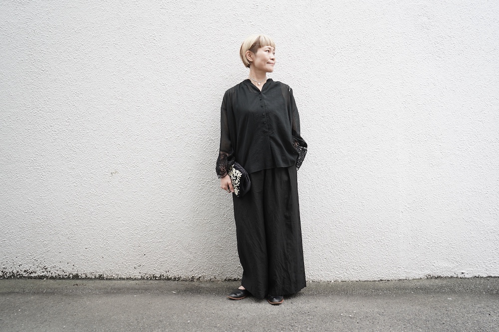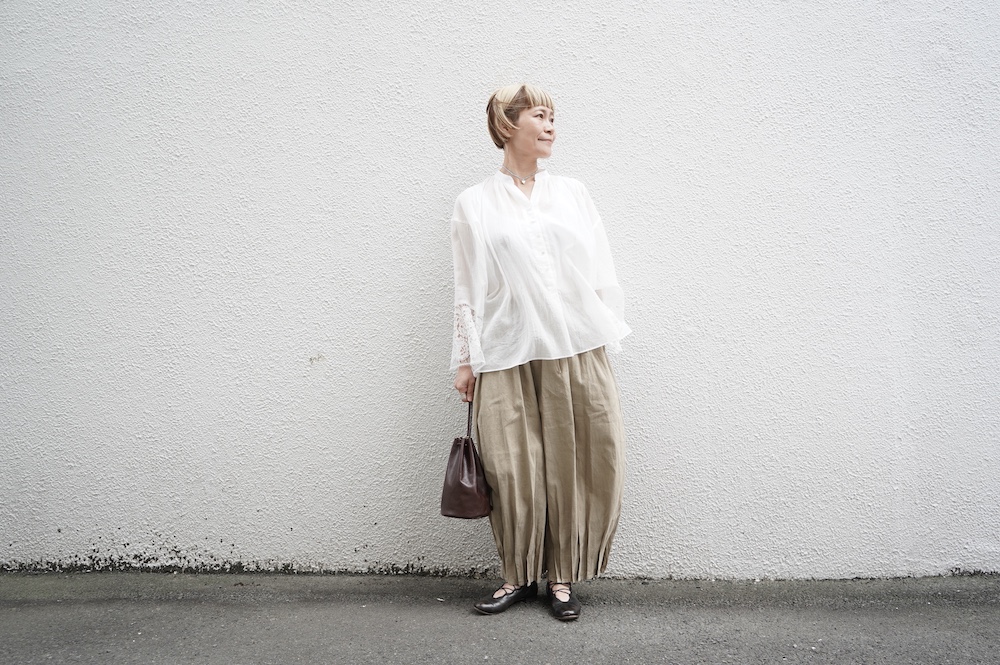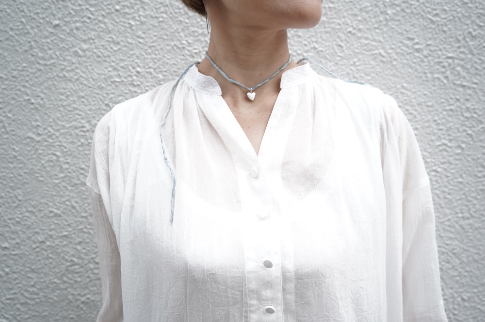 デザインは袖と襟にあしらわれたレースが目を引く、清涼感のあるプルオーバーブラウス。ボタンは一番上は付いておらず、着用するとV開きのような女性らしい印象に。前開きではなくプルオーバーです。使用しているレースはフランスのもので、繊細で複雑な模様が特徴的なリバーレースを使用。立体的で美しくとても華やかになります。肩ヨークはピンタック、後ろはギャザーが施されており、風が抜けるゆとりのあるシルエットです。見た目にも軽やかな、レースが美しいブラウスです。
