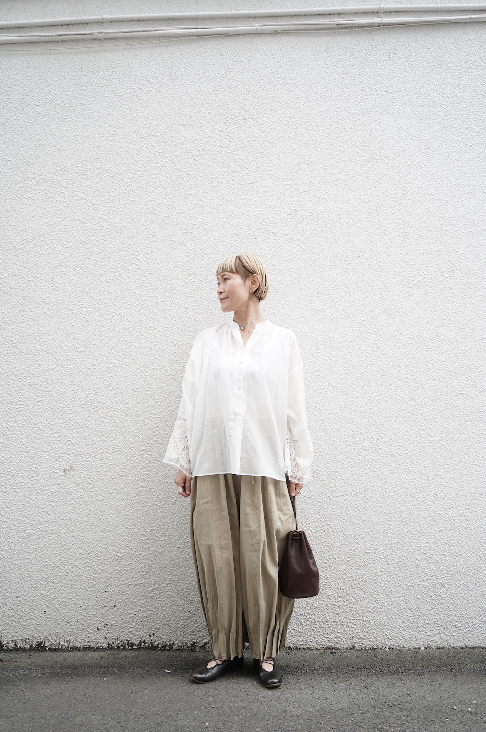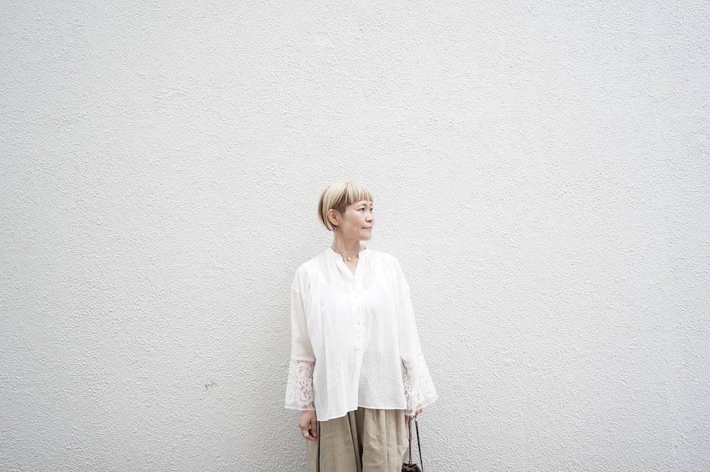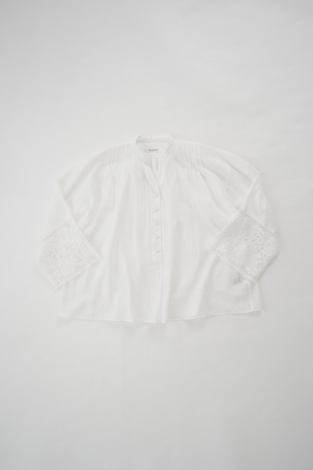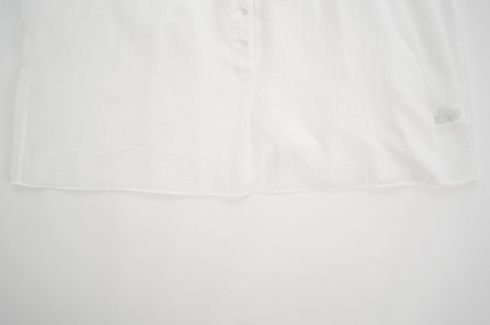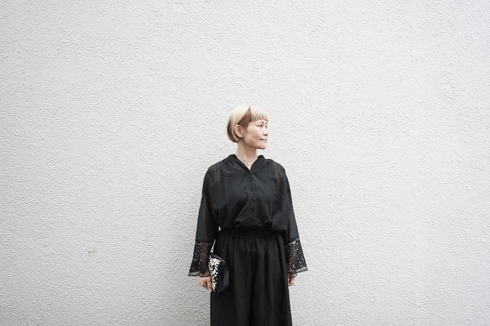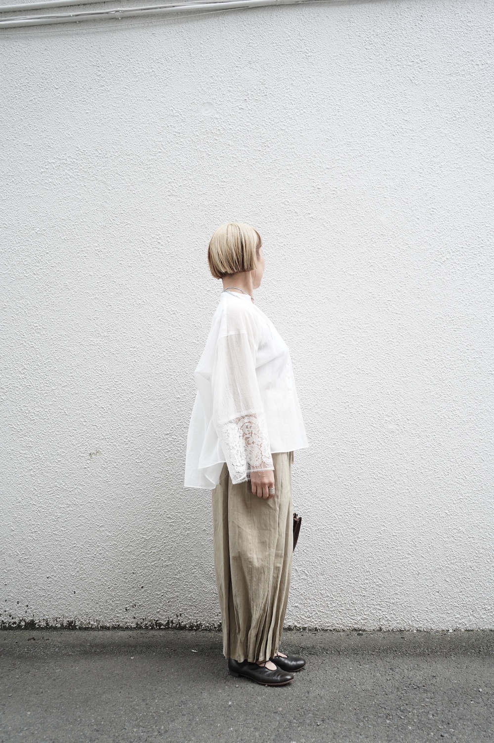 デザインは袖と襟にあしらわれたレースが目を引く、清涼感のあるプルオーバーブラウス。ボタンは一番上は付いておらず、着用するとV開きのような女性らしい印象に。前開きではなくプルオーバーです。使用しているレースはフランスのもので、繊細で複雑な模様が特徴的なリバーレースを使用。立体的で美しくとても華やかになります。肩ヨークはピンタック、後ろはギャザーが施されており、風が抜けるゆとりのあるシルエットです。見た目にも軽やかな、レースが美しいブラウスです。