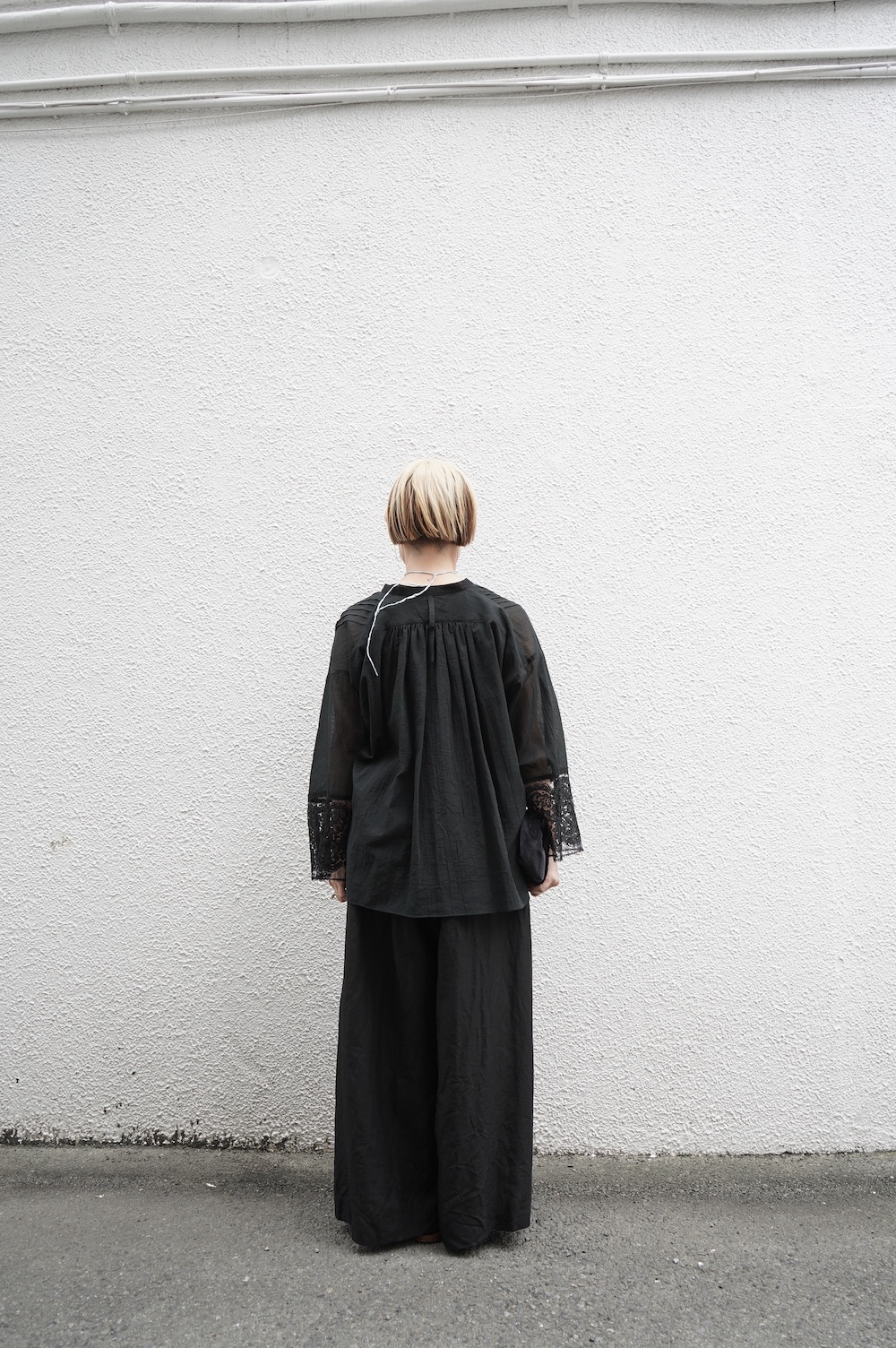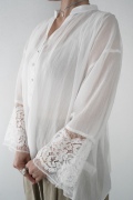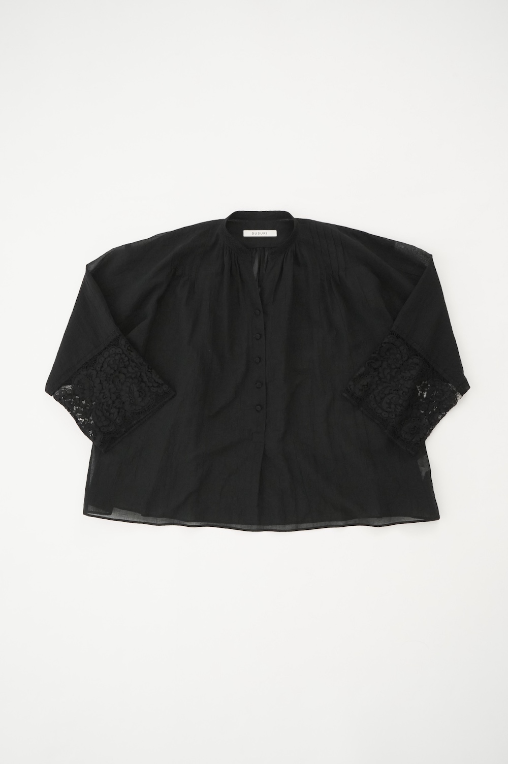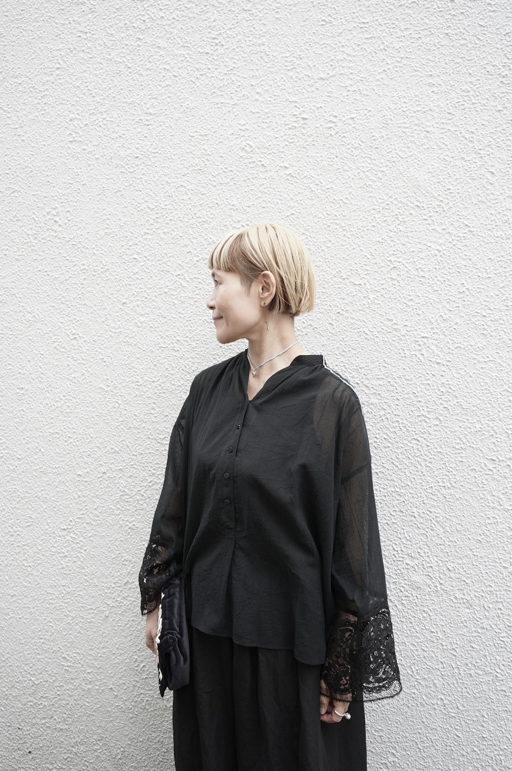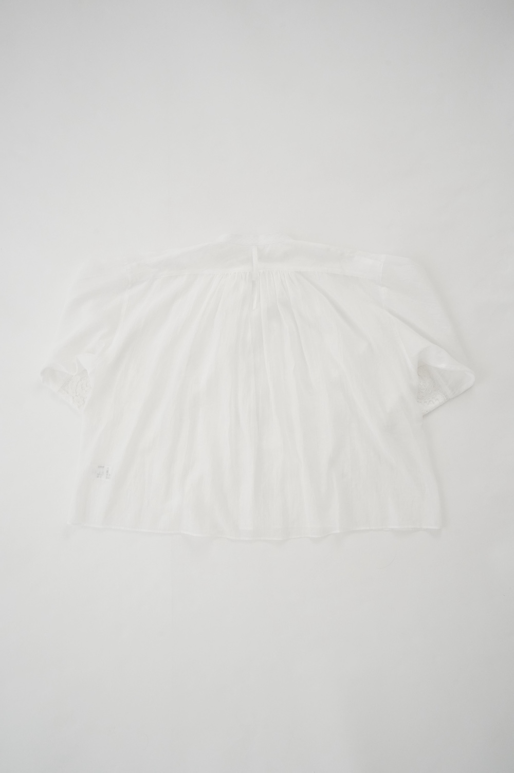 デザインは袖と襟にあしらわれたレースが目を引く、清涼感のあるプルオーバーブラウス。ボタンは一番上は付いておらず、着用するとV開きのような女性らしい印象に。前開きではなくプルオーバーです。使用しているレースはフランスのもので、繊細で複雑な模様が特徴的なリバーレースを使用。立体的で美しくとても華やかになります。肩ヨークはピンタック、後ろはギャザーが施されており、風が抜けるゆとりのあるシルエットです。見た目にも軽やかな、レースが美しいブラウスです。