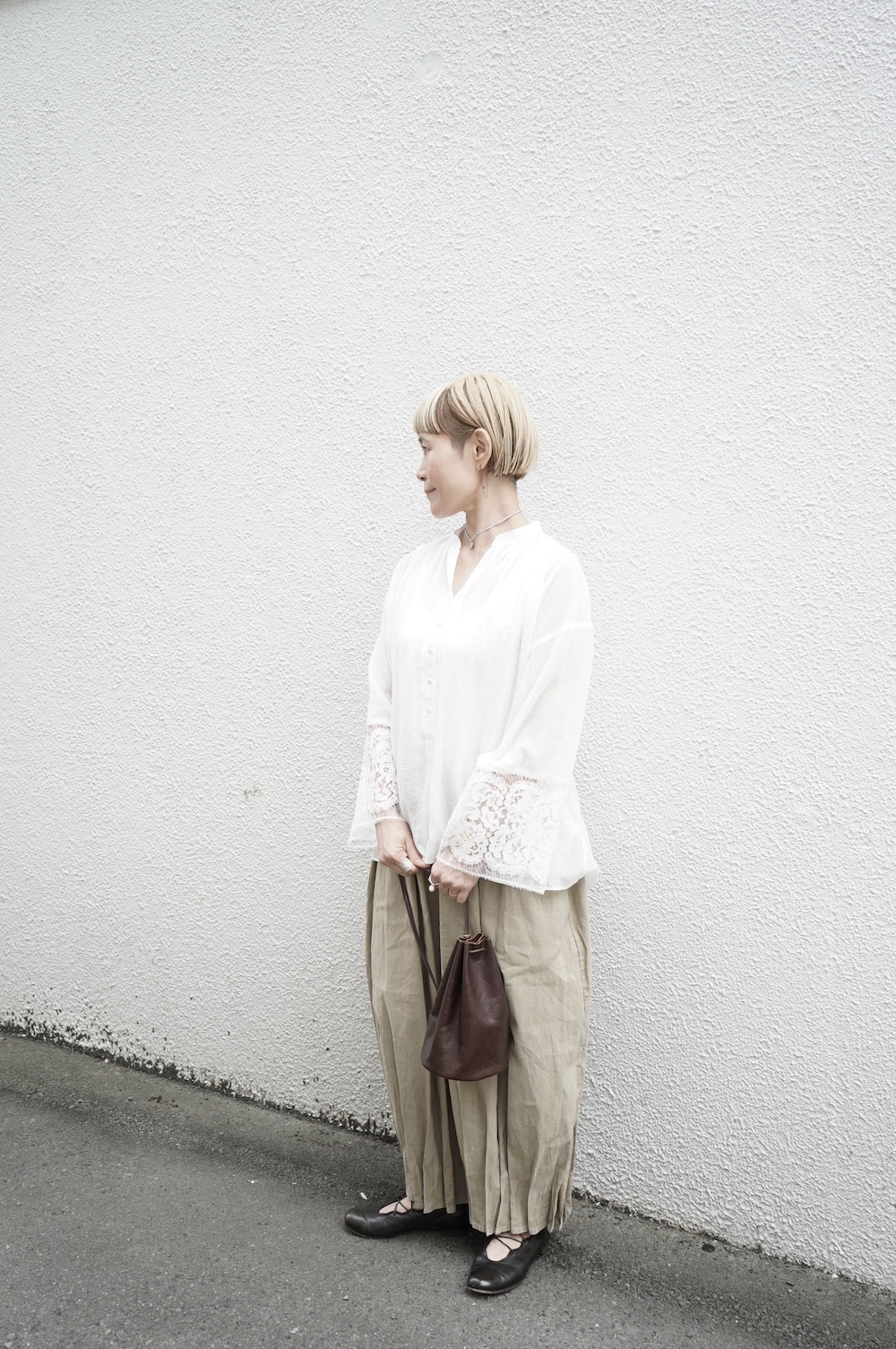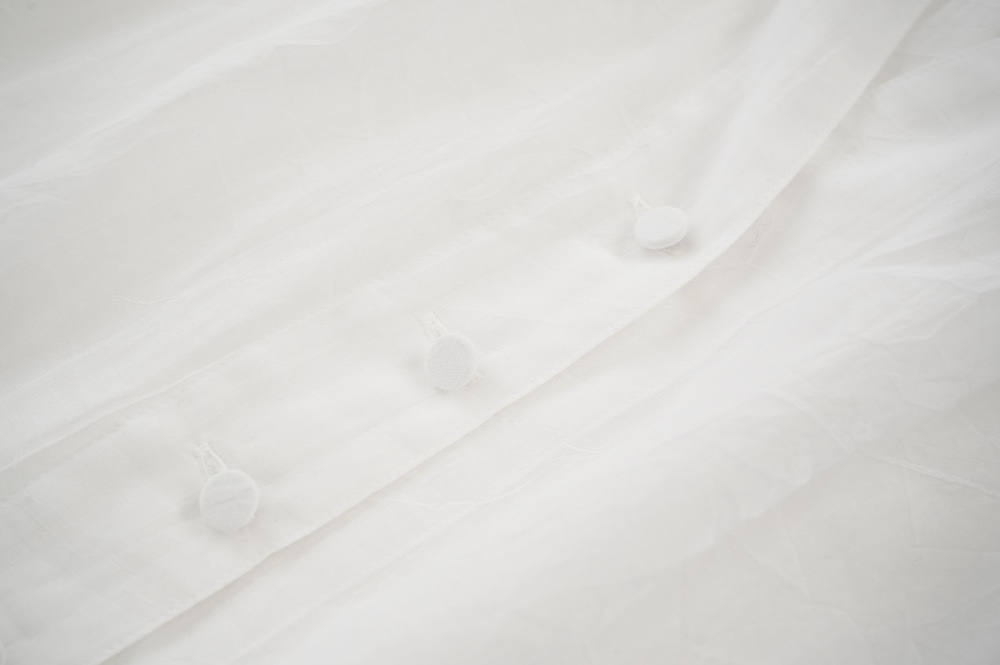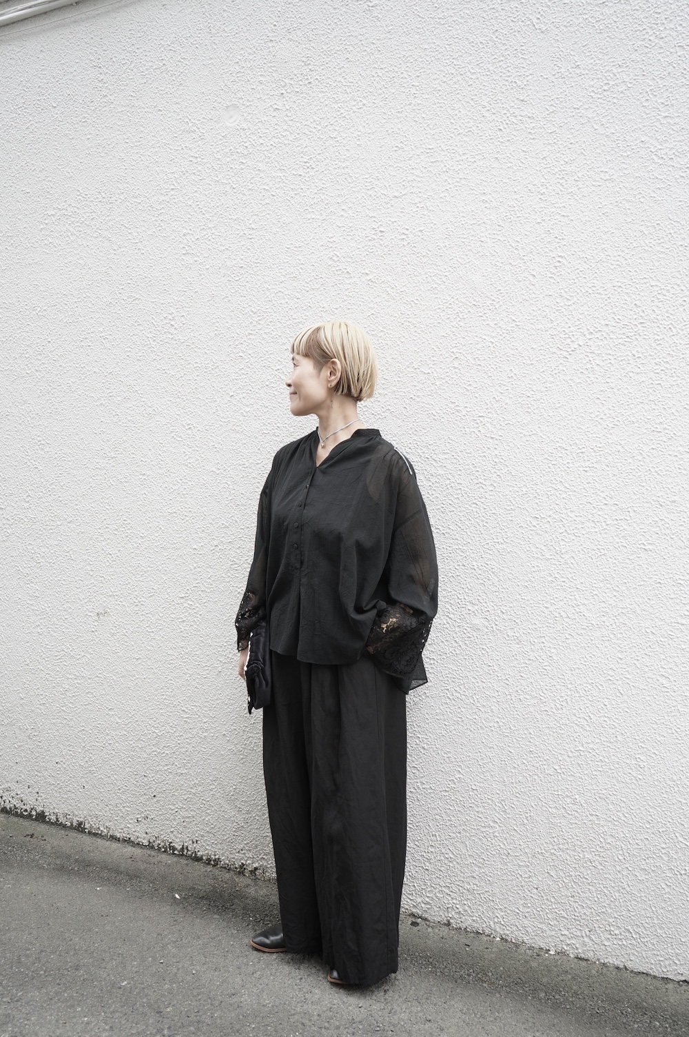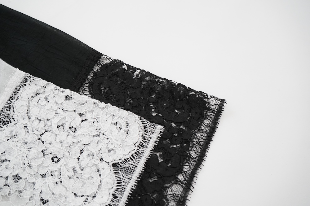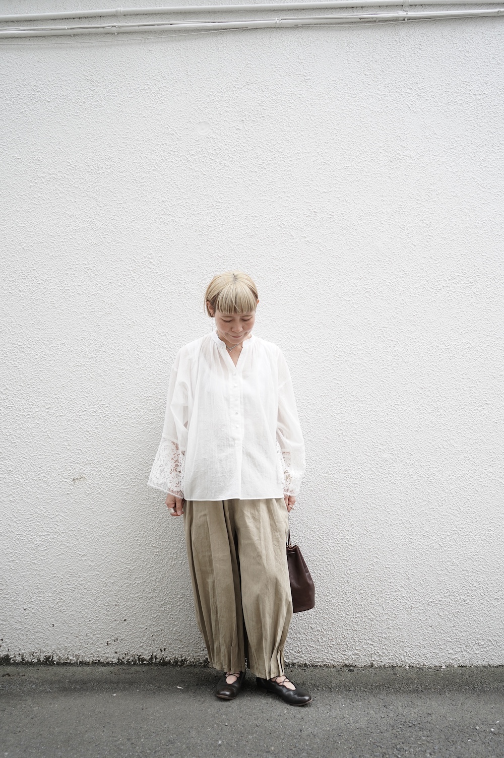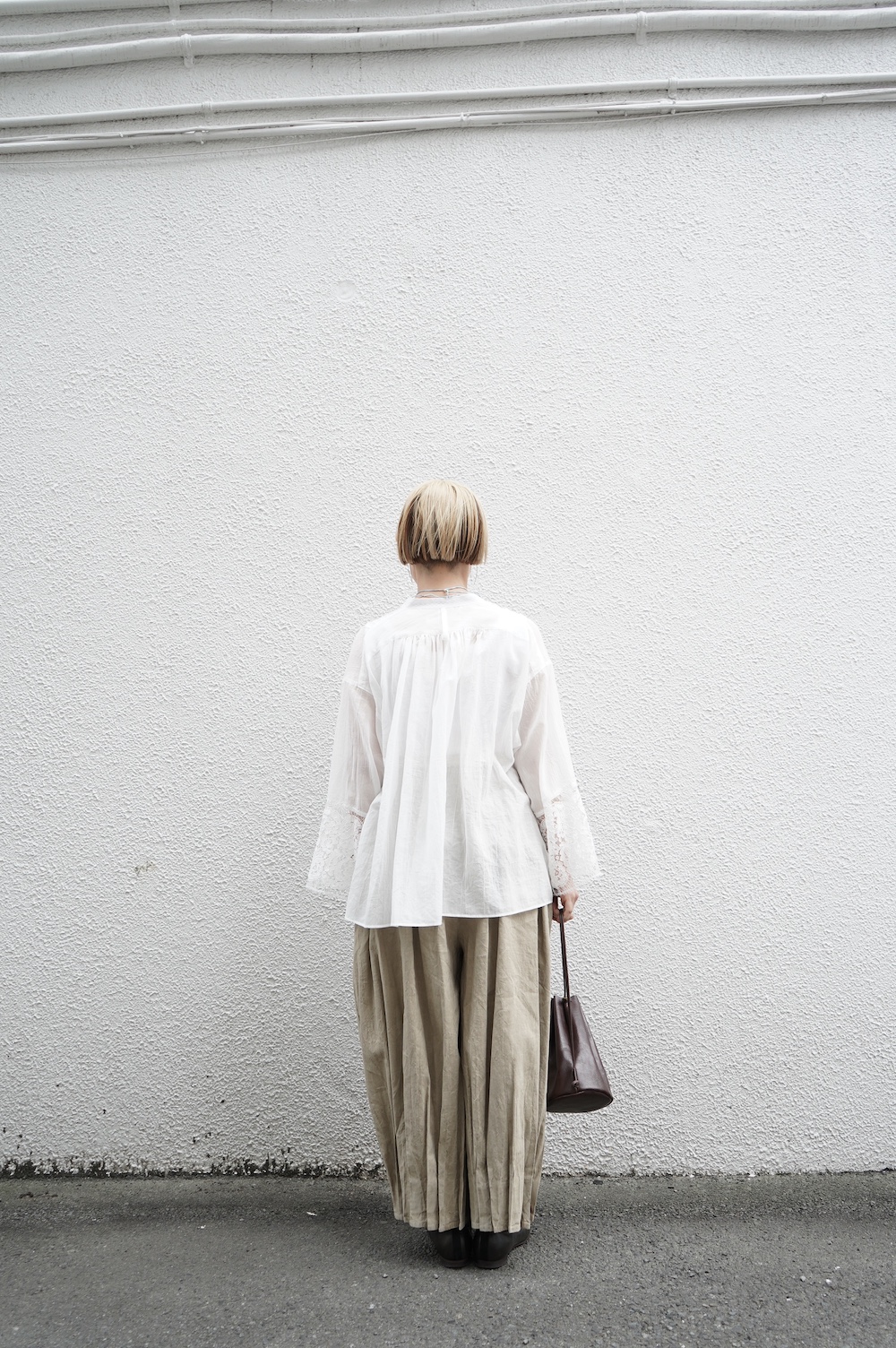デザインは袖と襟にあしらわれたレースが目を引く、清涼感のあるプルオーバーブラウス。ボタンは一番上は付いておらず、着用するとV開きのような女性らしい印象に。前開きではなくプルオーバーです。使用しているレースはフランスのもので、繊細で複雑な模様が特徴的なリバーレースを使用。立体的で美しくとても華やかになります。肩ヨークはピンタック、後ろはギャザーが施されており、風が抜けるゆとりのあるシルエットです。見た目にも軽やかな、レースが美しいブラウスです。
