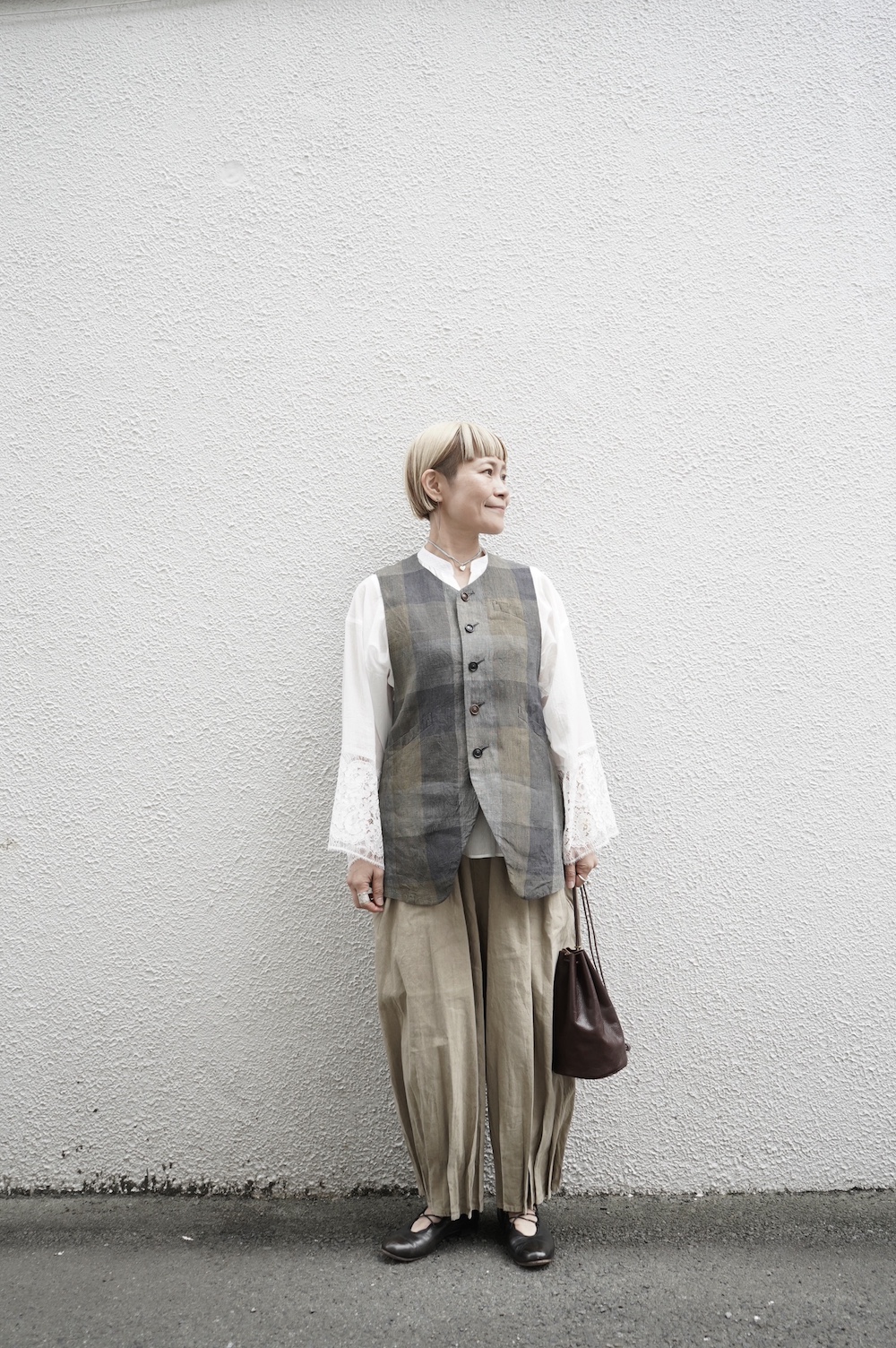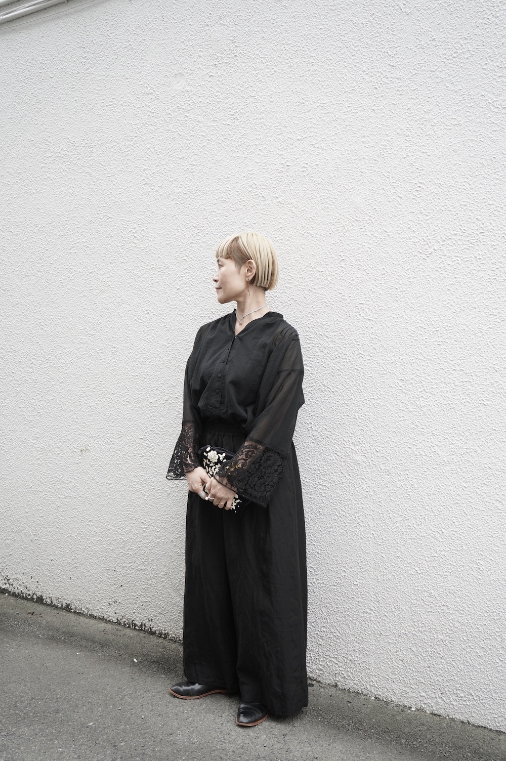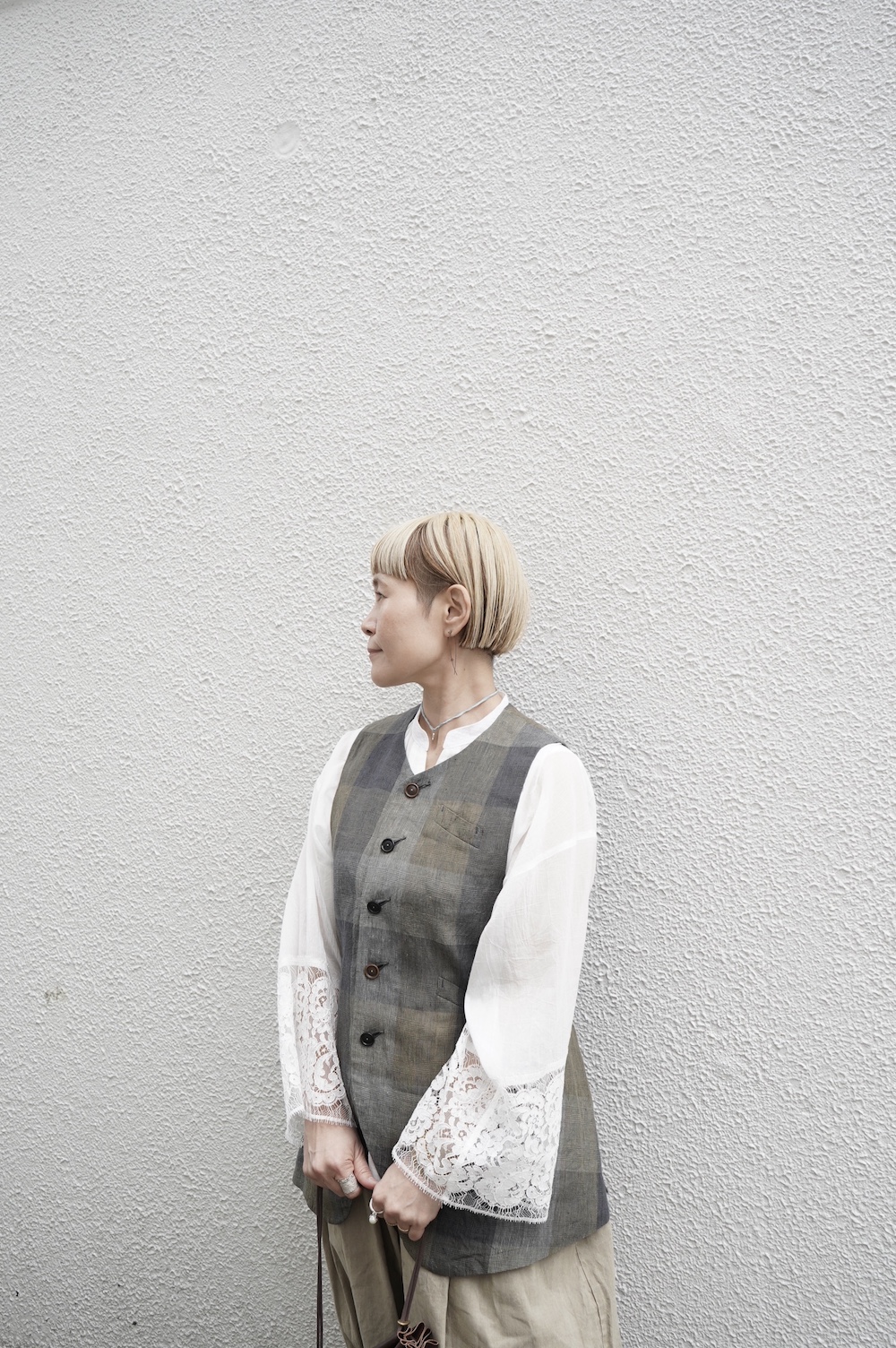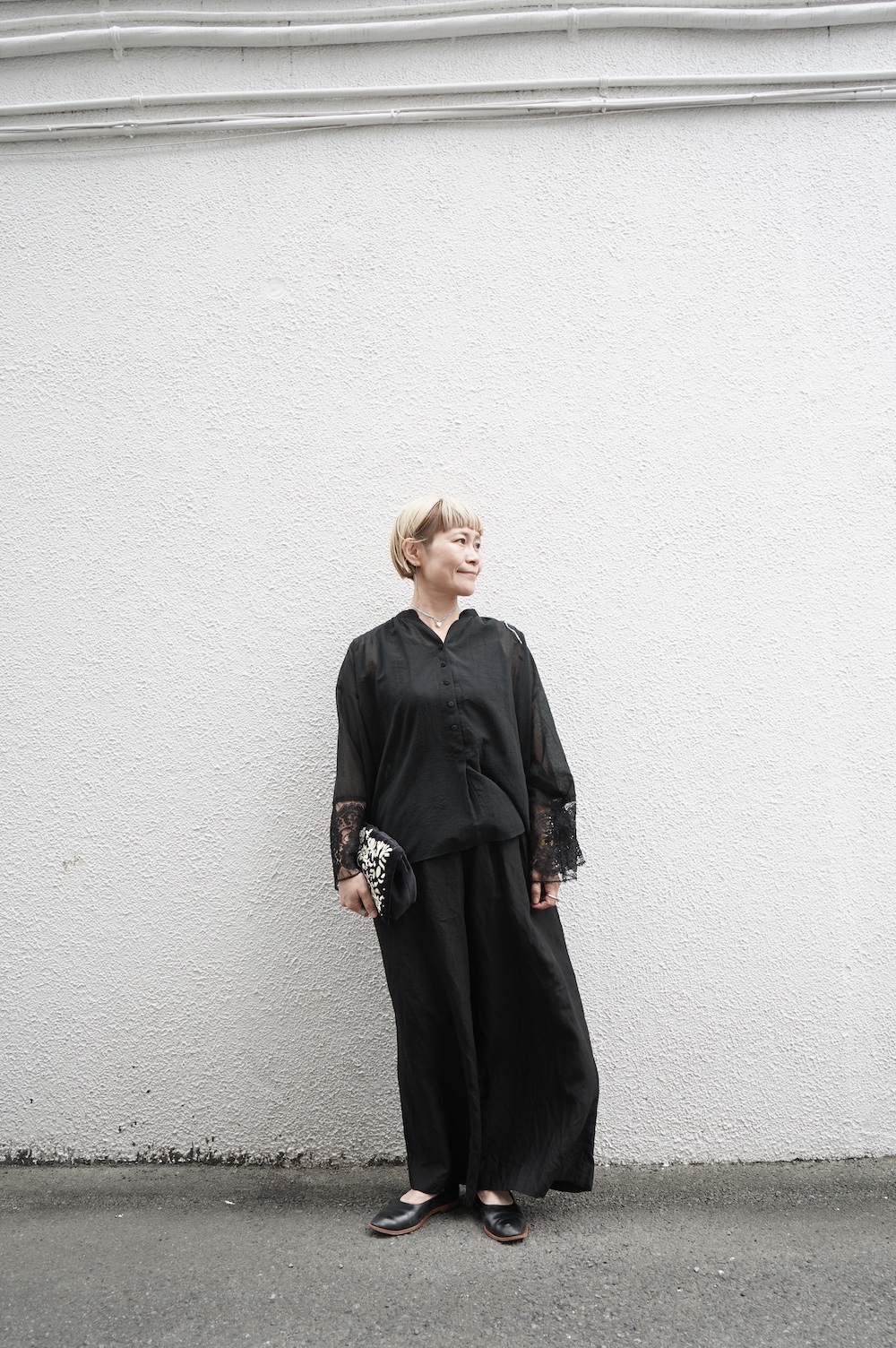 デザインは袖と襟にあしらわれたレースが目を引く、清涼感のあるプルオーバーブラウス。ボタンは一番上は付いておらず、着用するとV開きのような女性らしい印象に。前開きではなくプルオーバーです。使用しているレースはフランスのもので、繊細で複雑な模様が特徴的なリバーレースを使用。立体的で美しくとても華やかになります。肩ヨークはピンタック、後ろはギャザーが施されており、風が抜けるゆとりのあるシルエットです。見た目にも軽やかな、レースが美しいブラウスです。