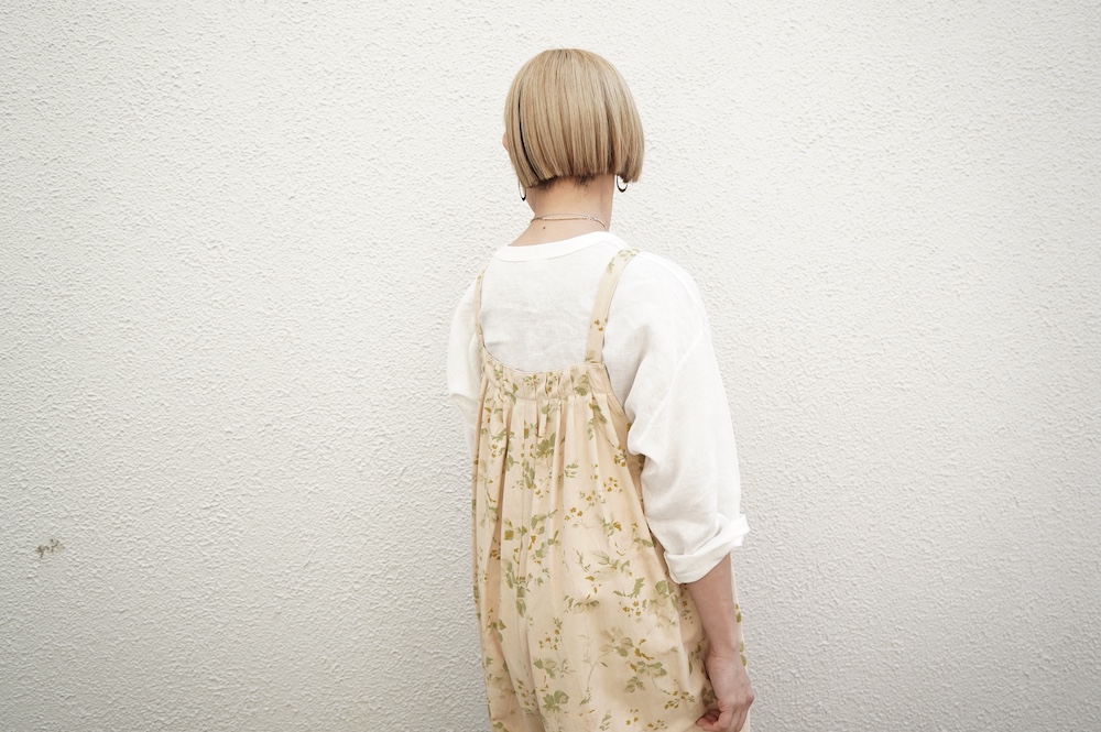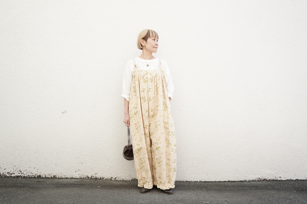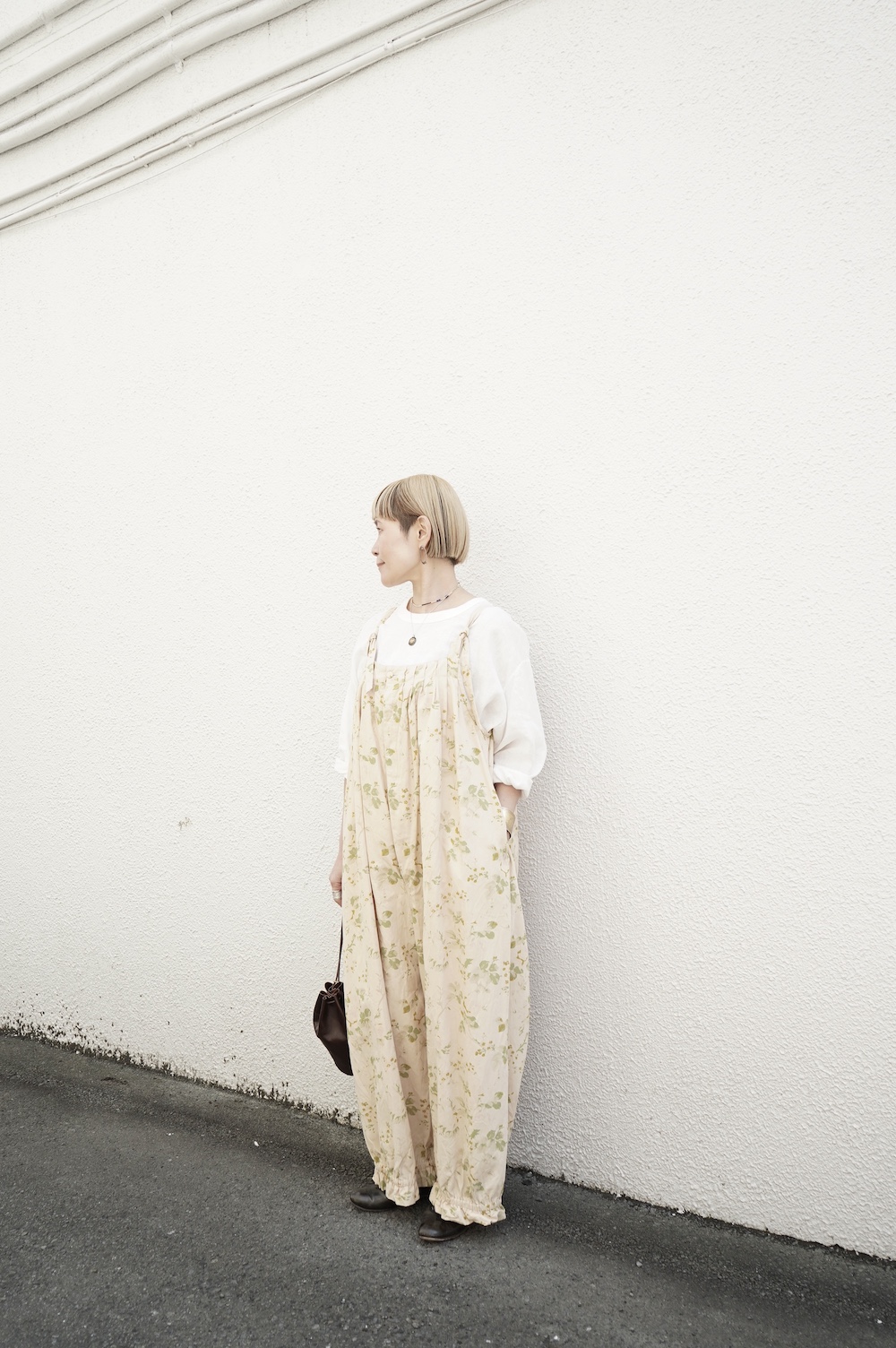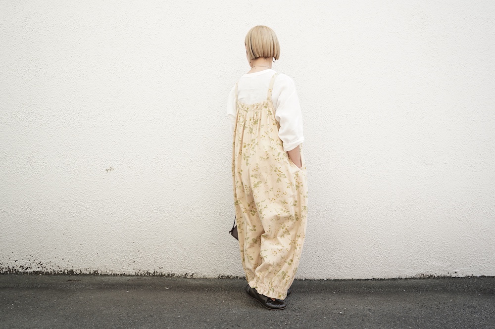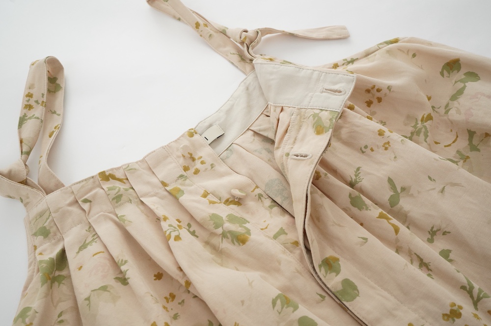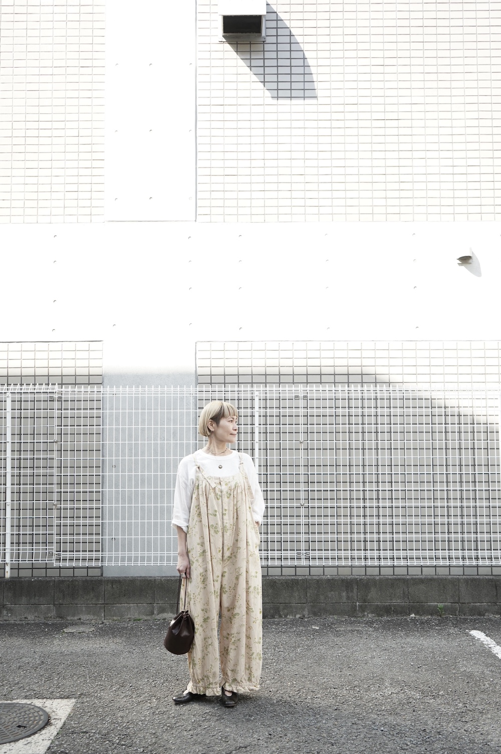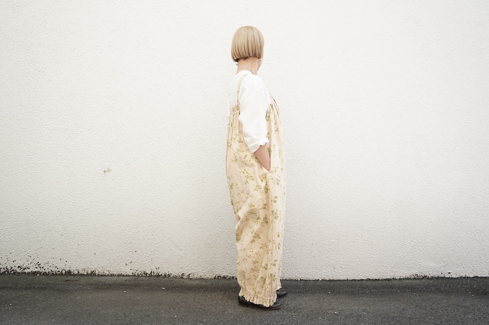 デザインは新作で、太さのあるパンツシルエットが特徴のサロペットです。肩紐はループに通して結き、長さ調整ができるミニマルなデザインで、フロントタック、長い比翼ボタンとSUSURIの特徴的なディテールが目に留まります。ボリュームのあるパンツ部分を心地よく収めるかのような裾のゴムシャーリング
