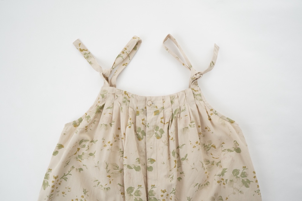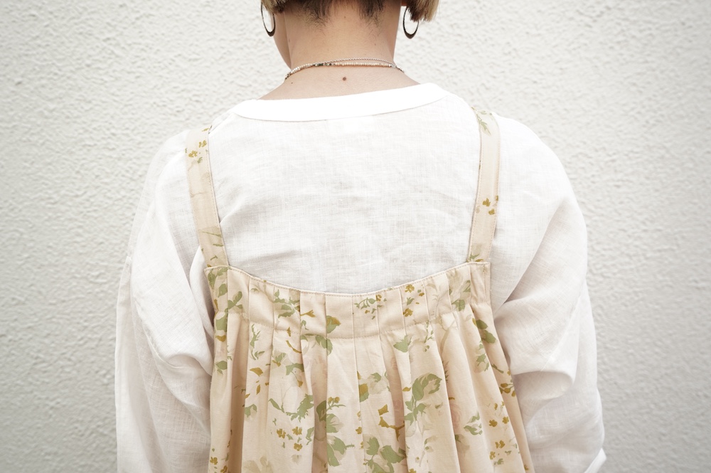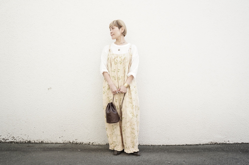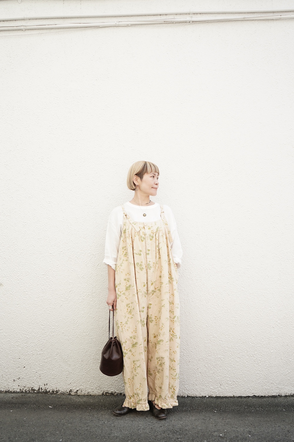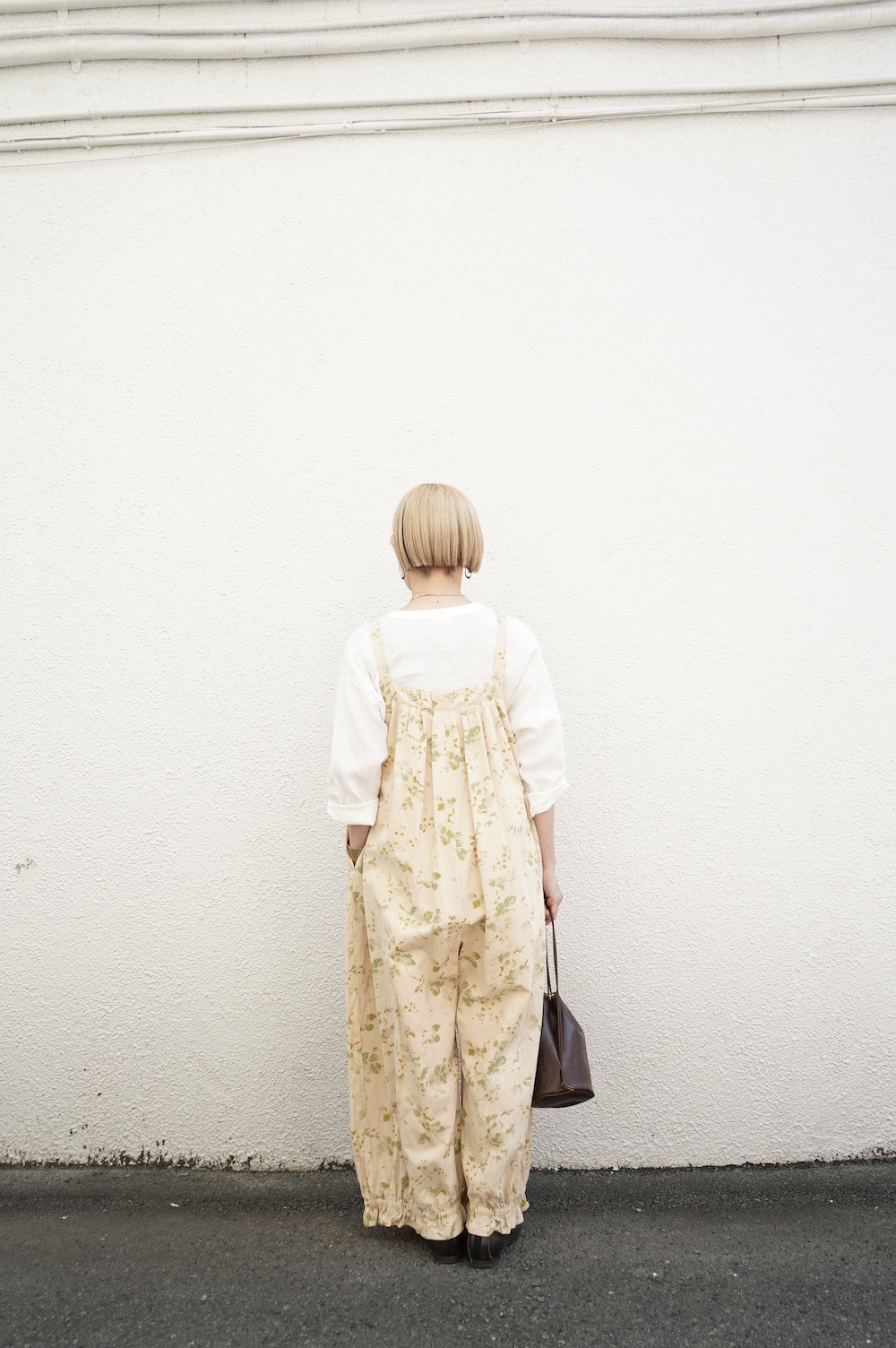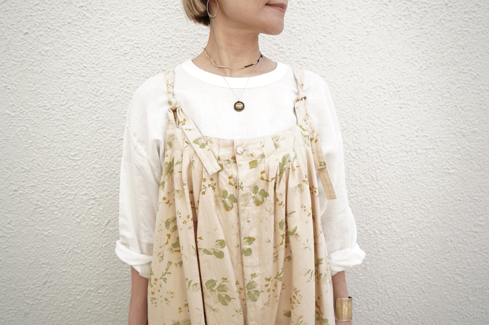 デザインは新作で、太さのあるパンツシルエットが特徴のサロペットです。肩紐はループに通して結き、長さ調整ができるミニマルなデザインで、フロントタック、長い比翼ボタンとSUSURIの特徴的なディテールが目に留まります。ボリュームのあるパンツ部分を心地よく収めるかのような裾のゴムシャーリング
