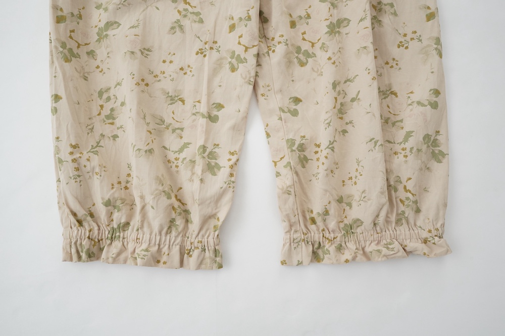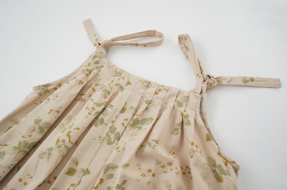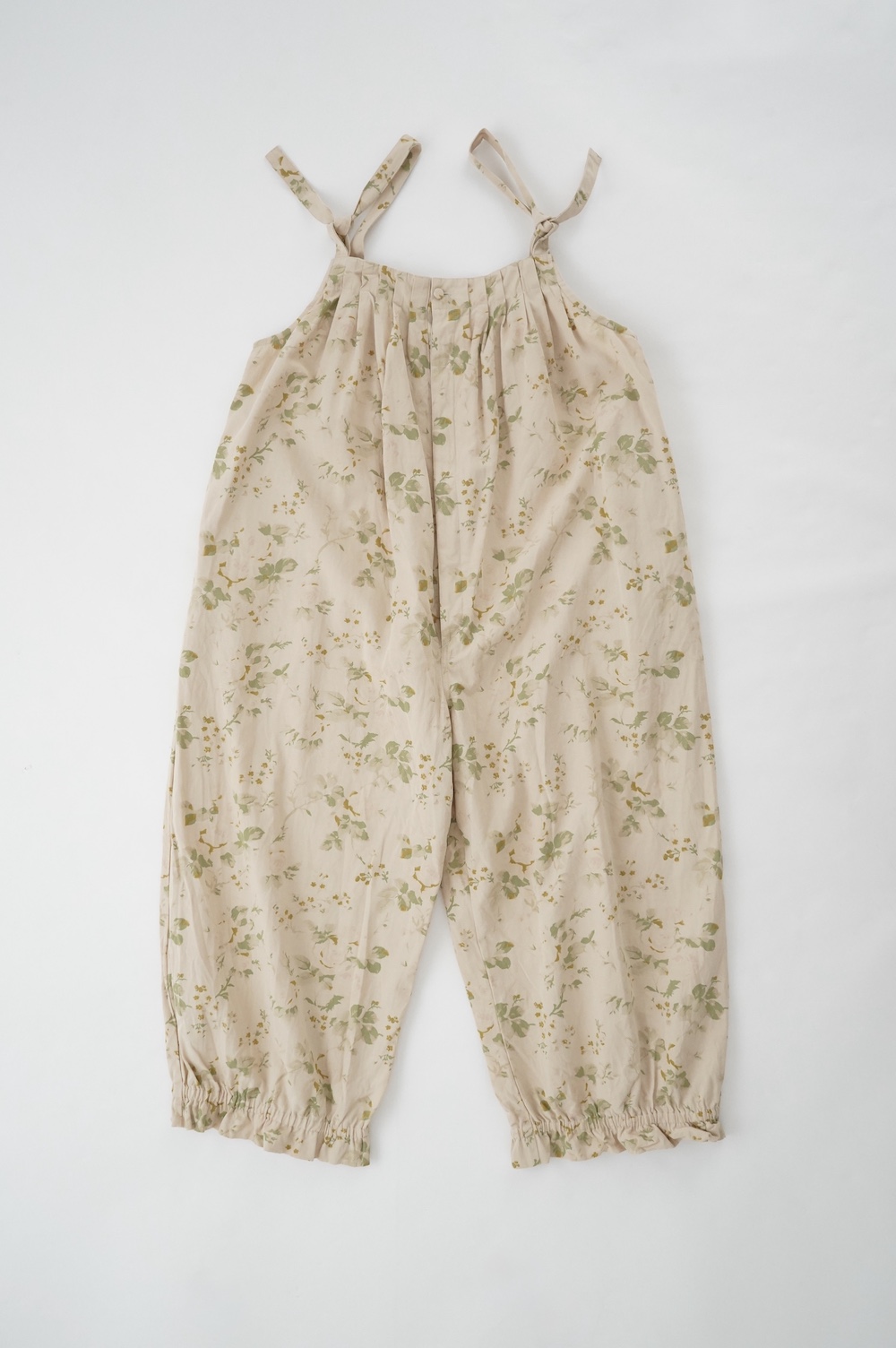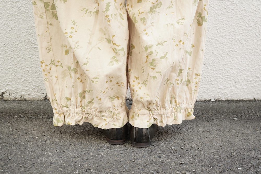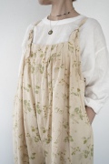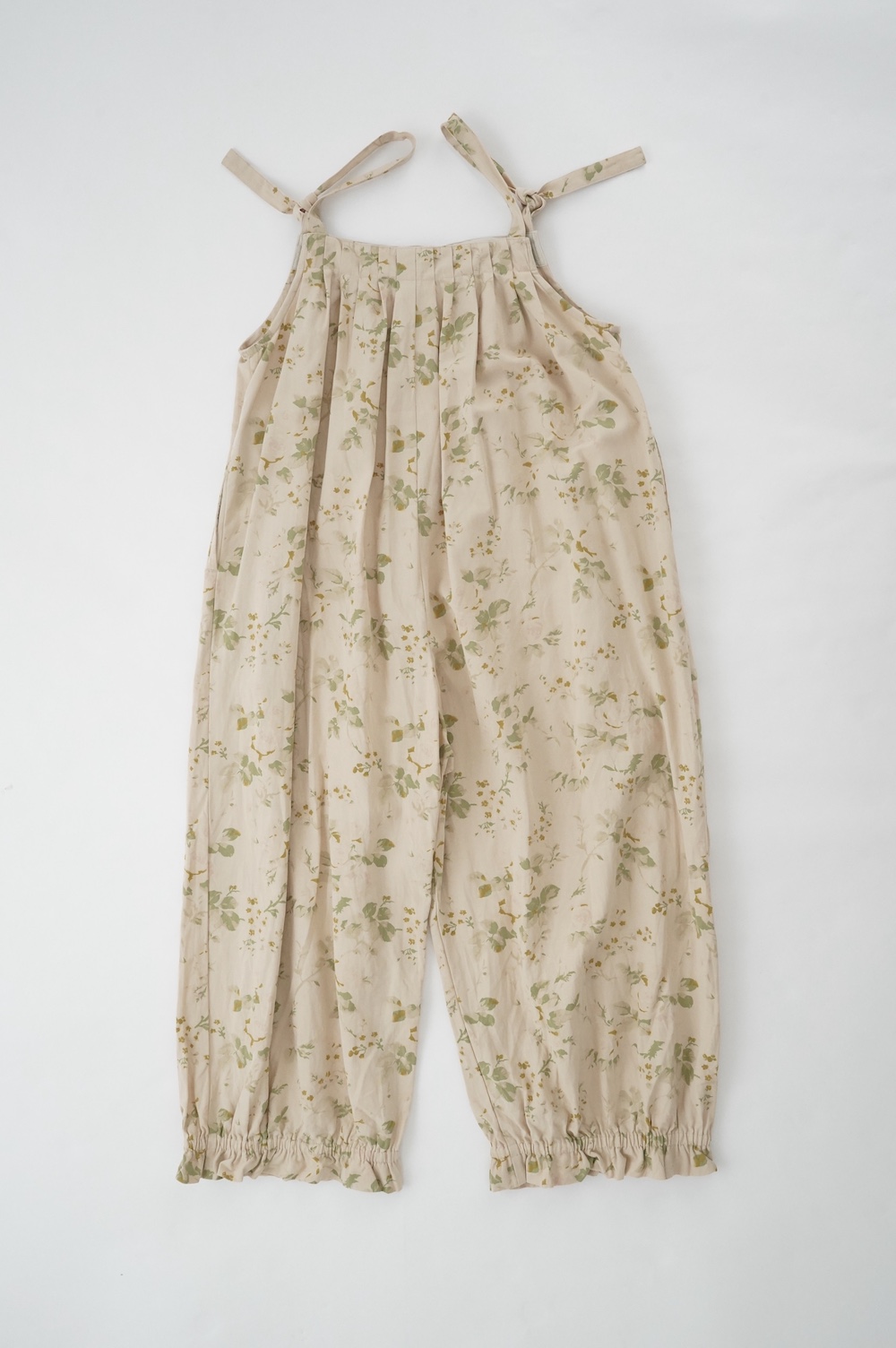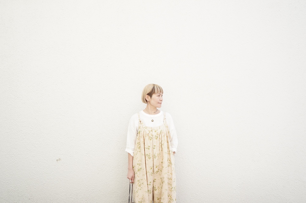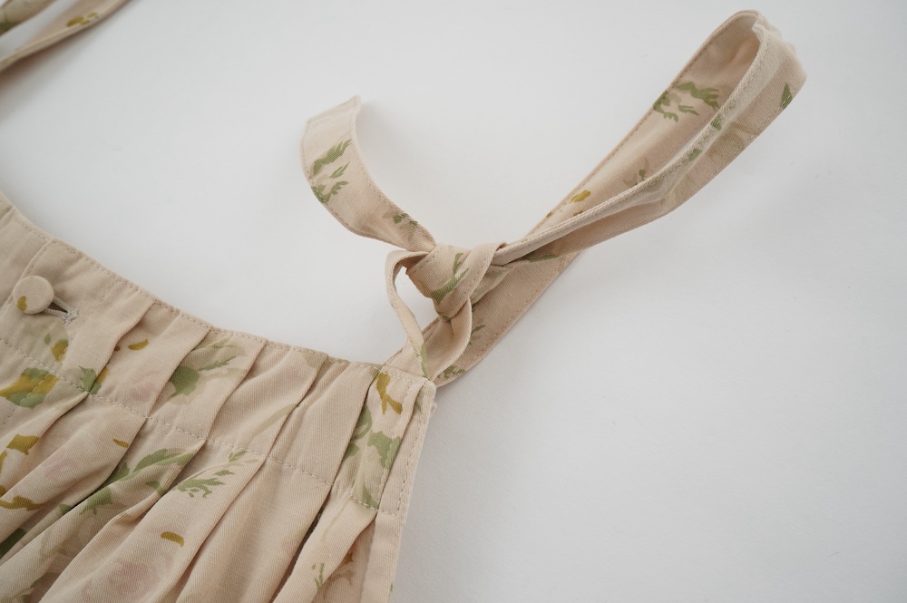 デザインは新作で、太さのあるパンツシルエットが特徴のサロペットです。肩紐はループに通して結き、長さ調整ができるミニマルなデザインで、フロントタック、長い比翼ボタンとSUSURIの特徴的なディテールが目に留まります。ボリュームのあるパンツ部分を心地よく収めるかのような裾のゴムシャーリング