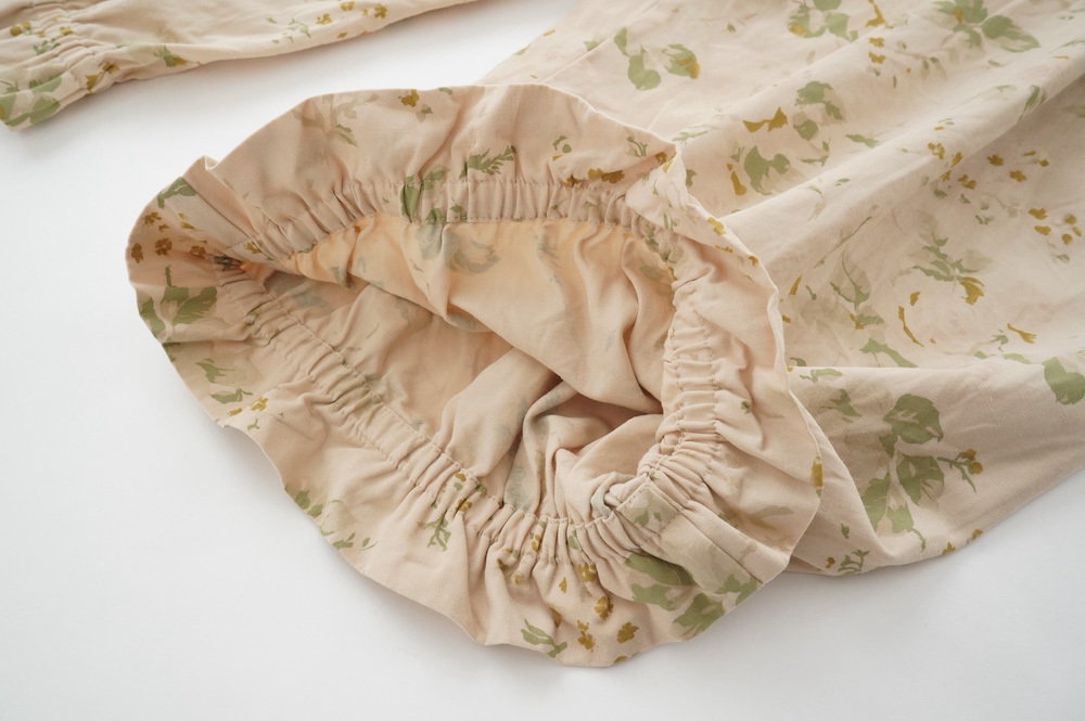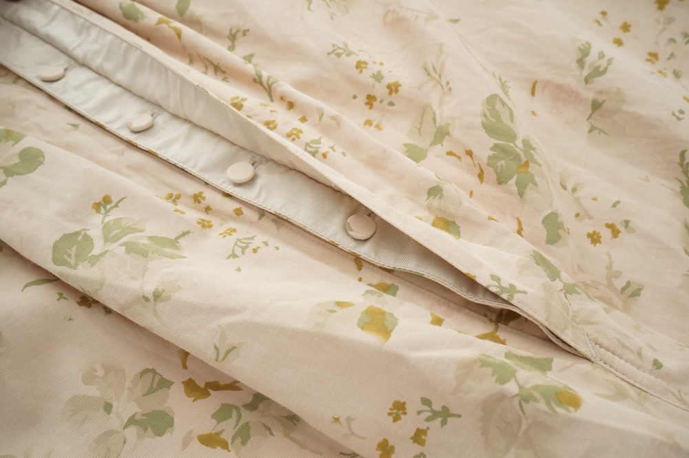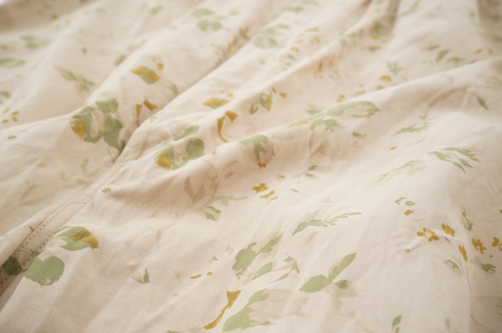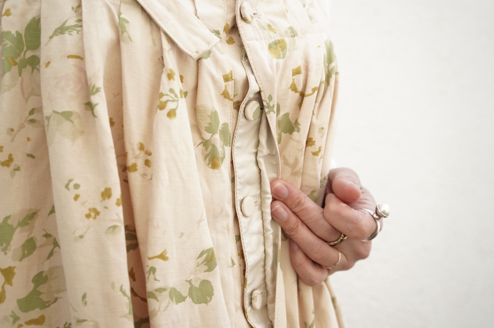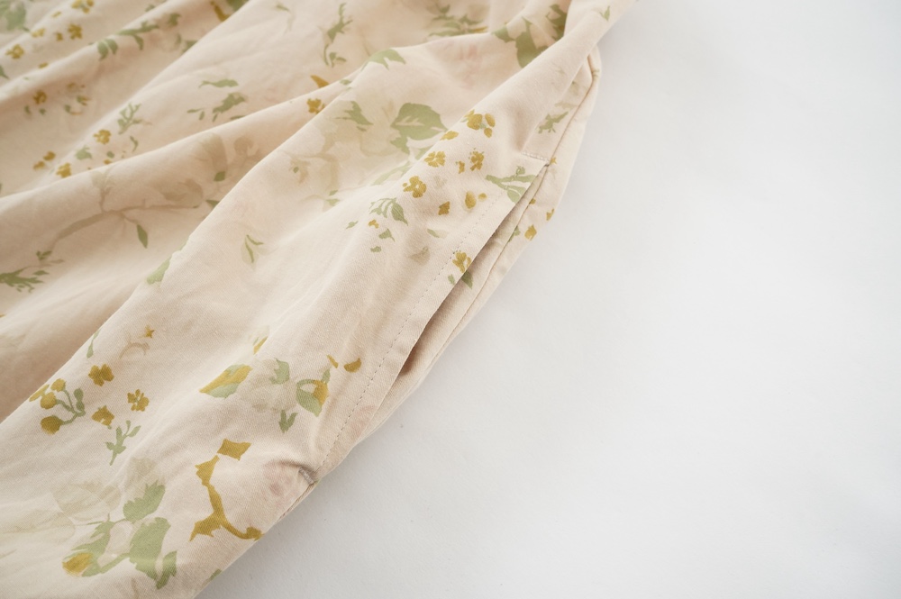 コットンリネンのオリジナルファブリックは、しっかりした密度を感じさせながらもシャカシャカせず、どこか甘撚の、生地を束ねて掴んだ際のふかっとした感触は、SUSURIらしい2面性を感じさせる素材です。基布は静岡で織り上げた綾織りの素材で、上品でしなやかな手触りはいかにも上質です。プリントは京都にて行っています。基布をベージュに染めた後でオーバープリントをすることで、より一層の奥行きを感じます。多色のハンドシルクスクリーンが贅沢な布地です。