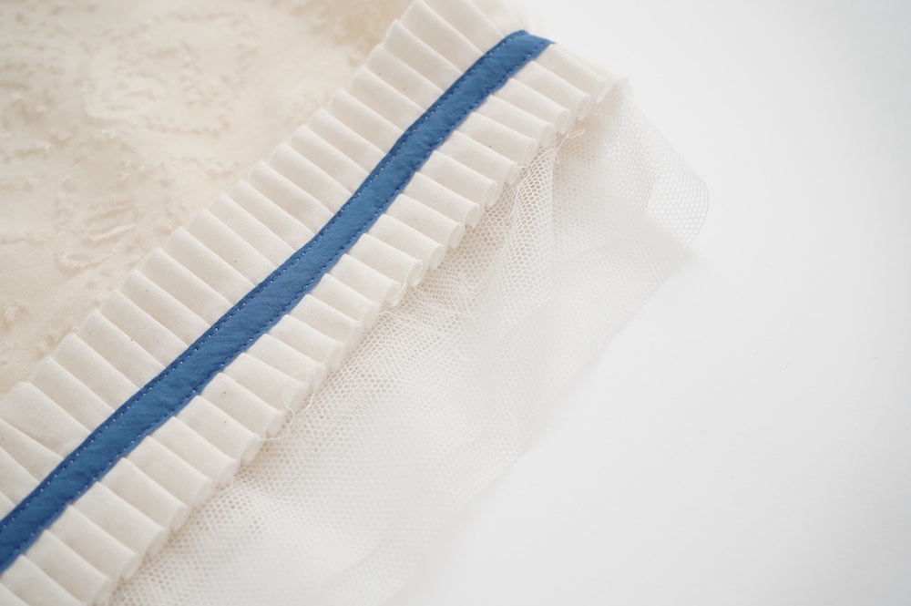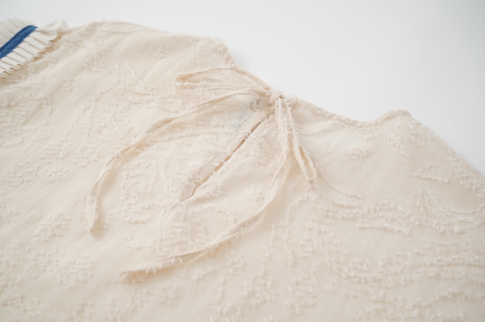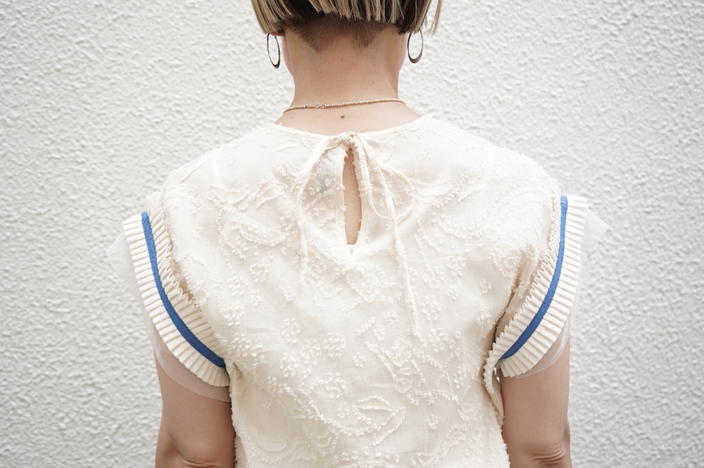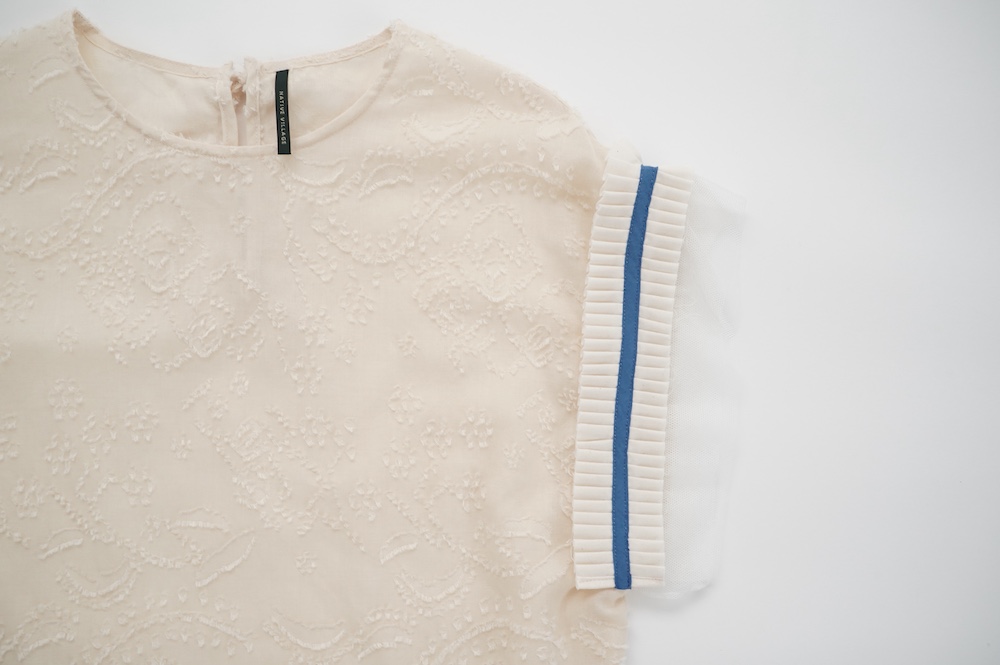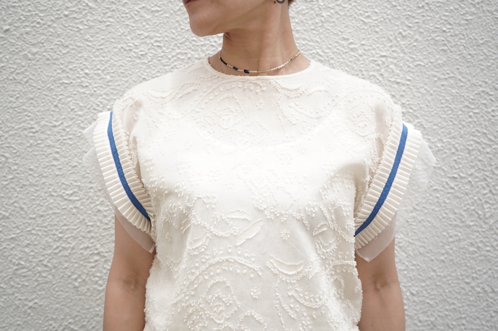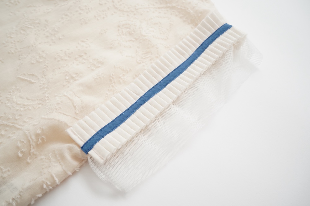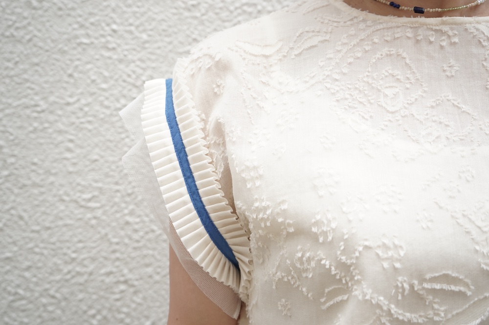 デザインはフレンチスリーブのプルオーバーブラウス。袖口にはコットンチュールとコットンプリーツのフリルにブルーのラインがアクセントになった、ウキウキと心が踊る装飾が施されています。ネックは後ろでリボンを結ぶ仕様です。コットンチュールとプリーツのフリルは裁ち切りになっています。このチュールなどの部分が二の腕にかかるようなデザインになっており、着てみると腕周りがすっきりとした印象に。透け感もあり見た目にも涼やかで、ワンツーコーデがパッと華やかになる素敵なブラウスです。