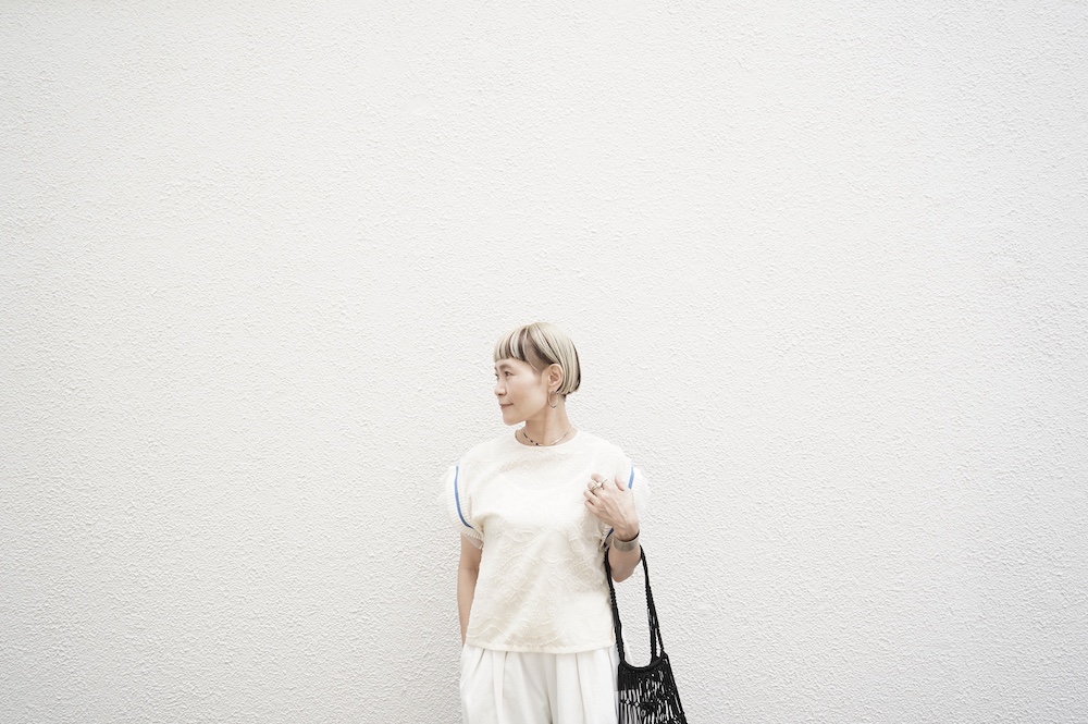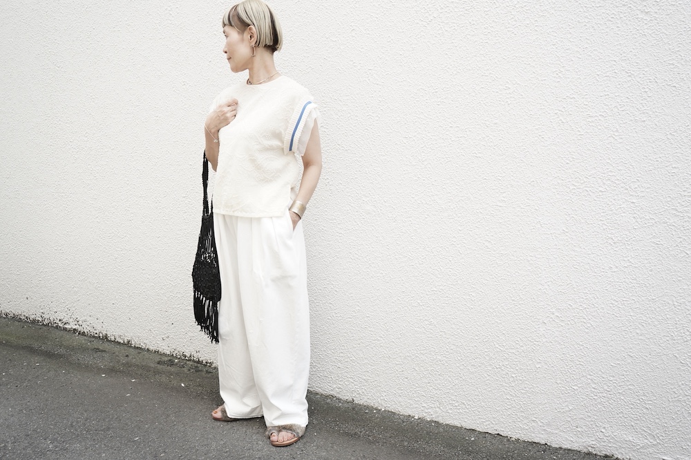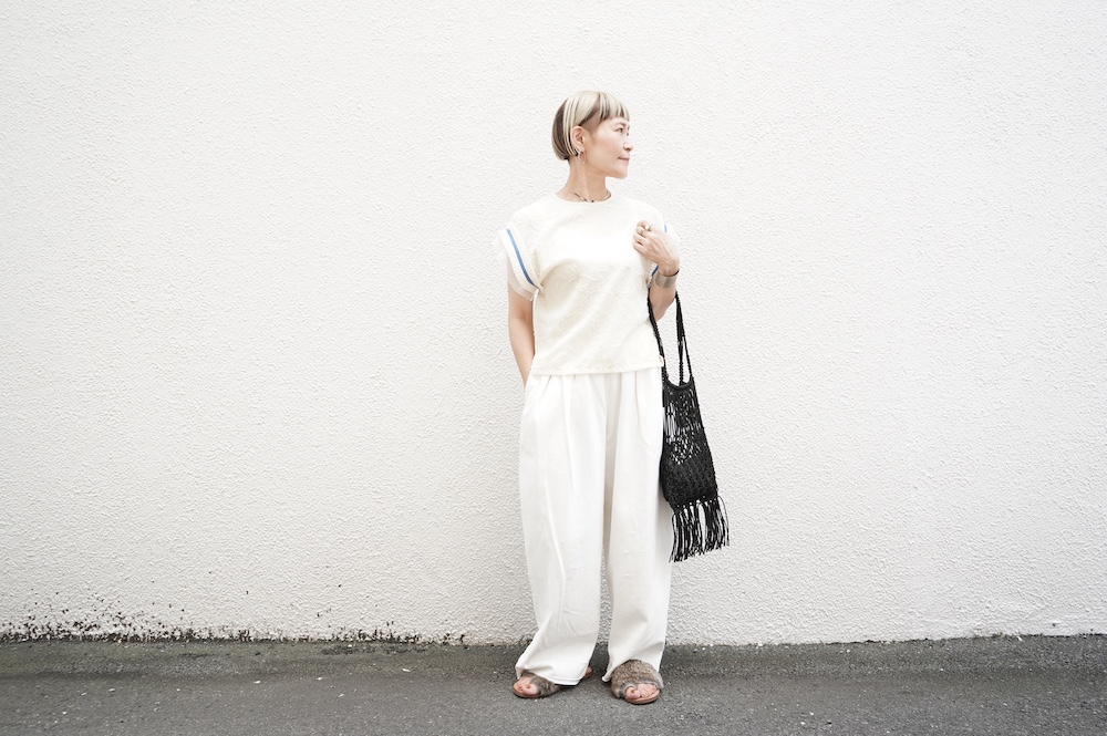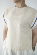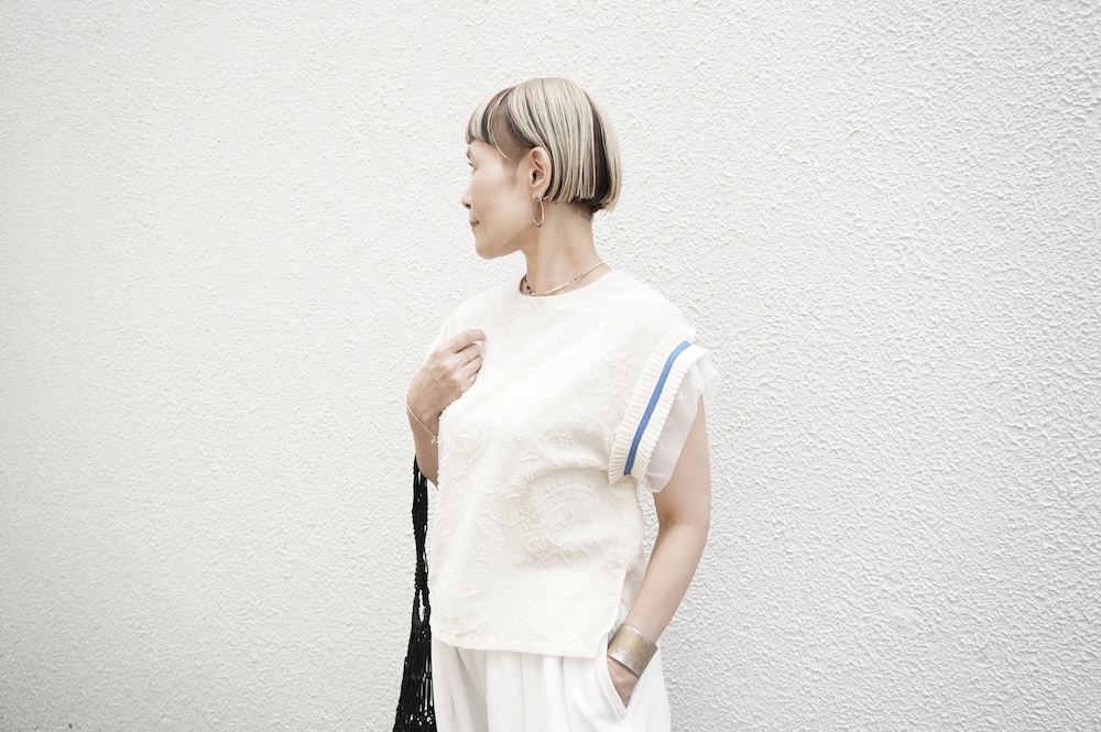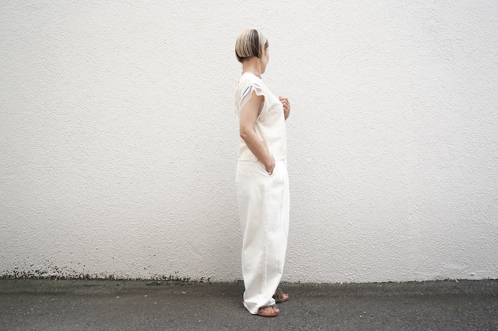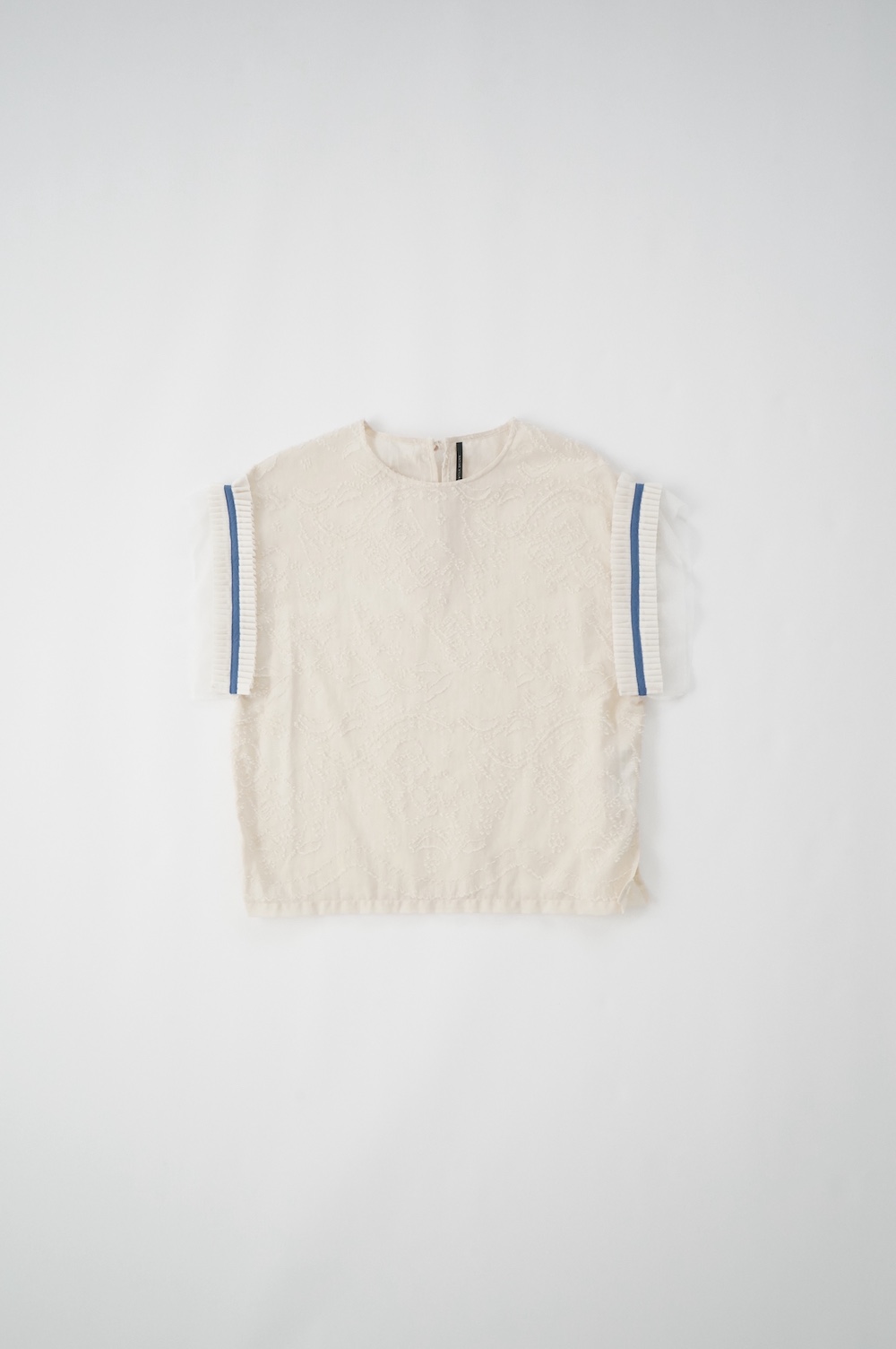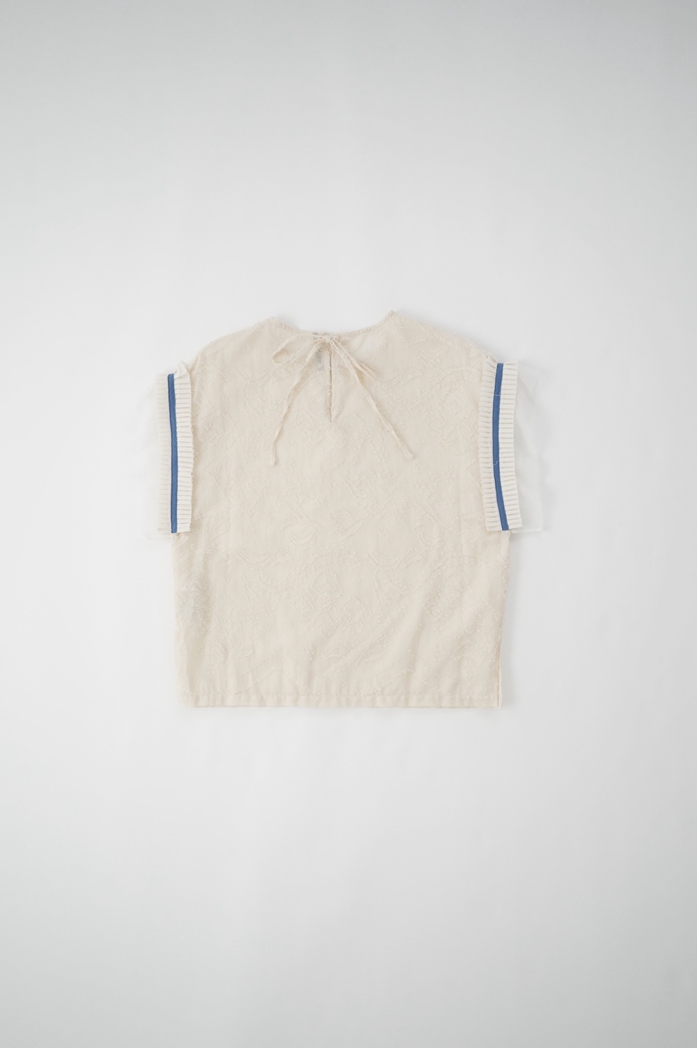 デザインはフレンチスリーブのプルオーバーブラウス。袖口にはコットンチュールとコットンプリーツのフリルにブルーのラインがアクセントになった、ウキウキと心が踊る装飾が施されています。ネックは後ろでリボンを結ぶ仕様です。コットンチュールとプリーツのフリルは裁ち切りになっています。このチュールなどの部分が二の腕にかかるようなデザインになっており、着てみると腕周りがすっきりとした印象に。透け感もあり見た目にも涼やかで、ワンツーコーデがパッと華やかになる素敵なブラウスです。