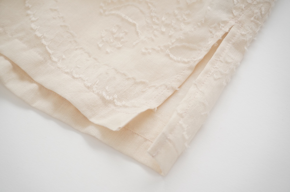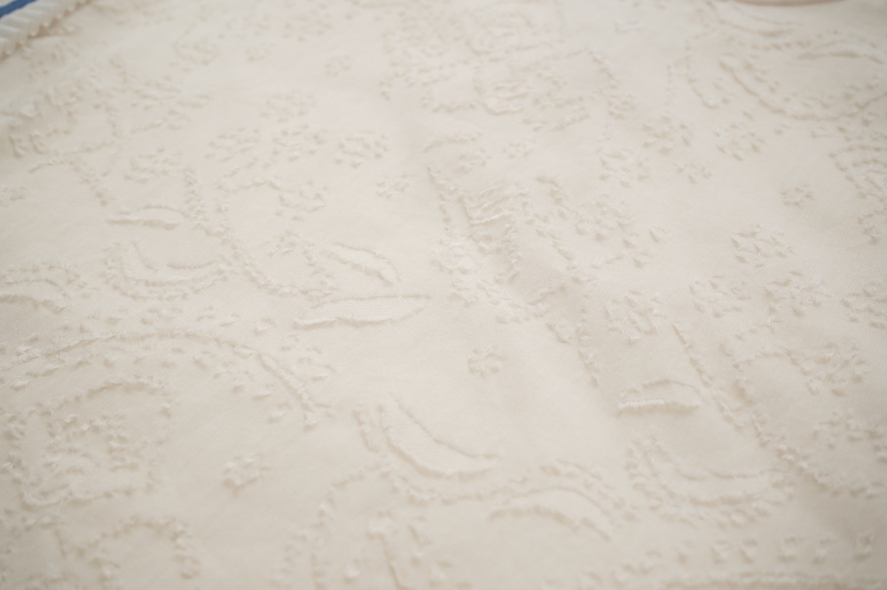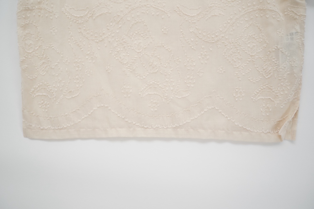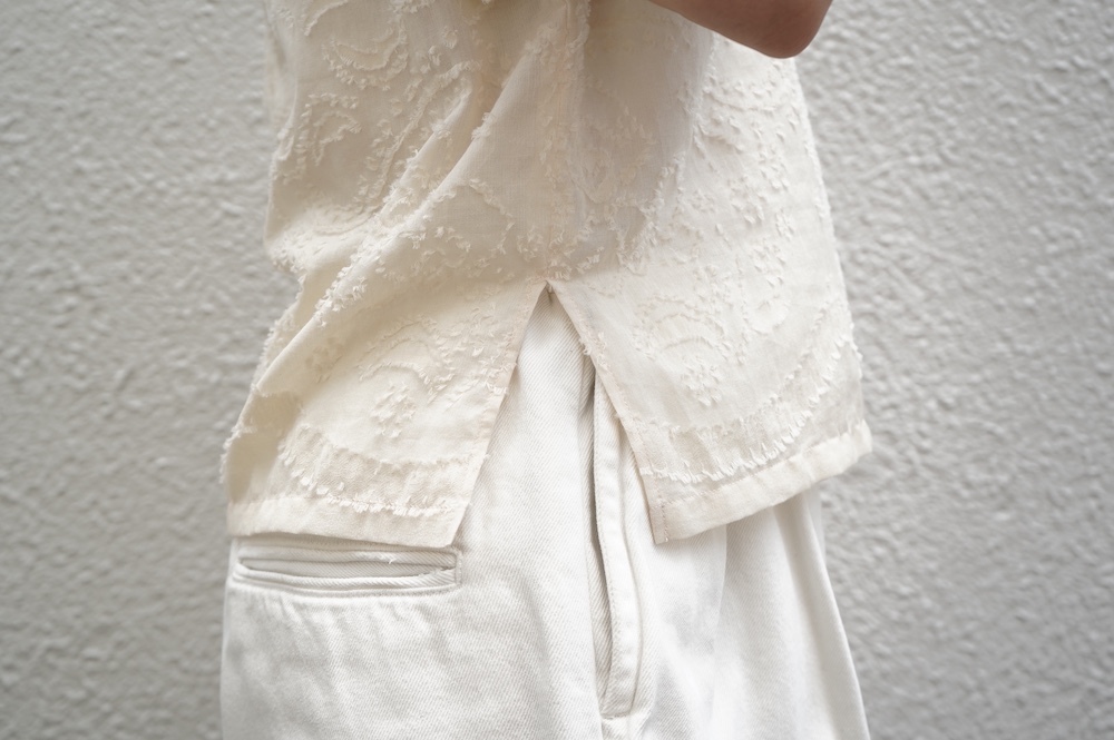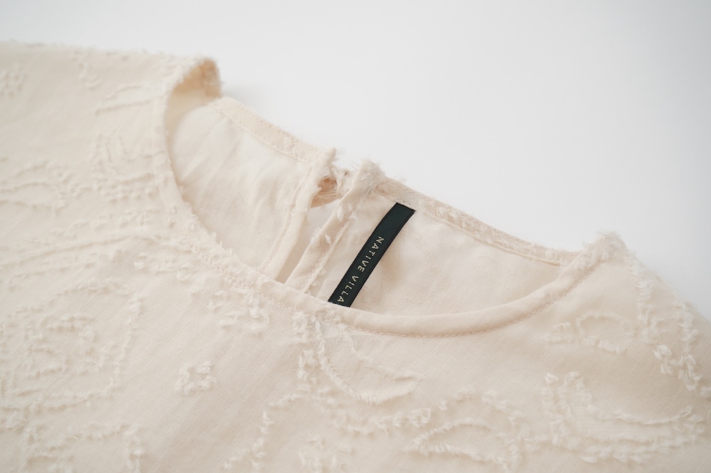 "ネイティブビレッジ"のブラウス。オリジナルで柄を書き起こした、コットンのカットジャガード生地を使用。カットジャガードのモケモケとした立体感のある柄がとても表情豊かで、薄手で柔らかなガーゼのような素材です。