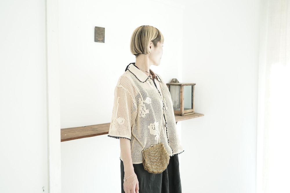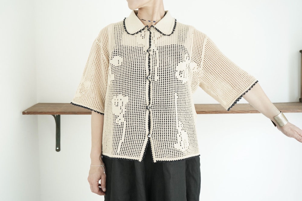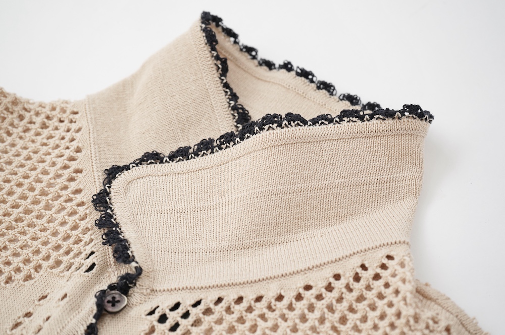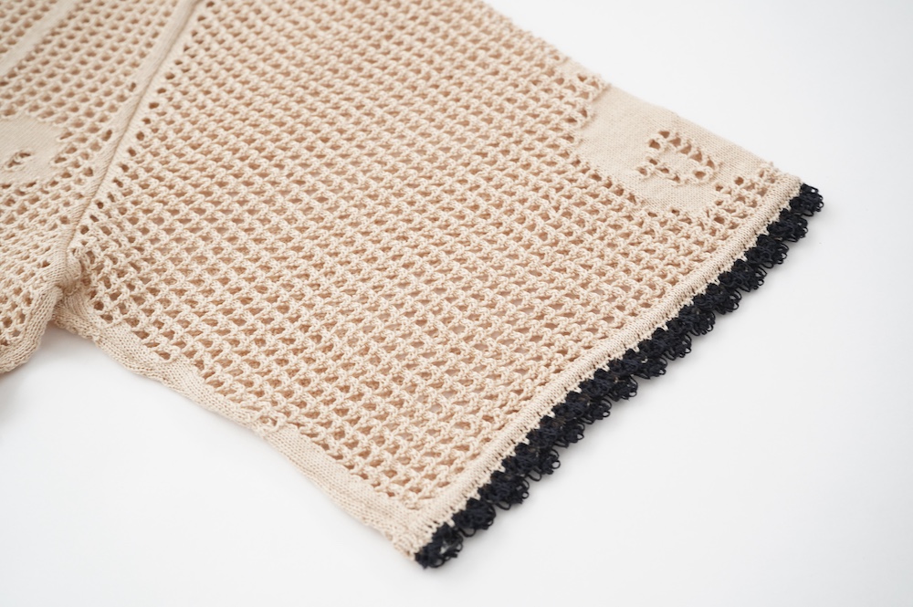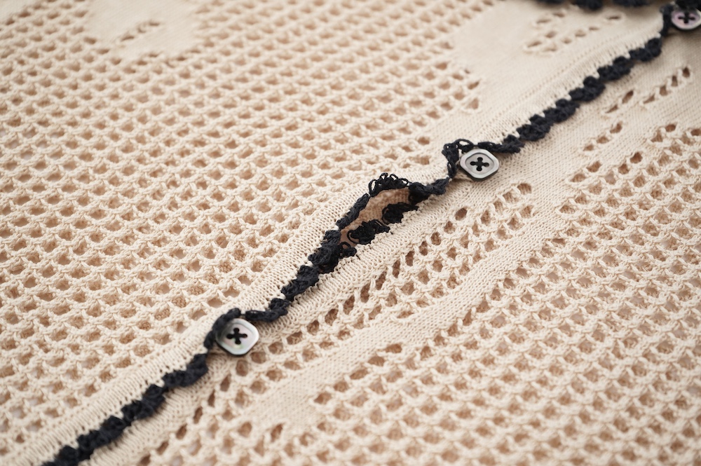 デザインは方眼メッシュ編みのニットポロシャツ。メッシュ編みなので透け感があり、見た目にも涼しげな印象に。さりげなくお花のモチーフ柄があしらわれているのも可愛らしい。裾や襟、袖口の端に配色でレース編みがあしらわれているのもアクセントになっています。ポロシャツといってもスポーティになりすぎず、前開きなのでカーディガンのようにも楽しめる女性らしいニットポロシャツです。
