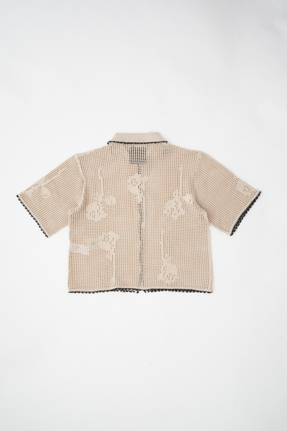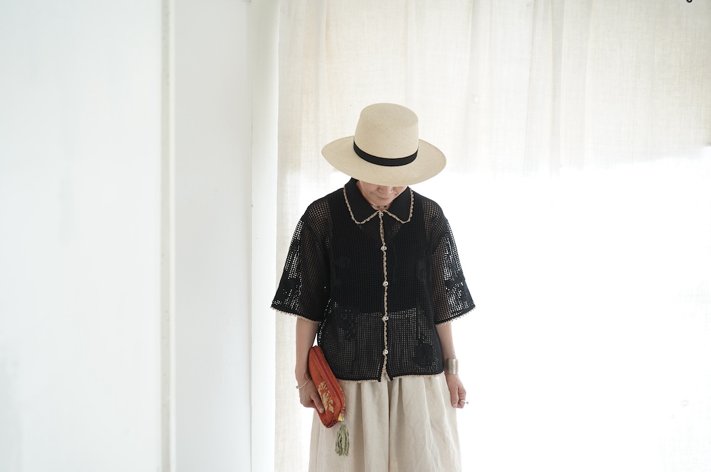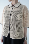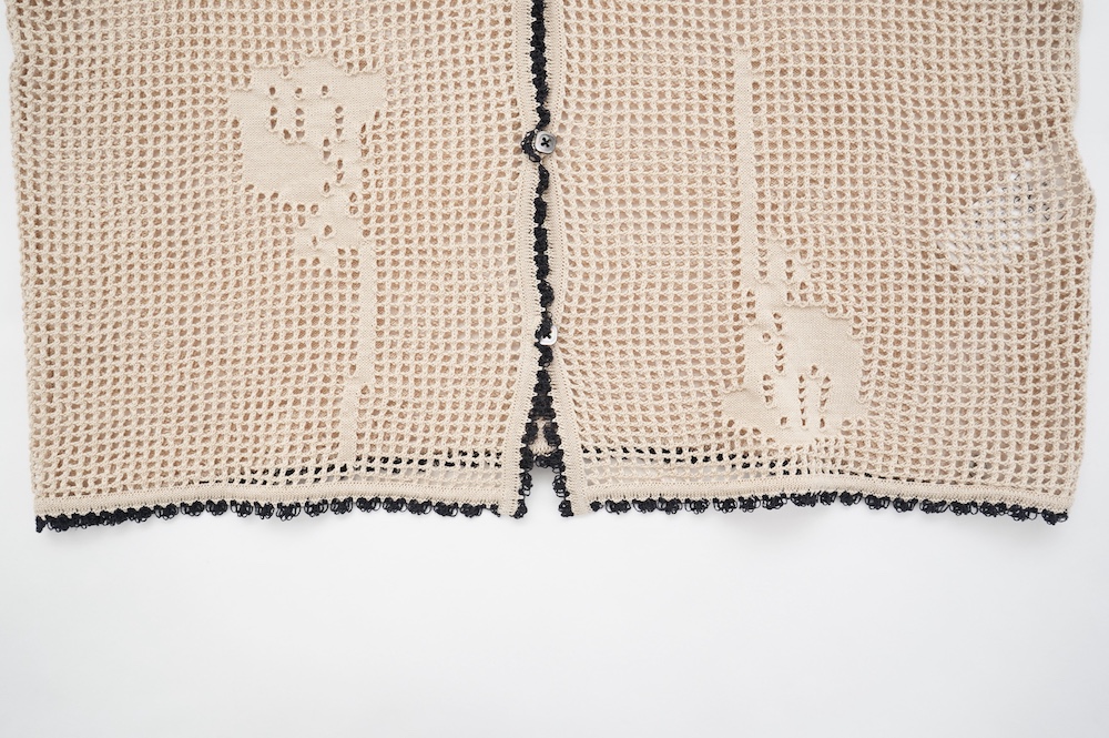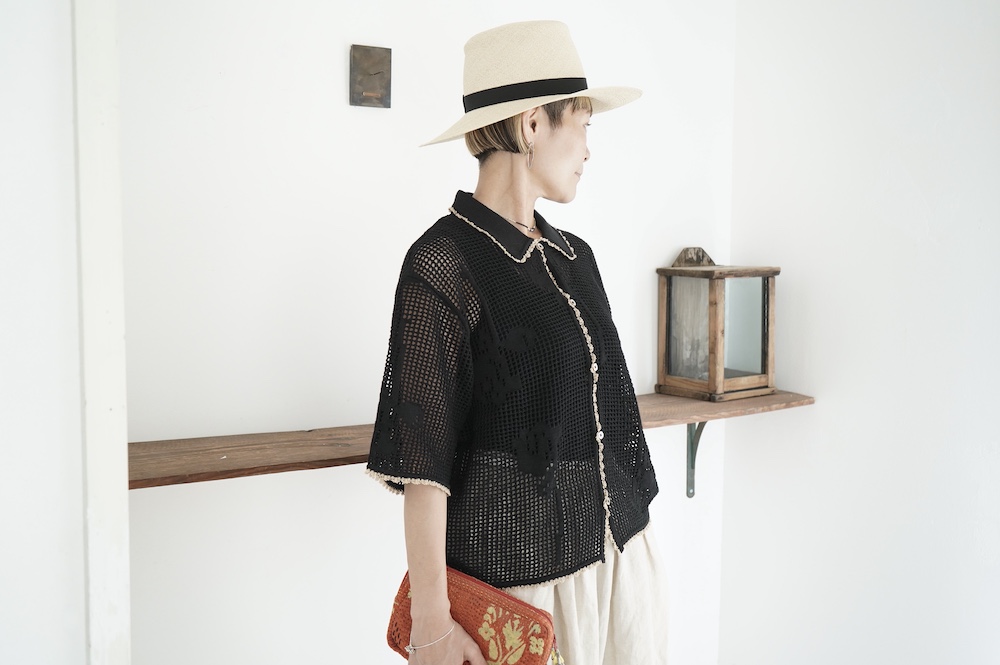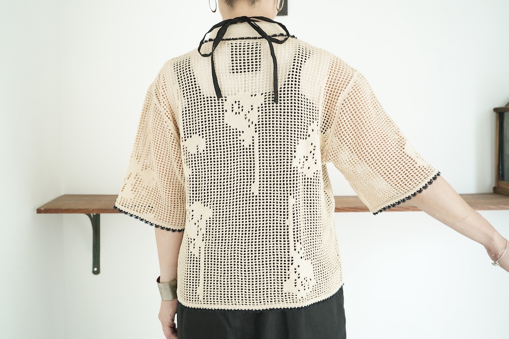 デザインは方眼メッシュ編みのニットポロシャツ。メッシュ編みなので透け感があり、見た目にも涼しげな印象に。さりげなくお花のモチーフ柄があしらわれているのも可愛らしい。裾や襟、袖口の端に配色でレース編みがあしらわれているのもアクセントになっています。ポロシャツといってもスポーティになりすぎず、前開きなのでカーディガンのようにも楽しめる女性らしいニットポロシャツです。