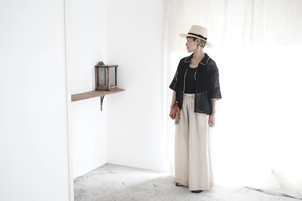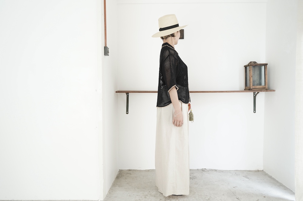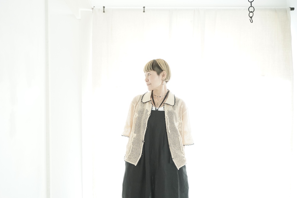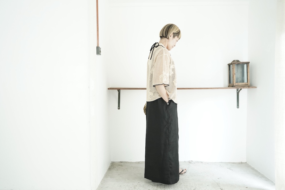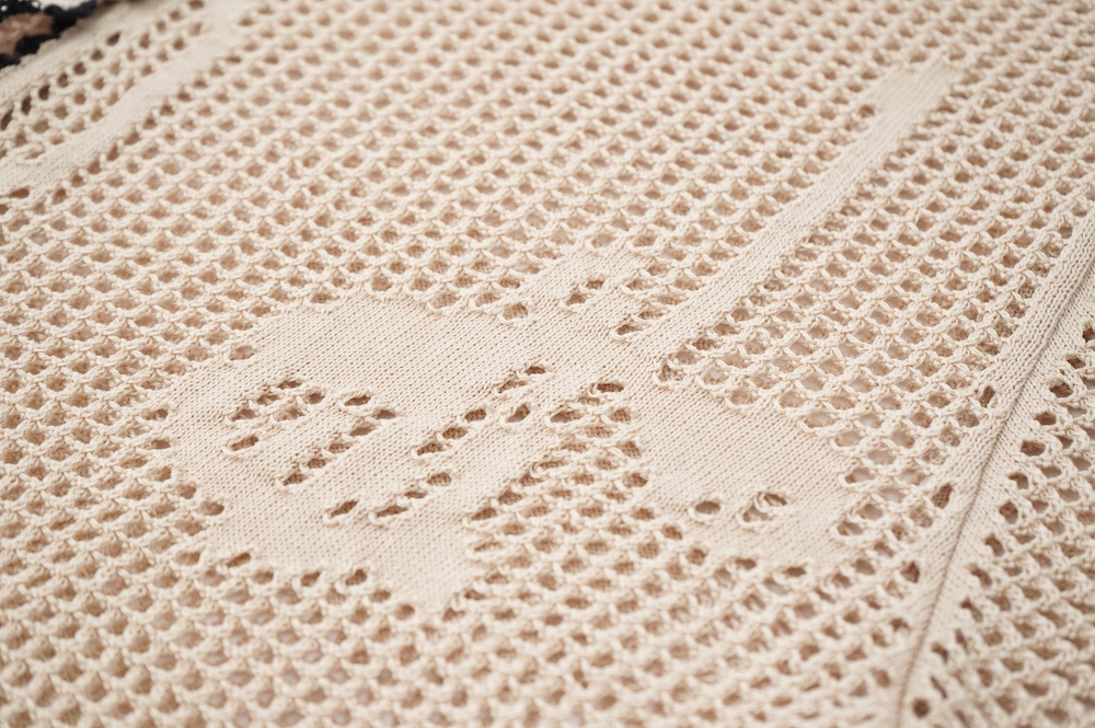 メッシュと天竺編みの切り替えで花モチーフを表現