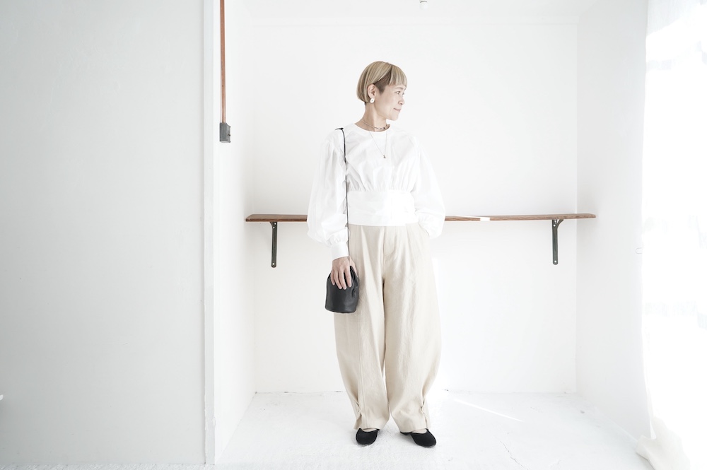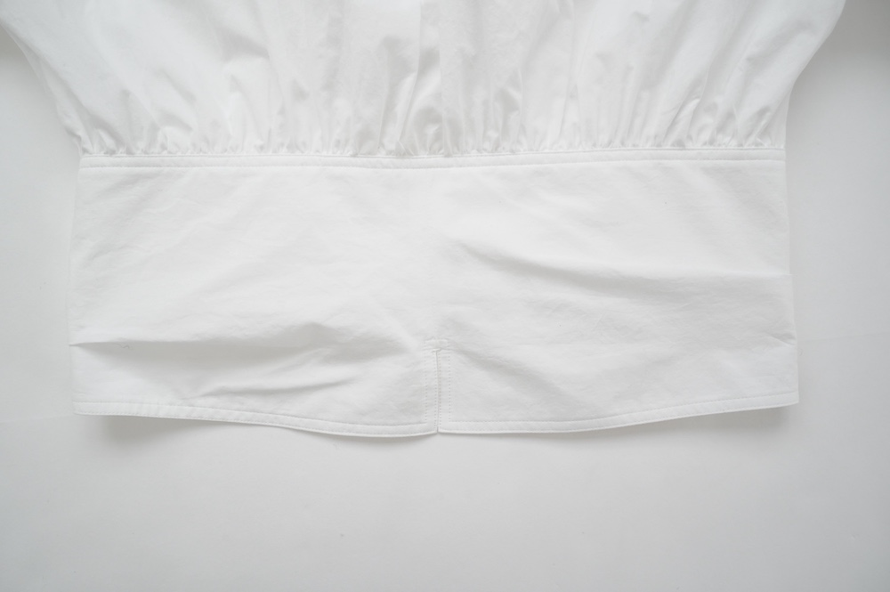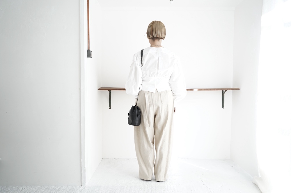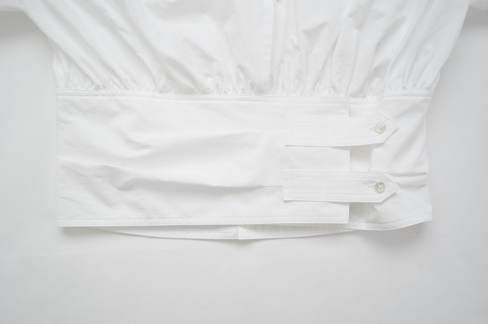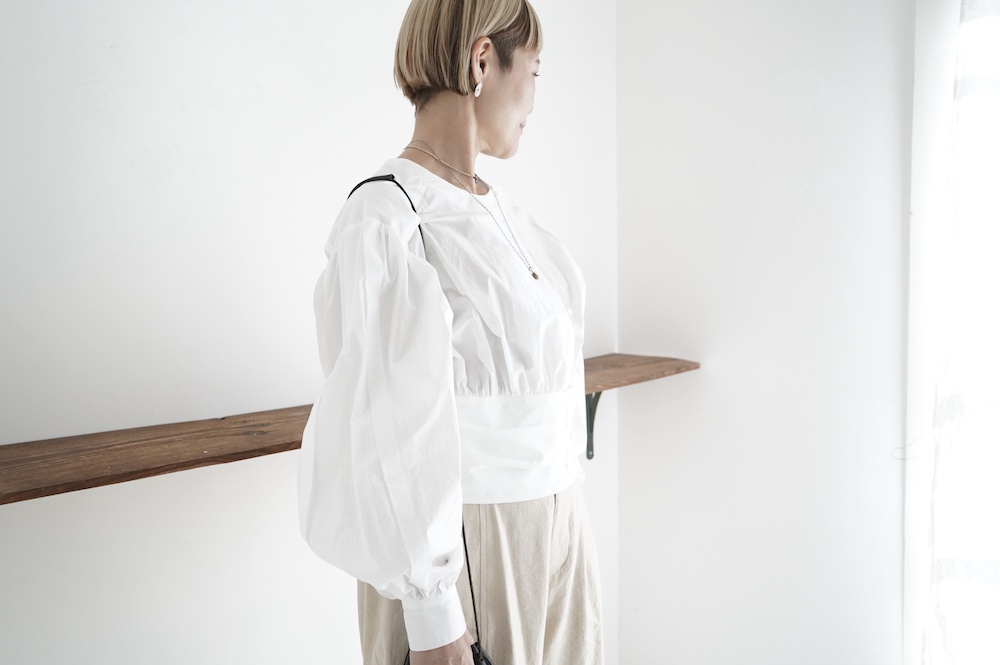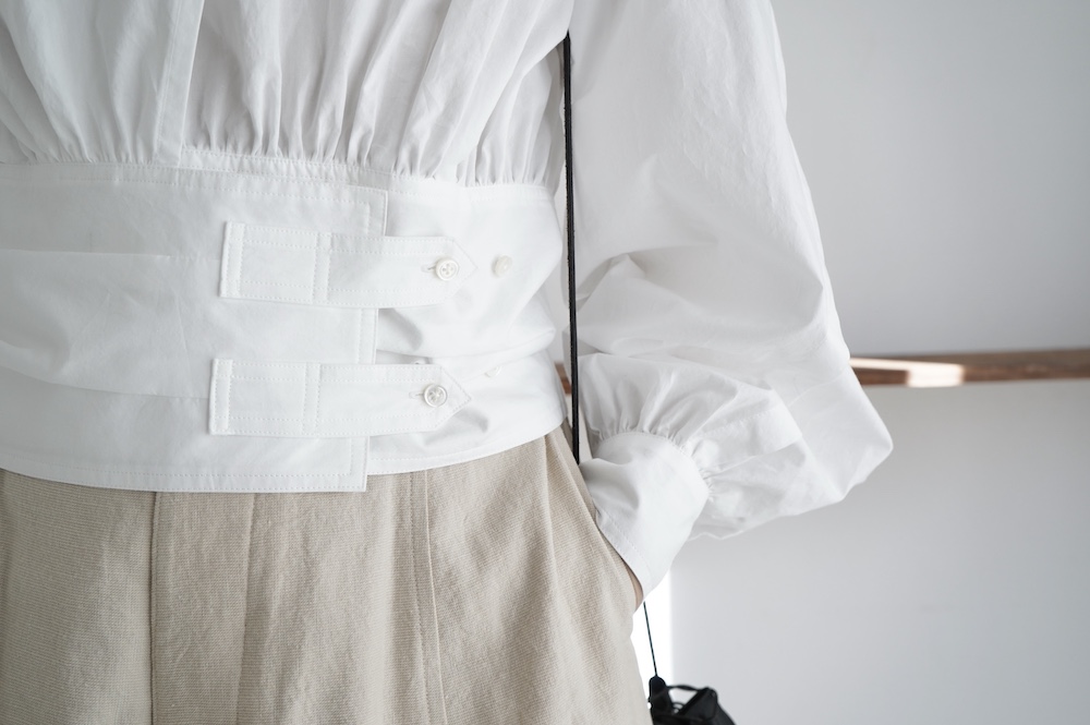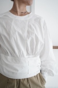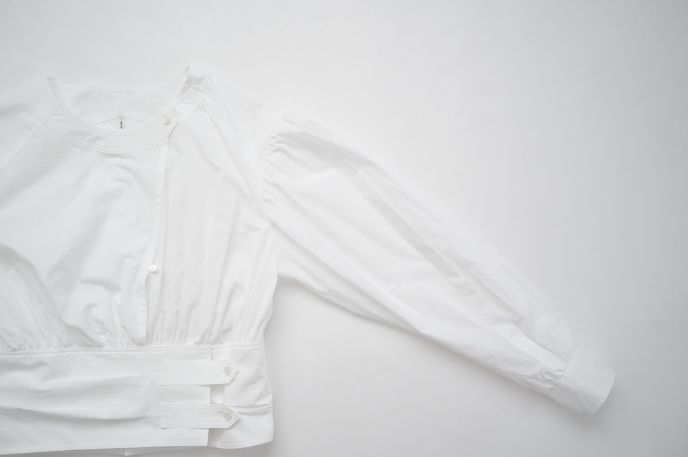 デザインはウエストのベルトが特徴的なショート丈のブラウス。ウエストを絞ったベルトのデザインとふんわりとギャザーが施された袖になっており、クラシカルな雰囲気が漂います。ウエスト部分はボタンで2段階調節できます。ショート丈なのでギャザースカートやワイドパンツなど、ボリュームのあるボトムと好相性なブラウスです。