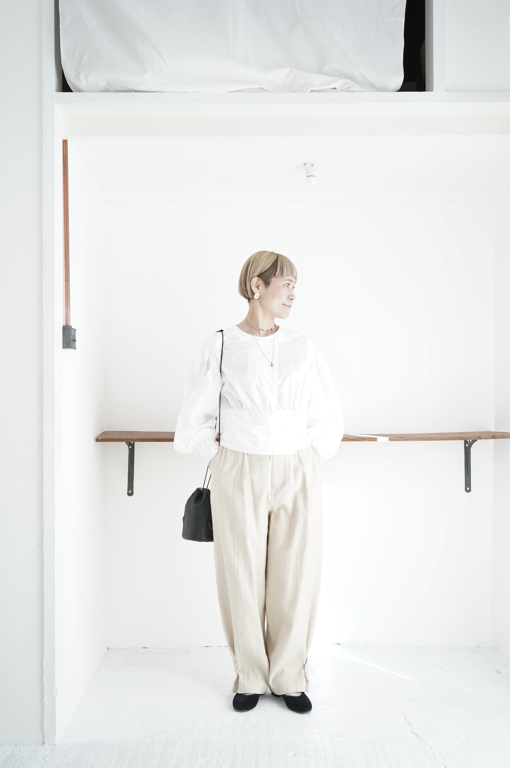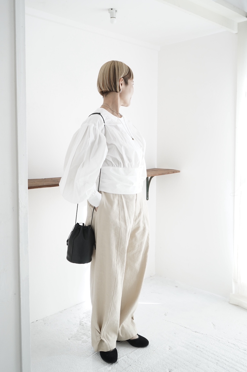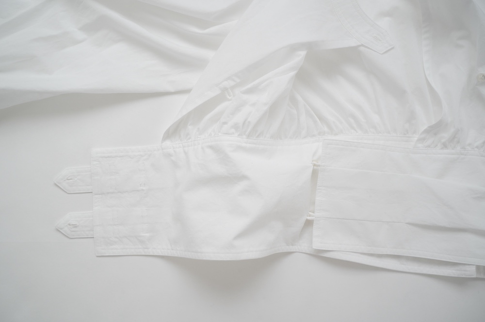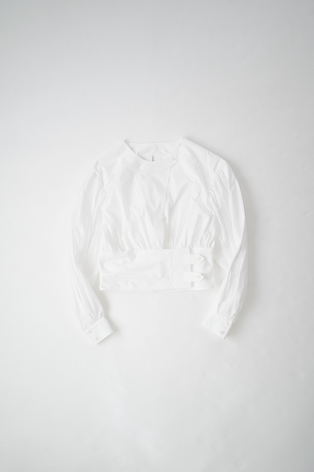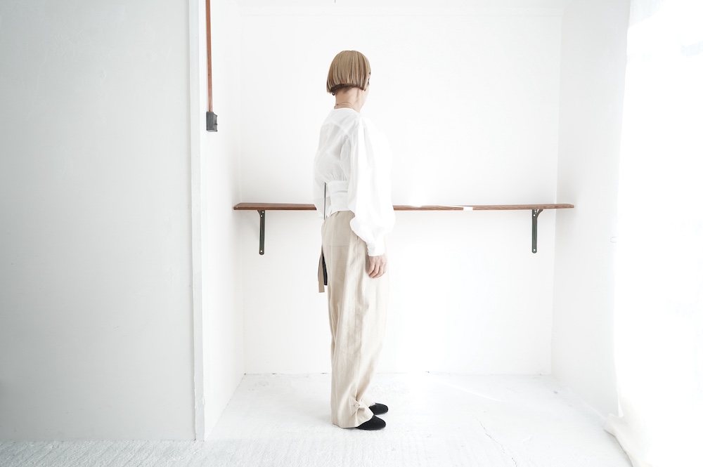 デザインはウエストのベルトが特徴的なショート丈のブラウス。ウエストを絞ったベルトのデザインとふんわりとギャザーが施された袖になっており、クラシカルな雰囲気が漂います。ウエスト部分はボタンで2段階調節できます。ショート丈なのでギャザースカートやワイドパンツなど、ボリュームのあるボトムと好相性なブラウスです。