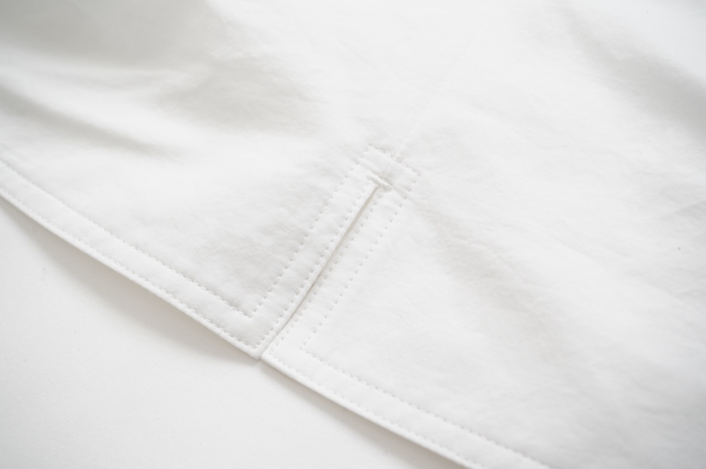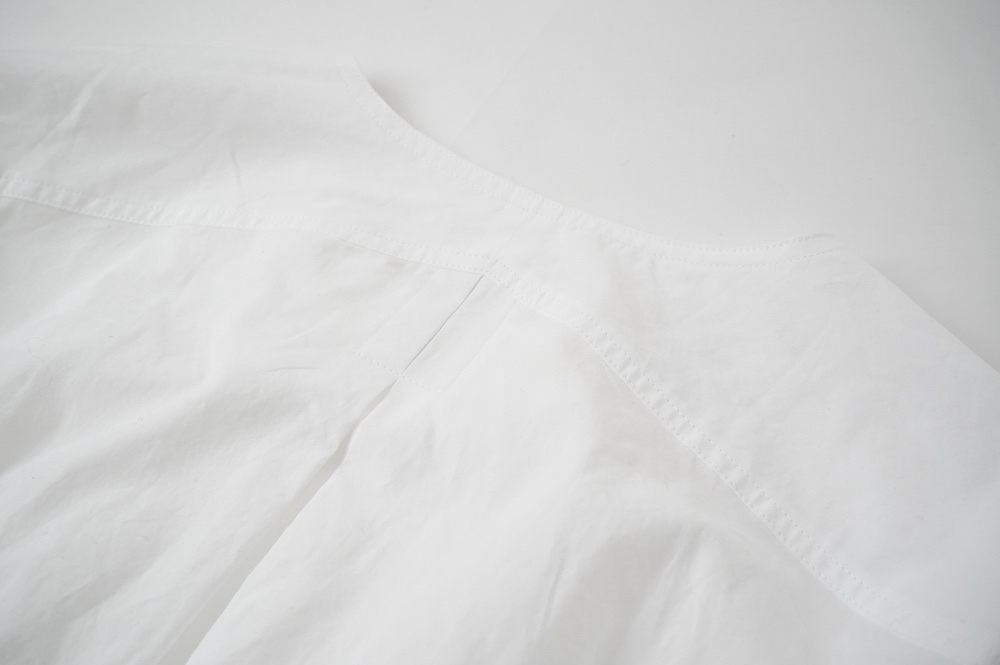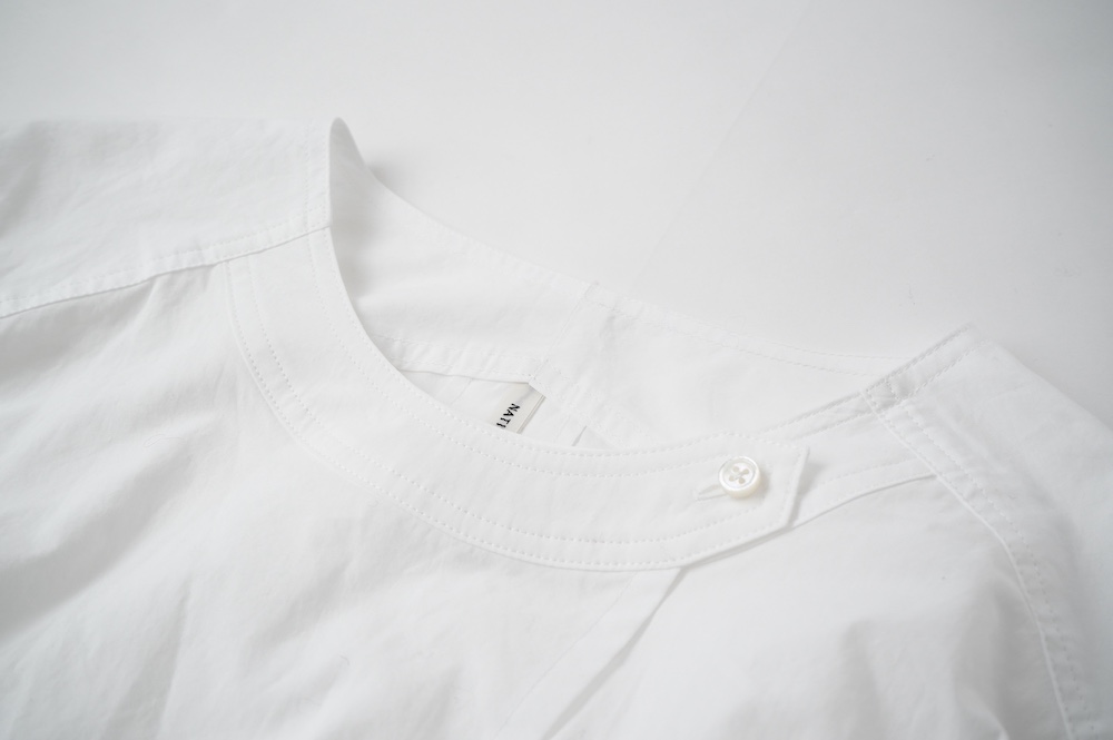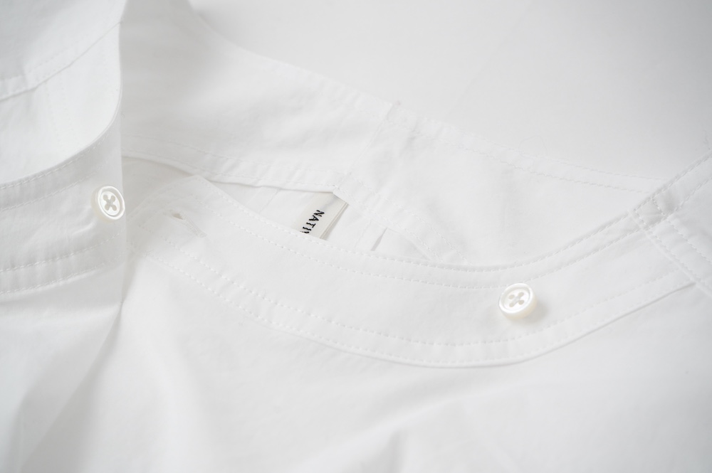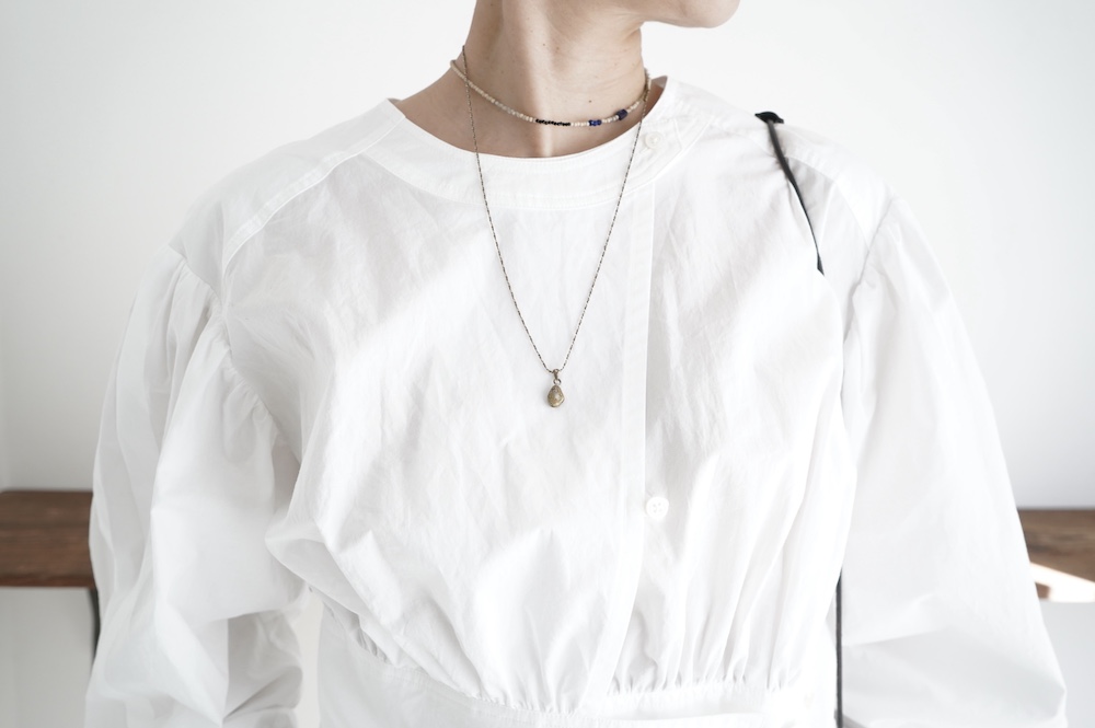 "ネイティブビレッジ"のブラウス。80番手と70番手の単糸で織りあげたオリジナルコットン生地を使用。程よい柔らかさと強さを兼ね備えています。ほのかに透け感がある軽やかな素材です。