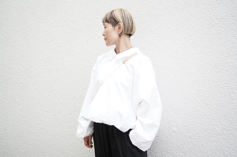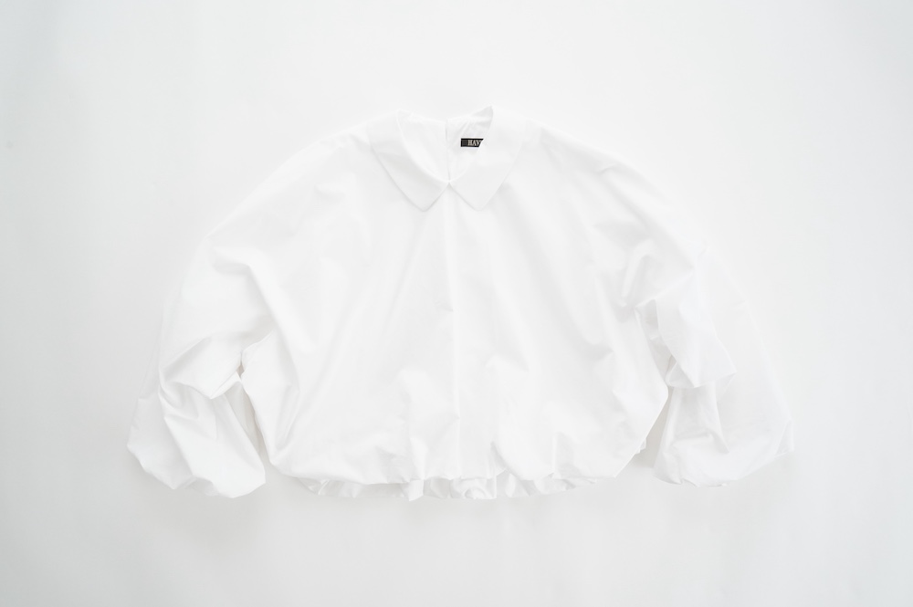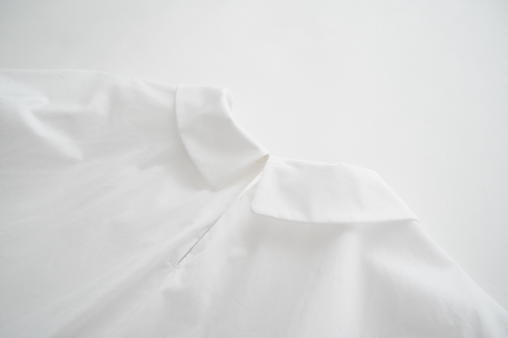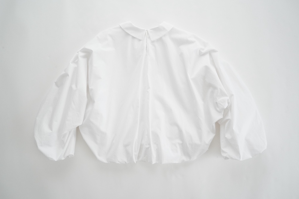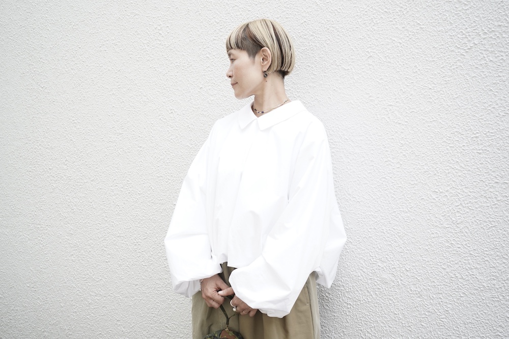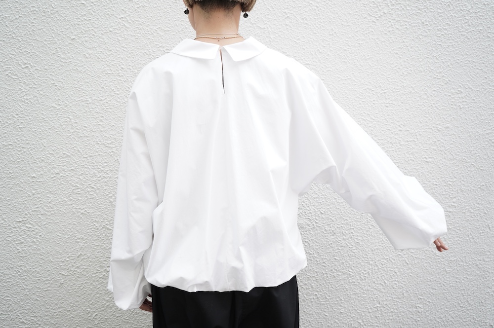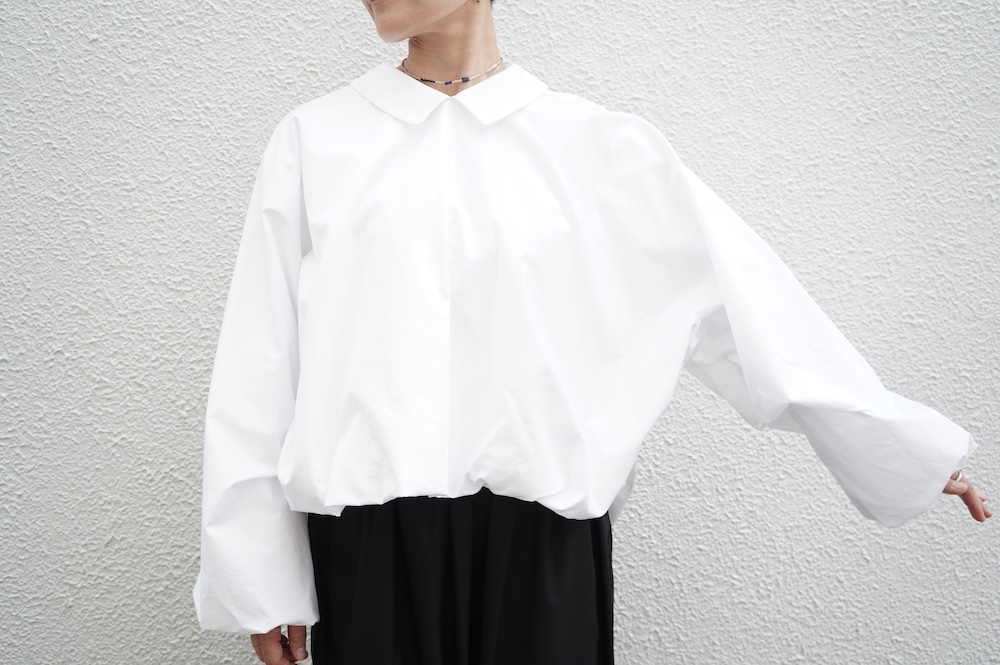 デザインは、台襟無しのラウンドカラーのふんわりとしたシルエットのプルオーバーシャツ。無双仕立てのように同素材の裏地がついていて、表側を大きくゆったりと生地を使用し、袖口と裾でギャザーを寄せることでふんわりとしたシルエットを作っています。白でも透け感を気にせずに着ていただけます。一枚で存在感のあるシルエットが素敵なシャツです。