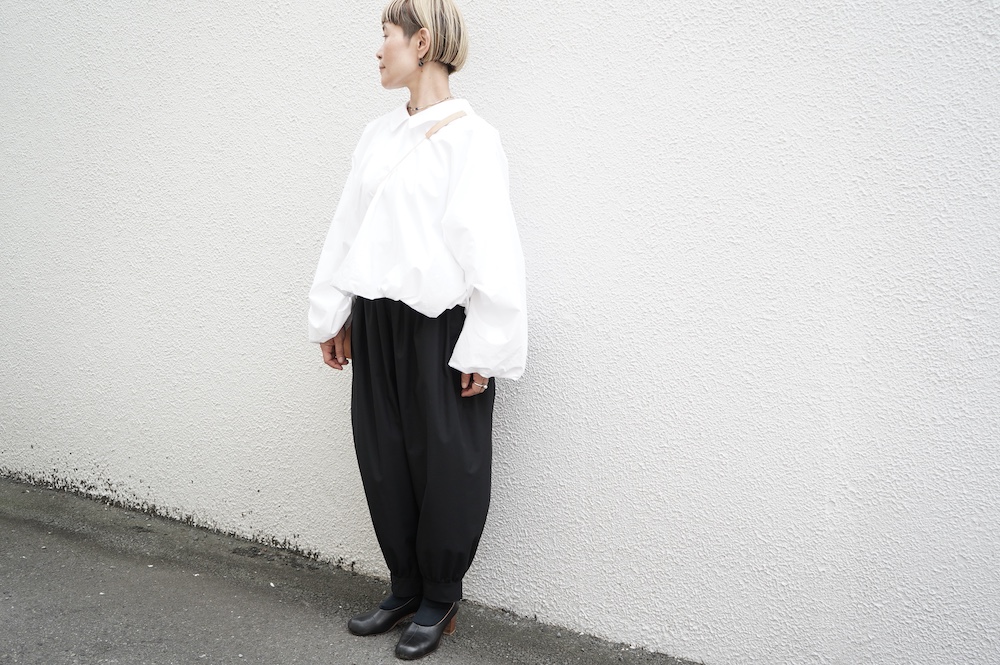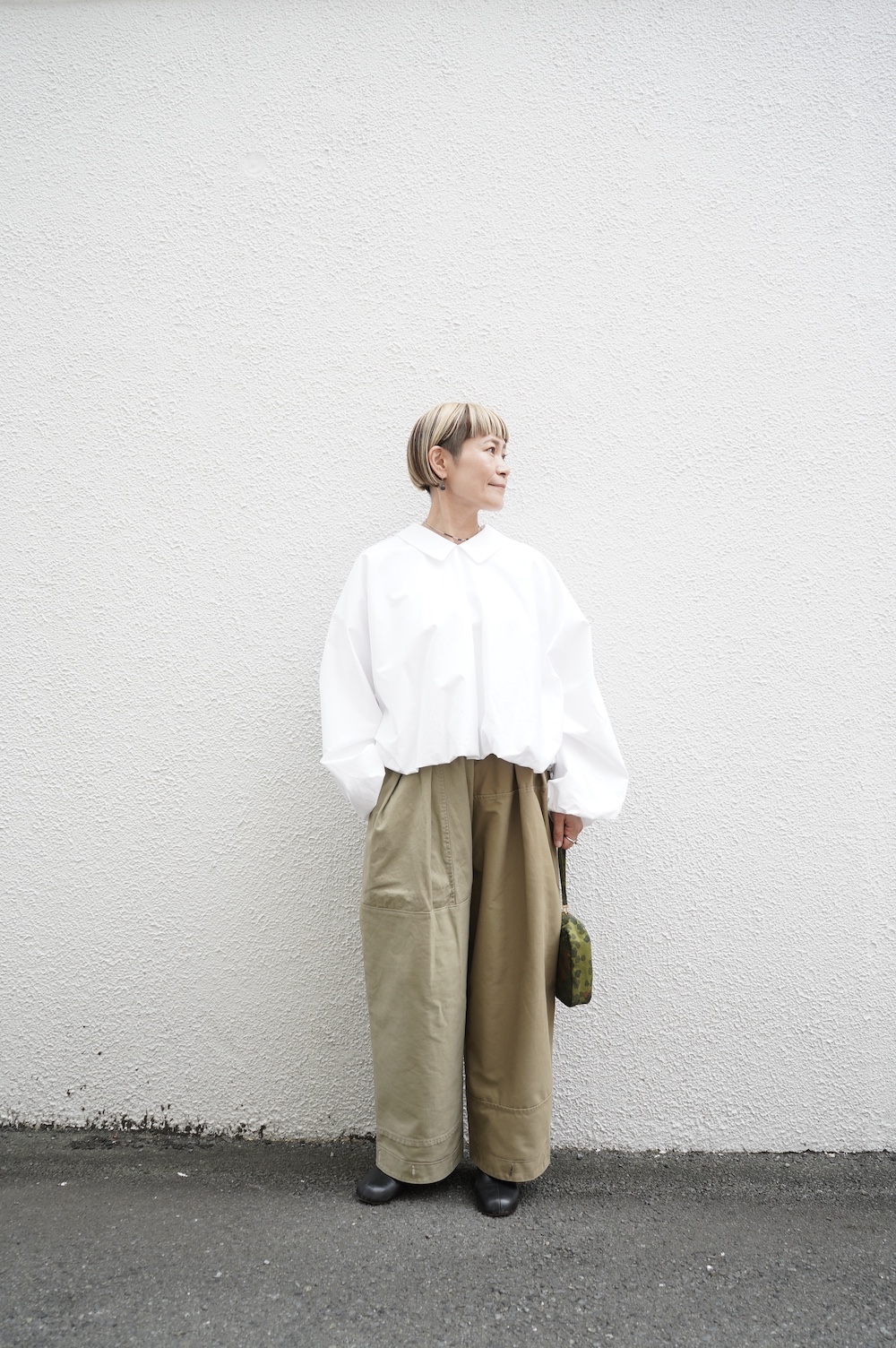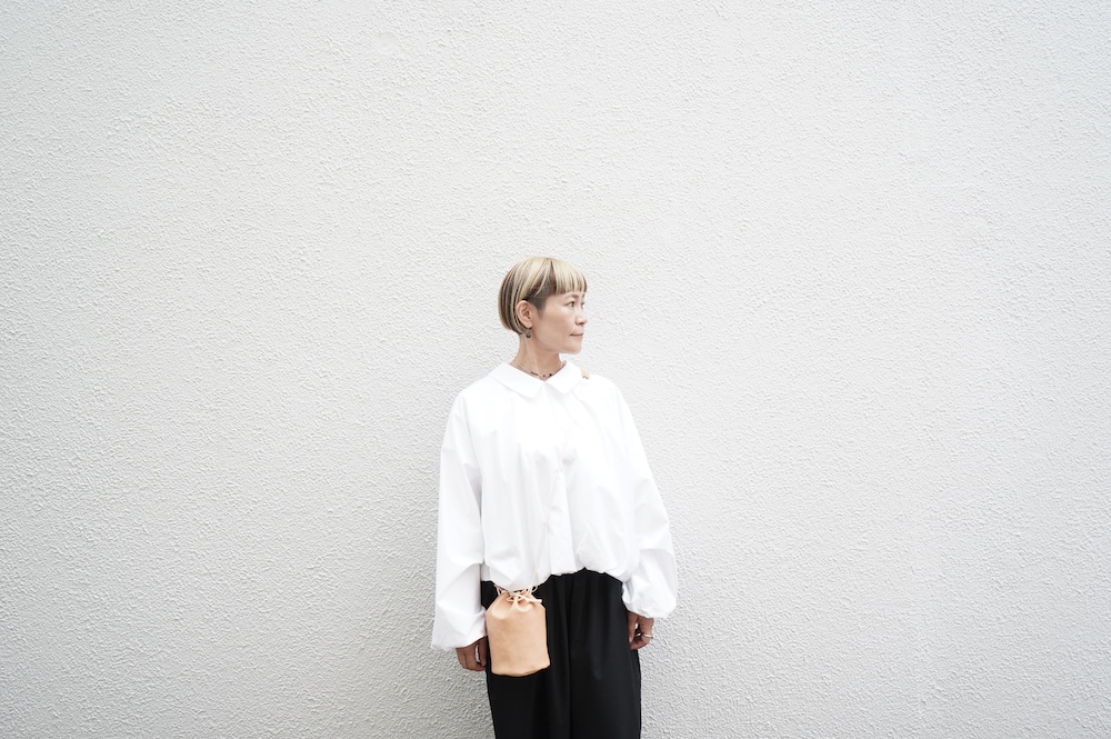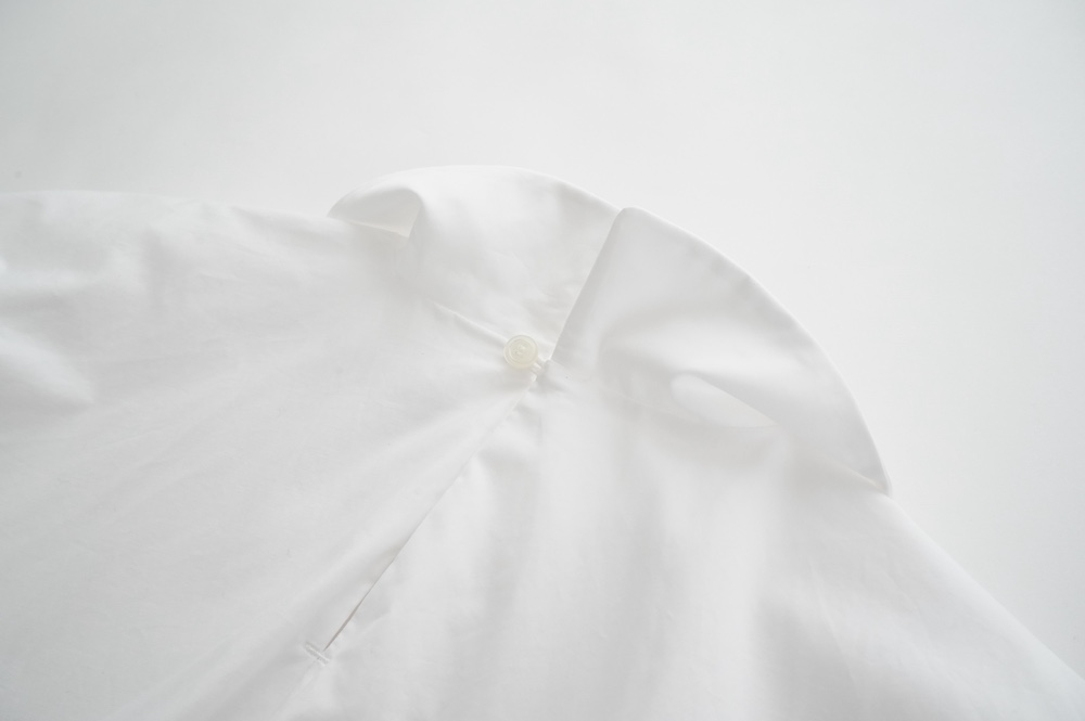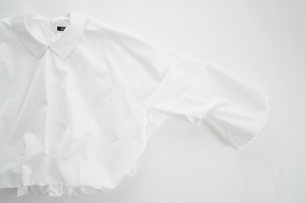 デザインは、台襟無しのラウンドカラーのふんわりとしたシルエットのプルオーバーシャツ。無双仕立てのように同素材の裏地がついていて、表側を大きくゆったりと生地を使用し、袖口と裾でギャザーを寄せることでふんわりとしたシルエットを作っています。白でも透け感を気にせずに着ていただけます。一枚で存在感のあるシルエットが素敵なシャツです。