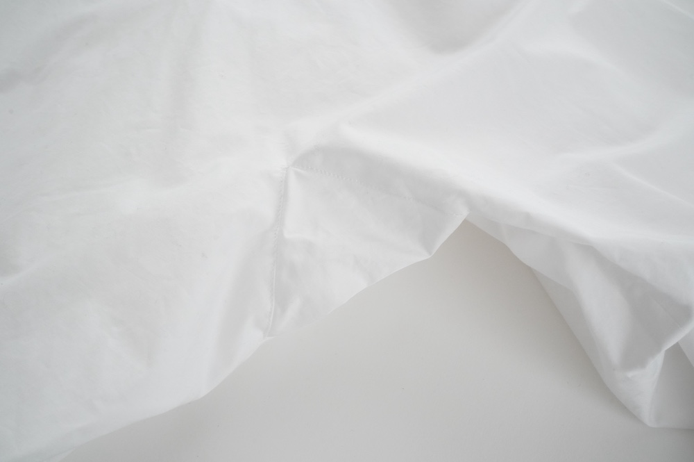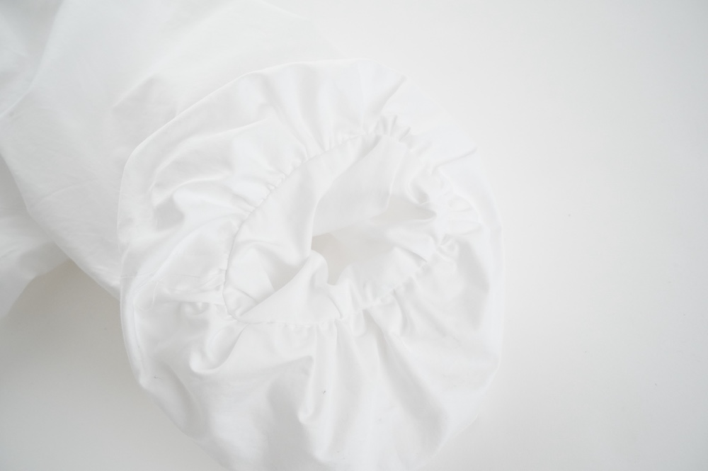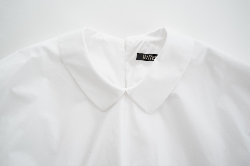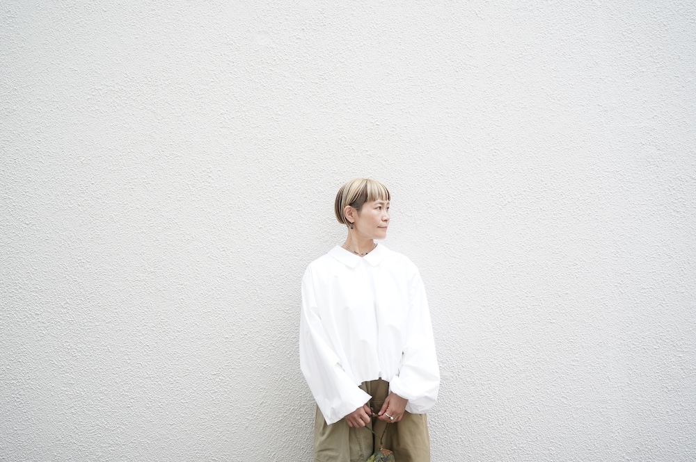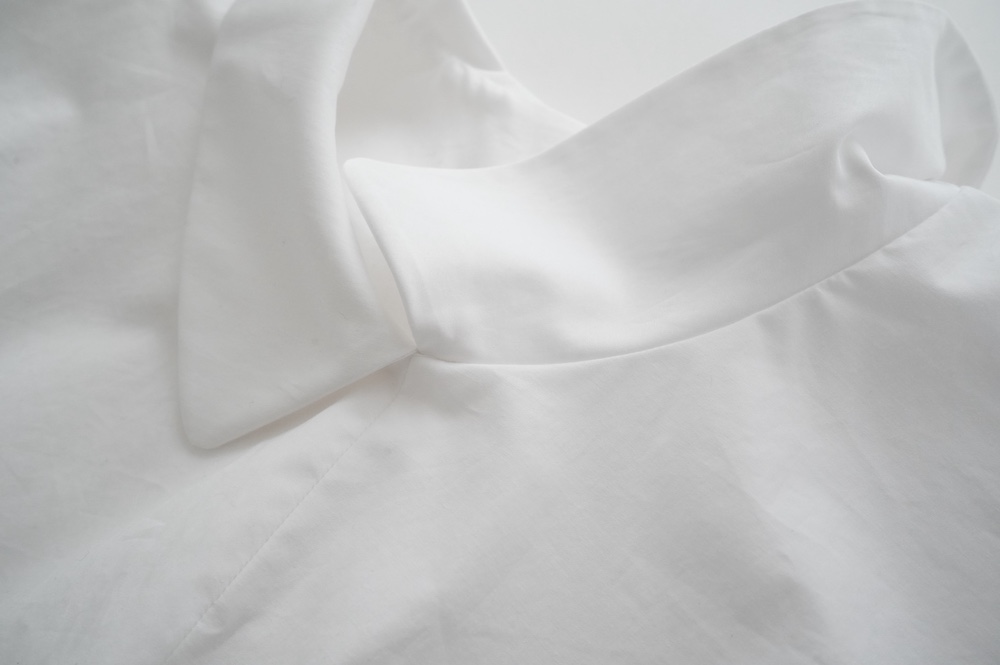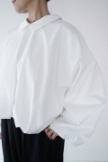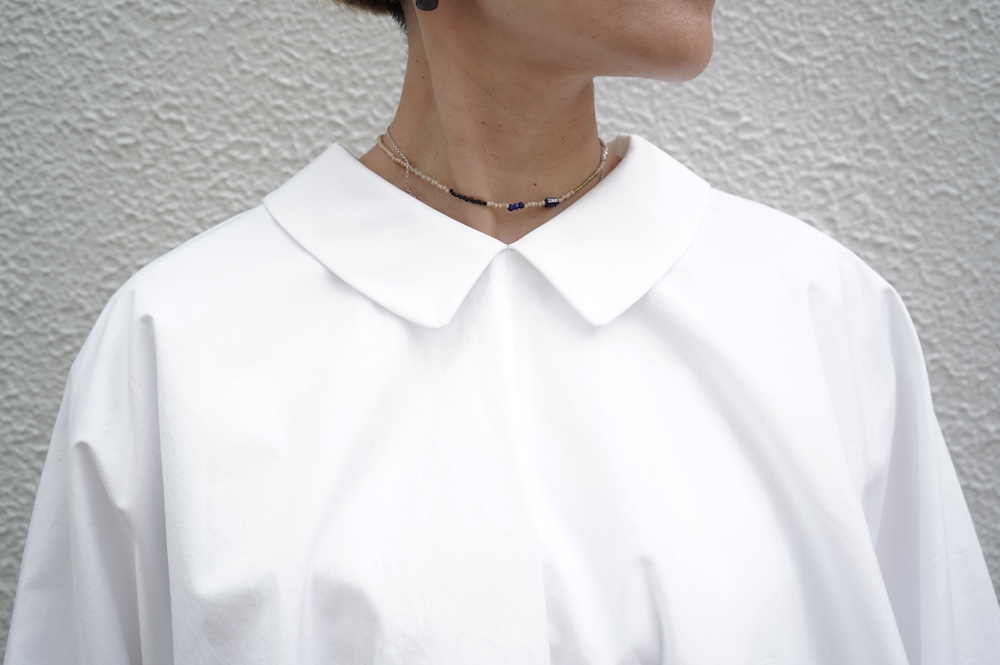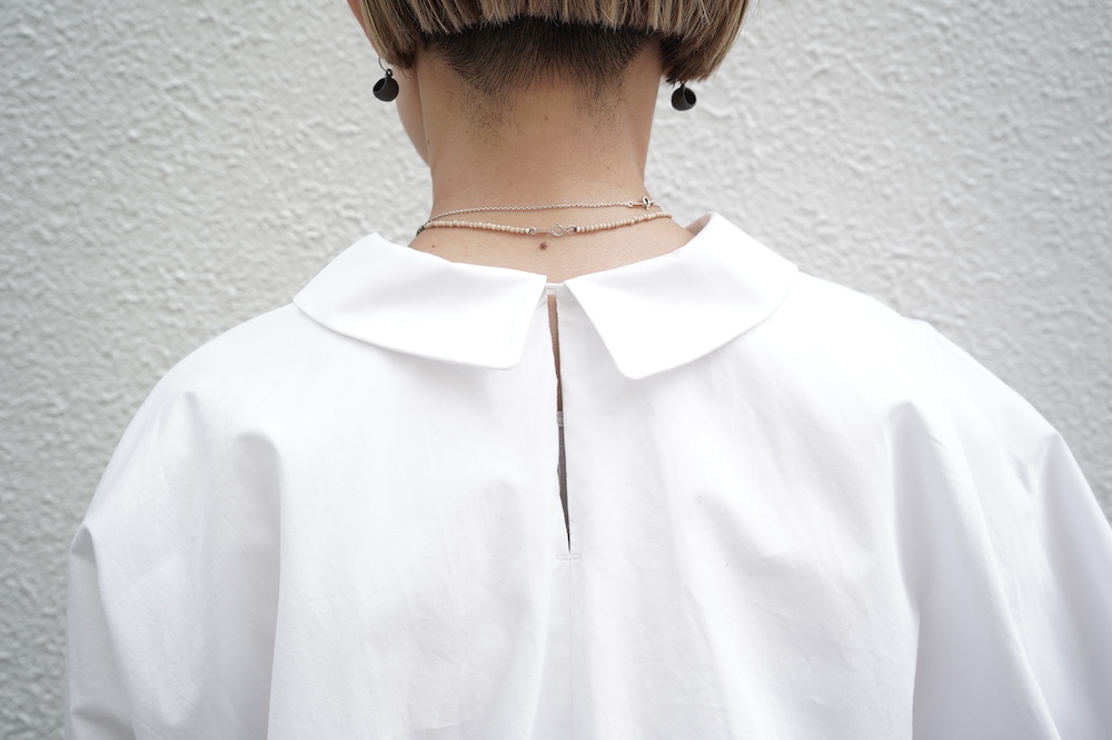 デザインは、台襟無しのラウンドカラーのふんわりとしたシルエットのプルオーバーシャツ。無双仕立てのように同素材の裏地がついていて、表側を大きくゆったりと生地を使用し、袖口と裾でギャザーを寄せることでふんわりとしたシルエットを作っています。白でも透け感を気にせずに着ていただけます。一枚で存在感のあるシルエットが素敵なシャツです。