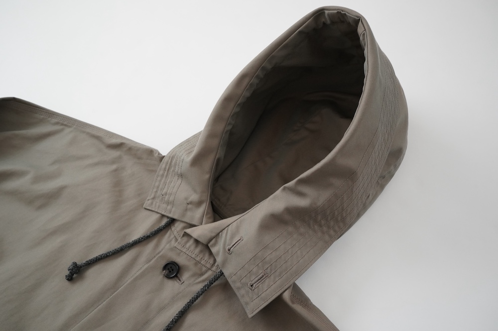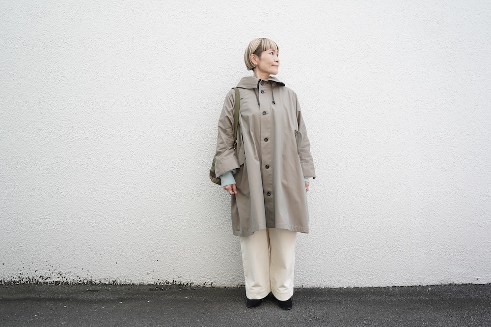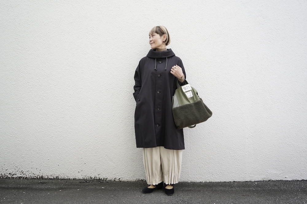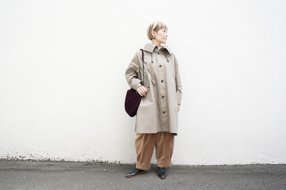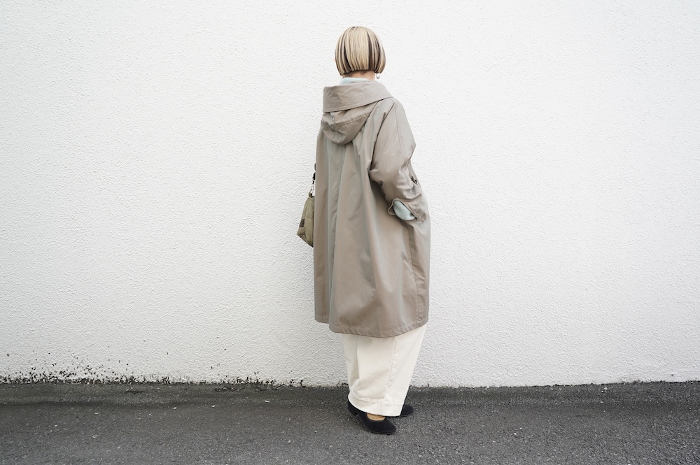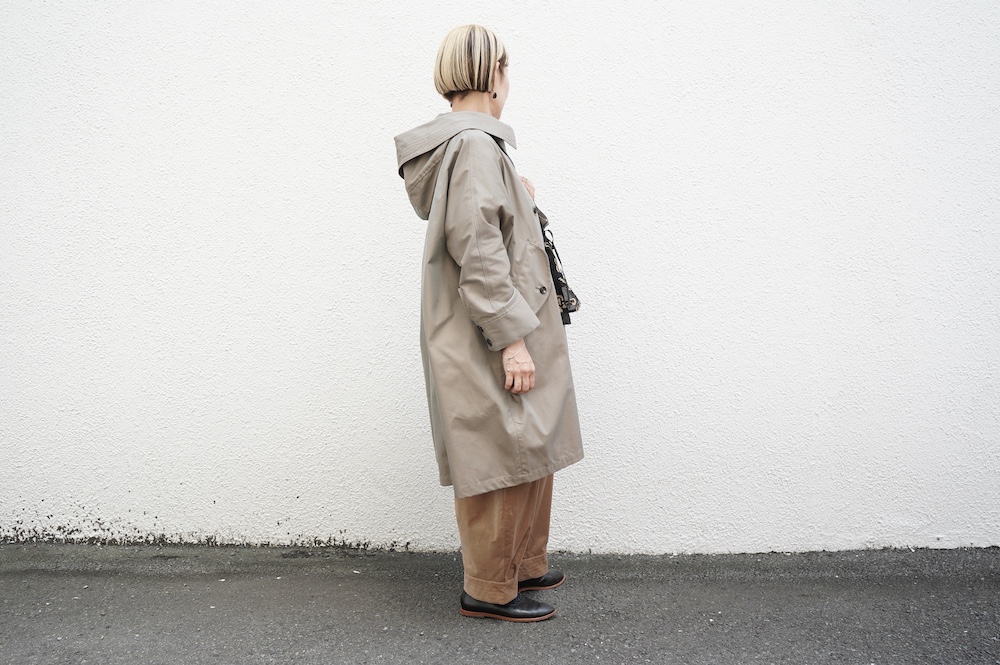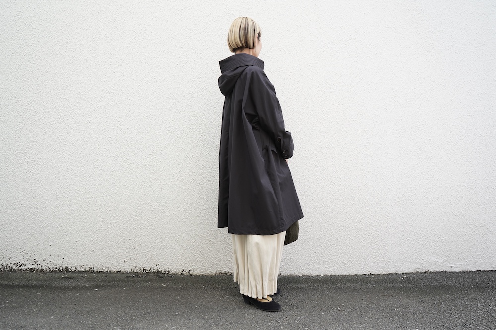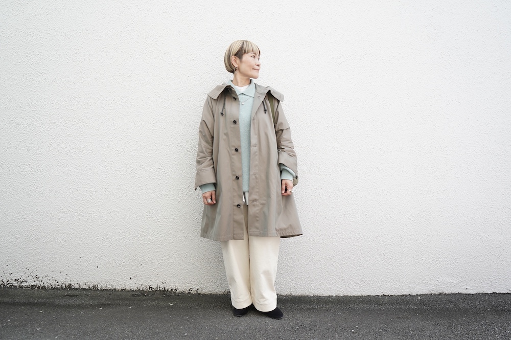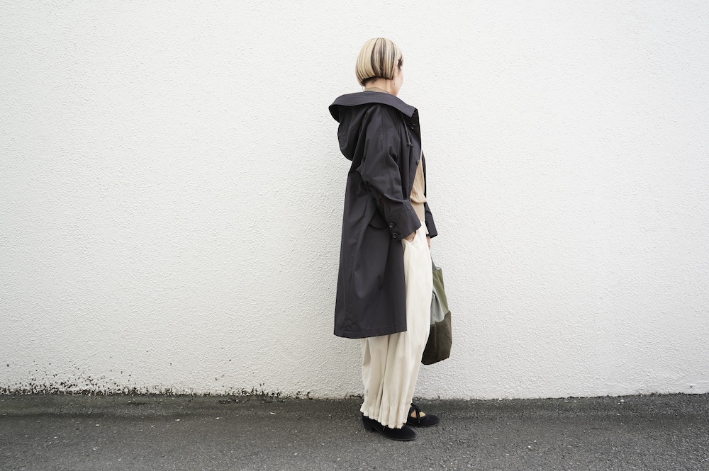 デザインはフードと一体化した大きな襟が特徴的なコート。ゆったりな身幅に対し、袖は細くなっているのでスッキリとした印象に。長すぎない着丈も新鮮です。フードは紐を絞って立体的に見せると、スタイリングのアクセントにもなります。 襟を立てたり折り返したり、ボタンを外して着用したりと、その時々の気分でや装いに合わせて印象を変化させて楽しめます。個性的だけれど日常の装いにさっと溶け込んで使いやすい、秋から春までロングシーズン着られるアウターです。