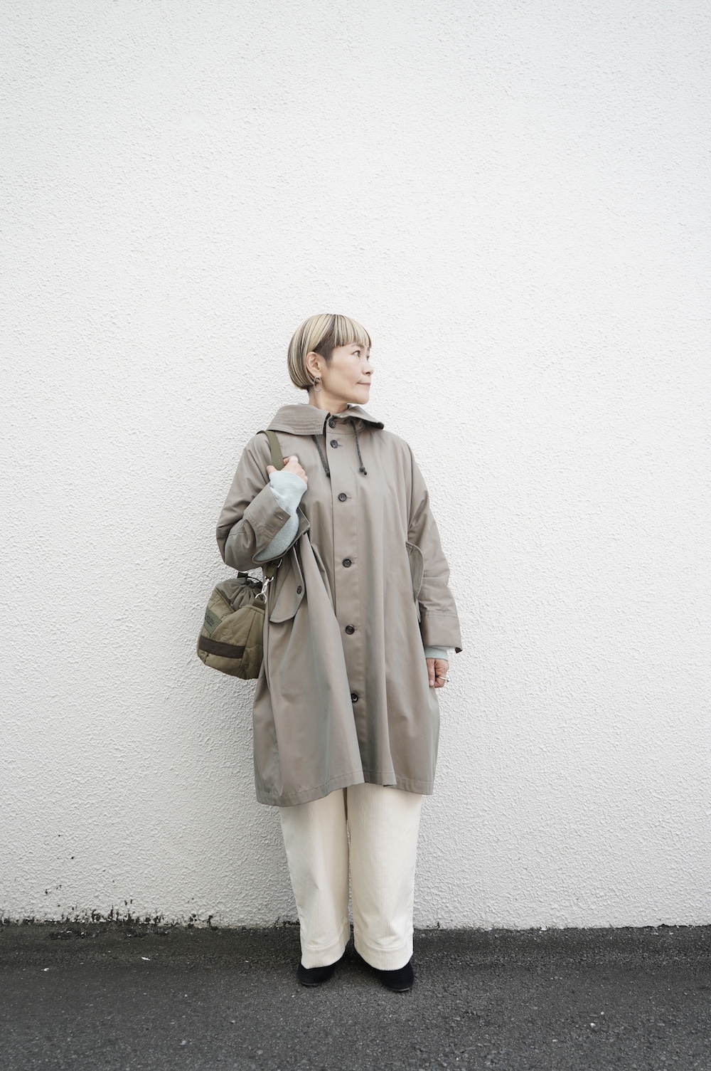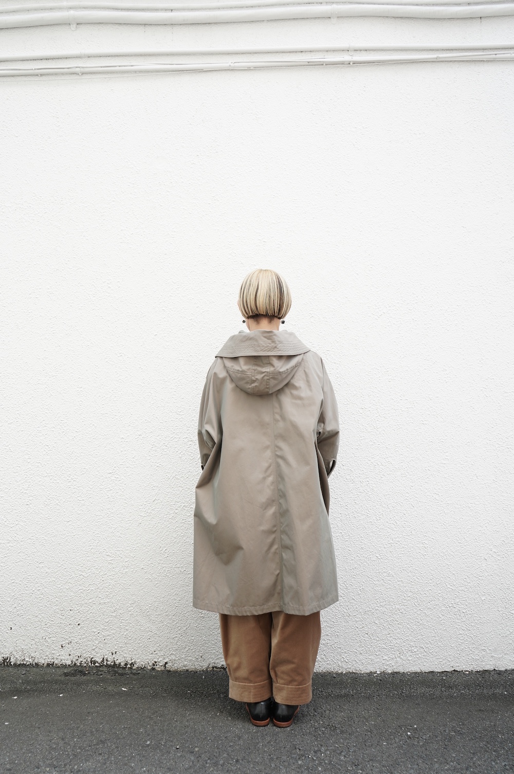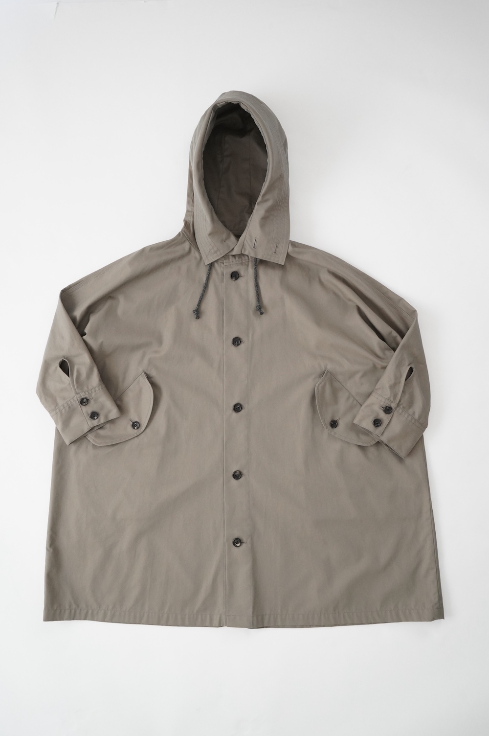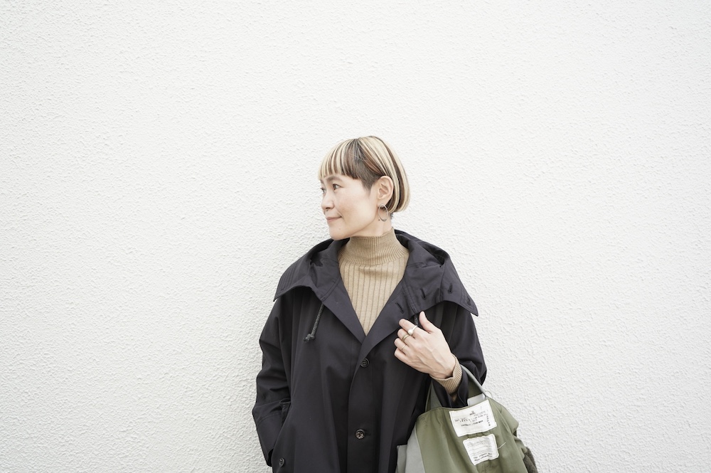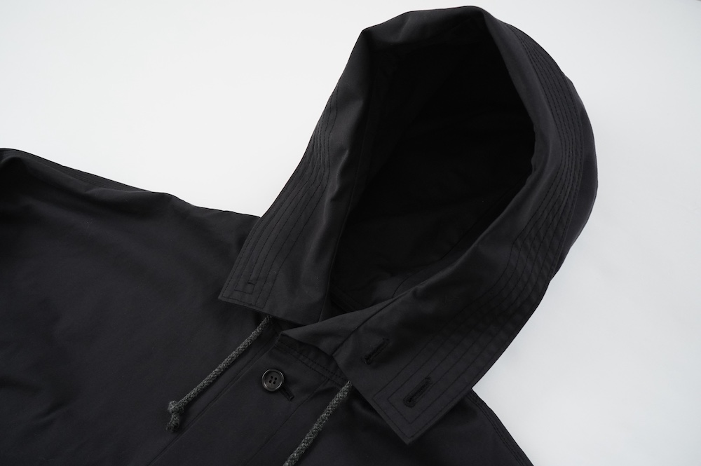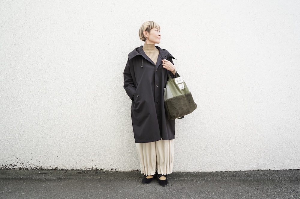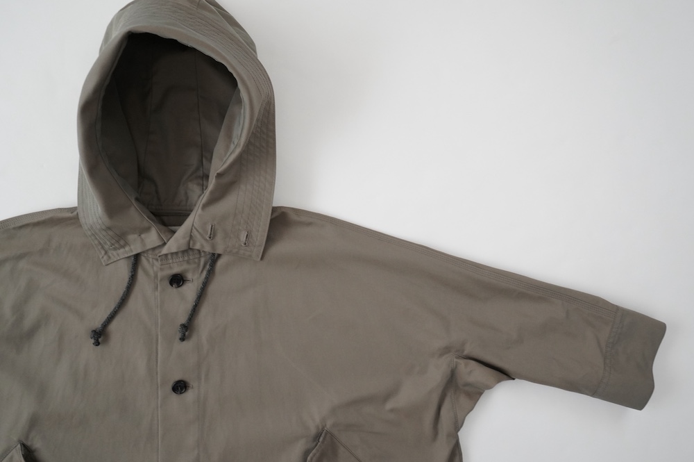 デザインはフードと一体化した大きな襟が特徴的なコート。ゆったりな身幅に対し、袖は細くなっているのでスッキリとした印象に。長すぎない着丈も新鮮です。フードは紐を絞って立体的に見せると、スタイリングのアクセントにもなります。 襟を立てたり折り返したり、ボタンを外して着用したりと、その時々の気分でや装いに合わせて印象を変化させて楽しめます。個性的だけれど日常の装いにさっと溶け込んで使いやすい、秋から春までロングシーズン着られるアウターです。