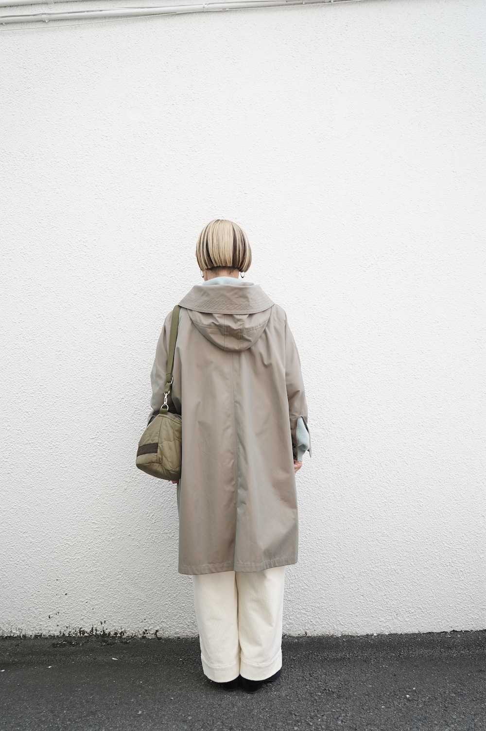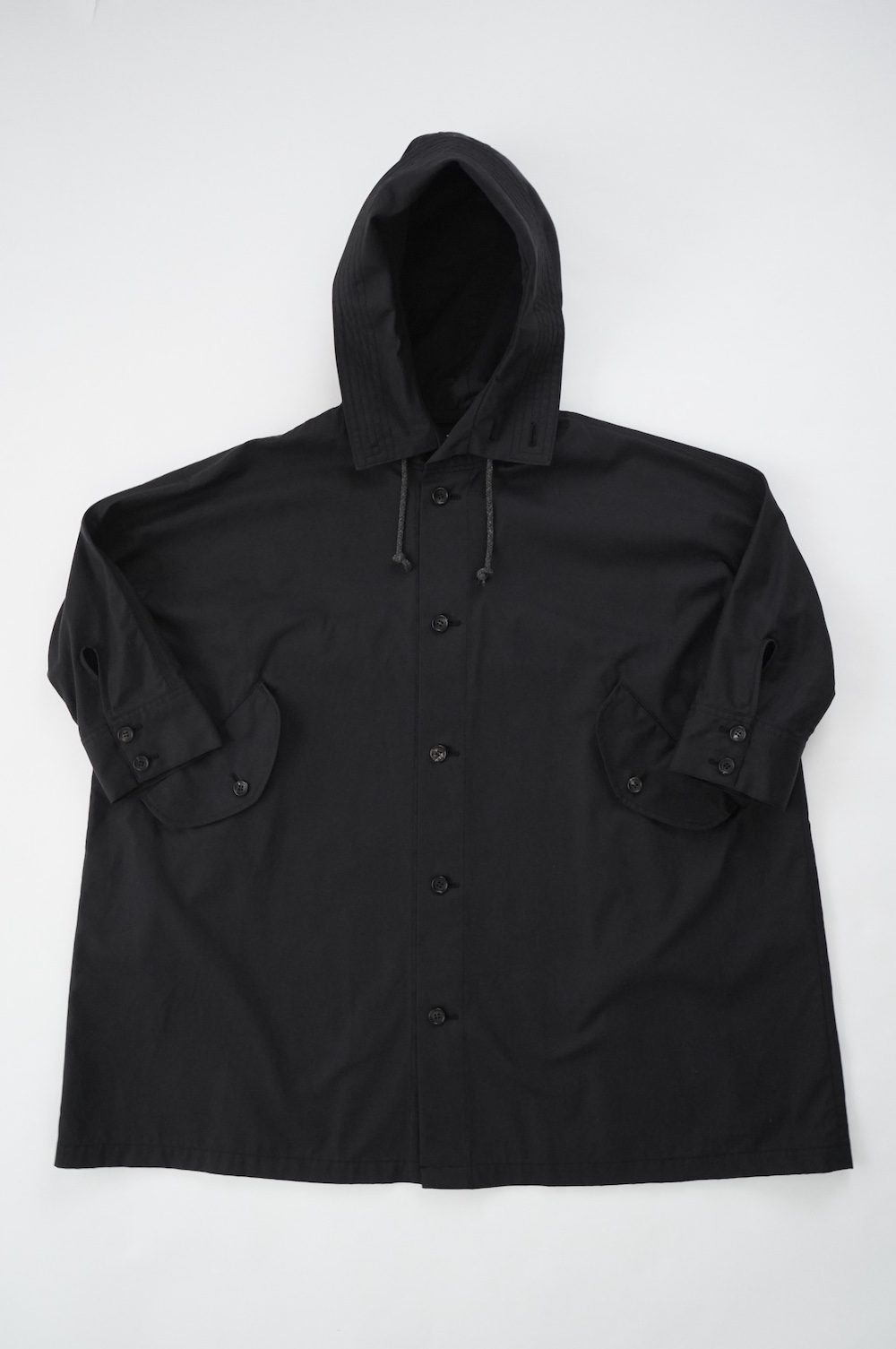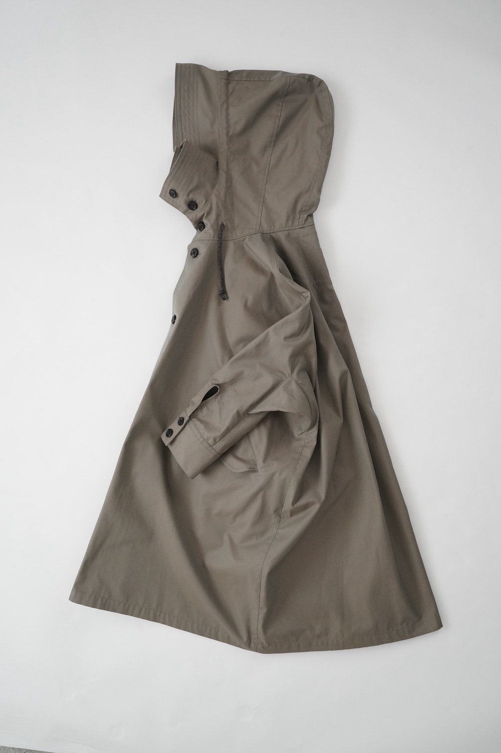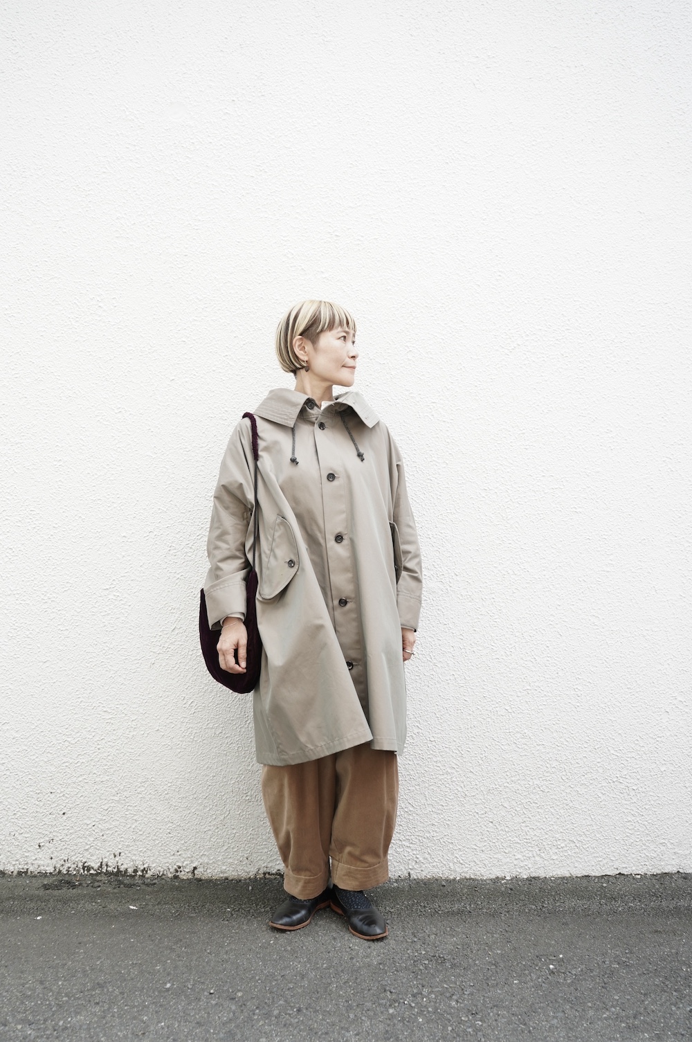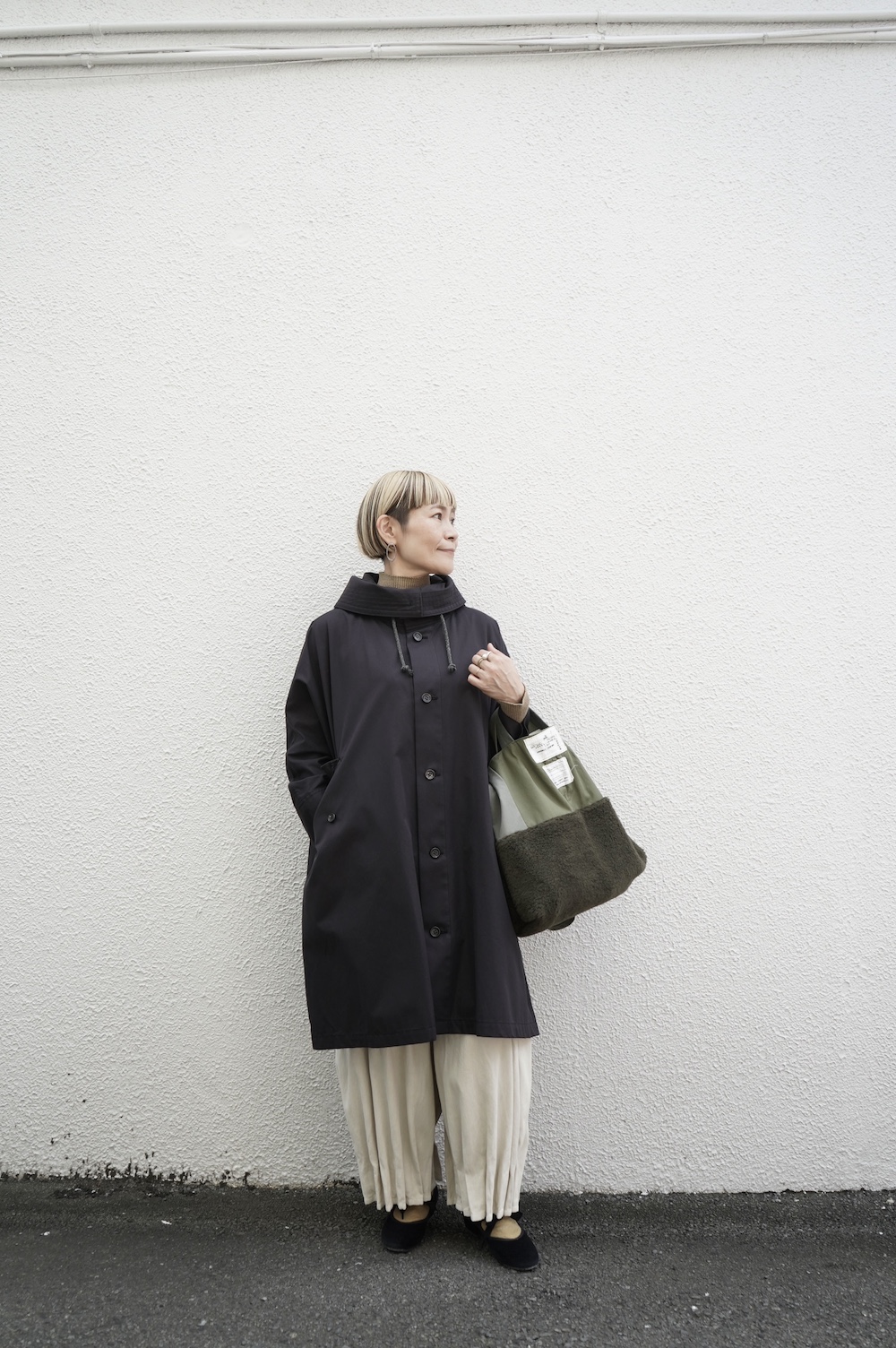 デザインはフードと一体化した大きな襟が特徴的なコート。ゆったりな身幅に対し、袖は細くなっているのでスッキリとした印象に。長すぎない着丈も新鮮です。フードは紐を絞って立体的に見せると、スタイリングのアクセントにもなります。 襟を立てたり折り返したり、ボタンを外して着用したりと、その時々の気分でや装いに合わせて印象を変化させて楽しめます。個性的だけれど日常の装いにさっと溶け込んで使いやすい、秋から春までロングシーズン着られるアウターです。