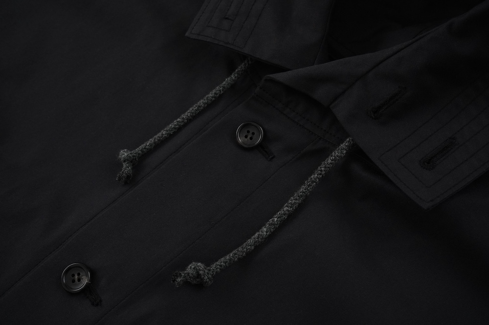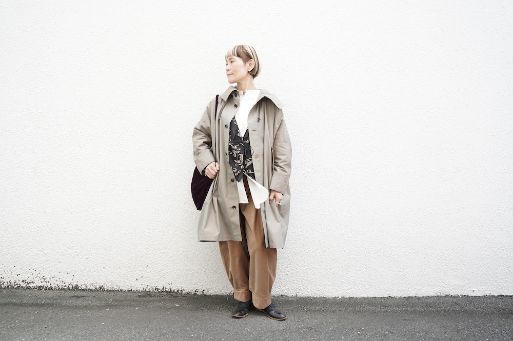 "ネイティブビレッジ"のコート。コットン100%の高密度なコットンツイル生地を使用。密度が高く風を通さないタイプのコートです。保温性よりも、春も含めて長い期間で着用できるコートとしておすすめです。中にニットを着たり、またその厚みを変えたり、コットンにしたりしながら、長い期間着用できるタイプのコートです。上品な光沢感があり、ツイル生地なのでしなやかさのある素材です。