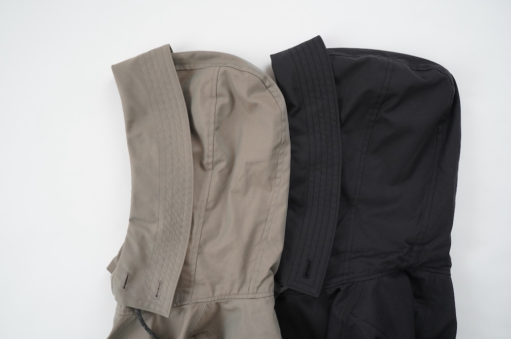 折り返しのある包み込まれえるような大きめのフードで、端はレールステッチです。
