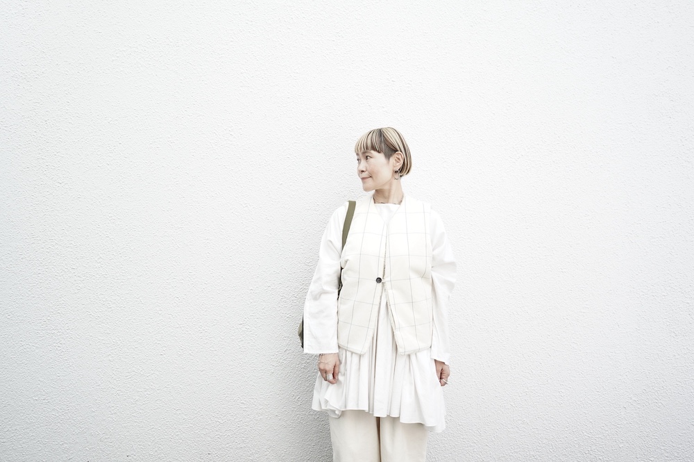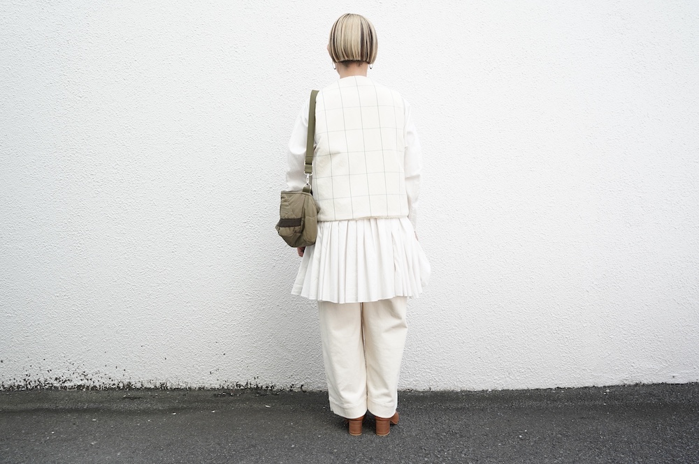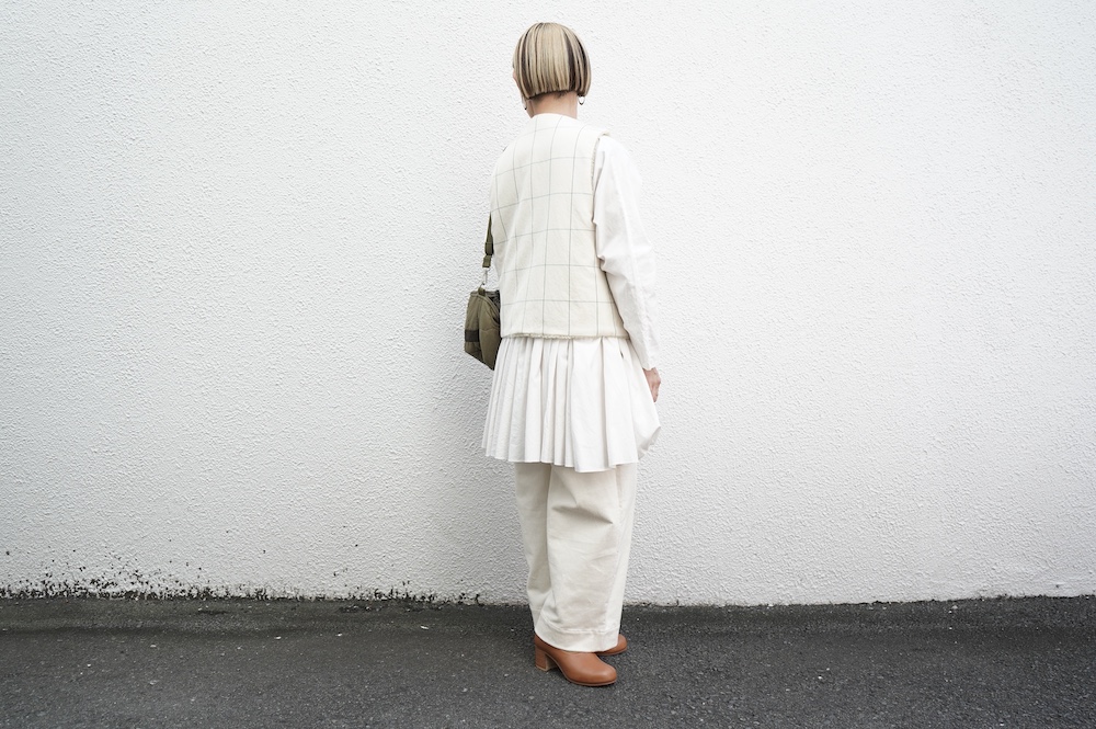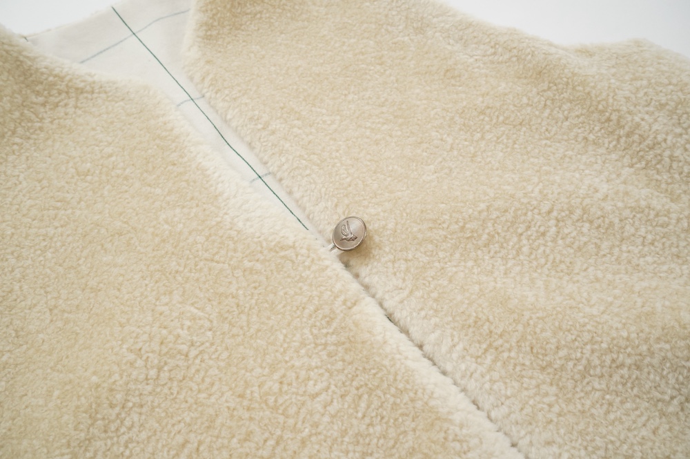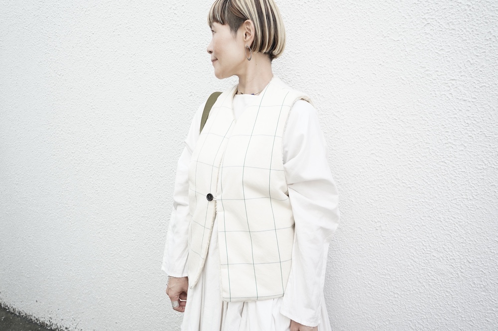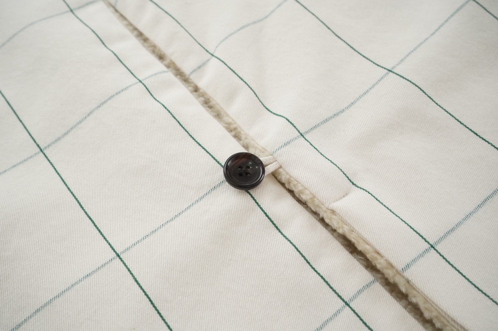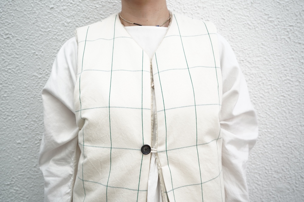 デザインはフロントが一つボタンのシンプルなVネックベスト。リバーシブルで程よいゆとりがあり、アームホールも広めなので様々なアイテムにプラスしていただきやすい。フロントのボタンは、グラフチェック面はブラックのシンプルなボタン、パイル面は鳥が描かれたメタルボタンを使用しており、それぞれの素材の雰囲気にぴったりです。どちらの面もそれそれ違って楽しめます。グラフチェック柄は、同素材のパンツもございますのでセットアップも素敵です。