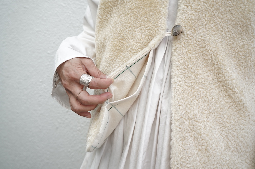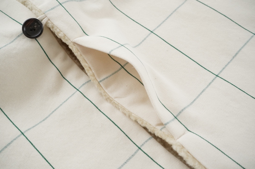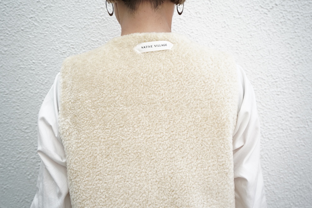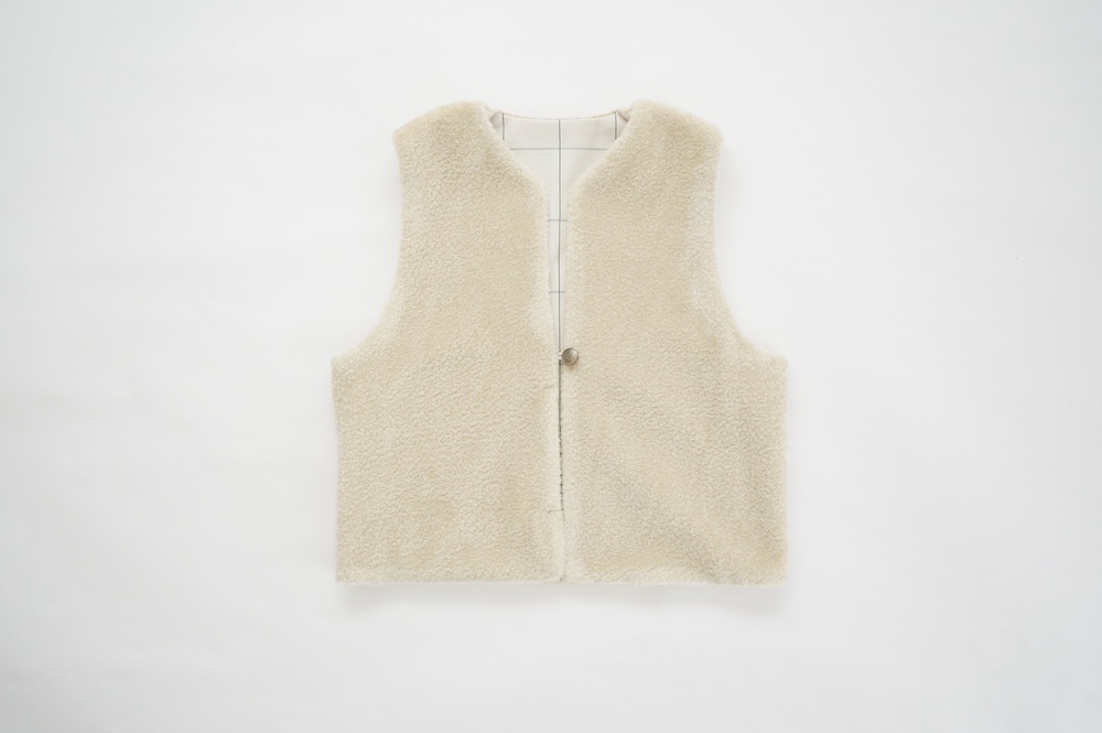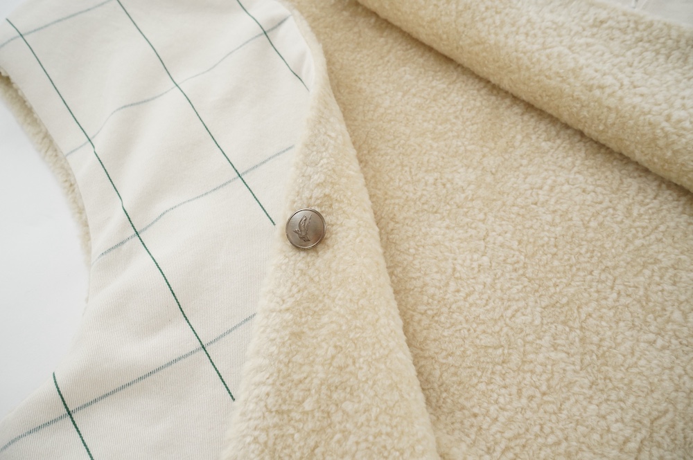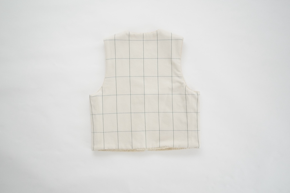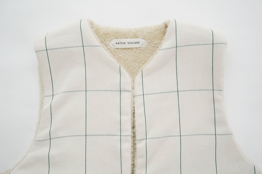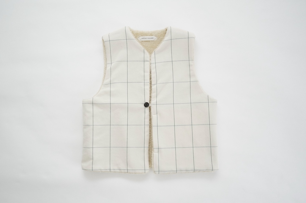 "ネイティブビレッジ"のベスト。オリジナルのグラフチェック柄生地と、パイル生地を使用したリバーシブル仕様のベストです。グラフチェック生地は、ライン部分のみ緑色の糸を使用し、ベースのオフホワイトはコットンとウールの原料そのままのナチュラルな色を使用しています。パイル生地は毛足短めのぬいぐるみのようなモフモフ感。思わず撫でたくなるような可愛らしい素材です。