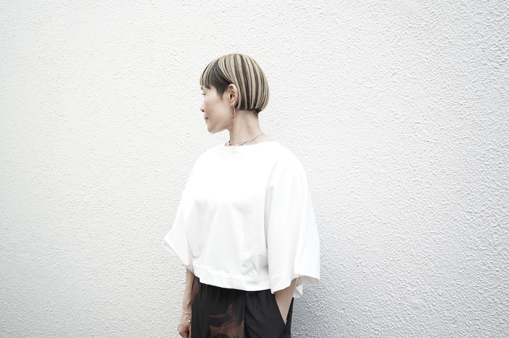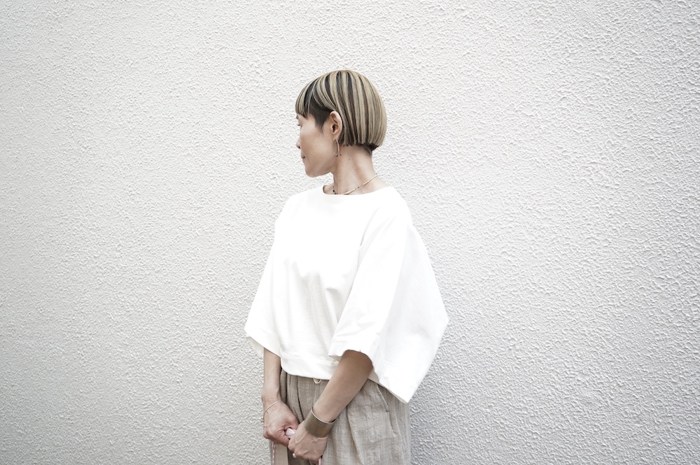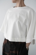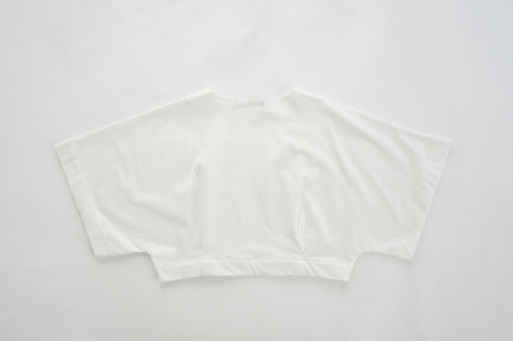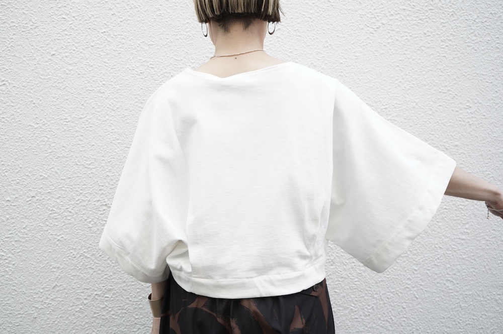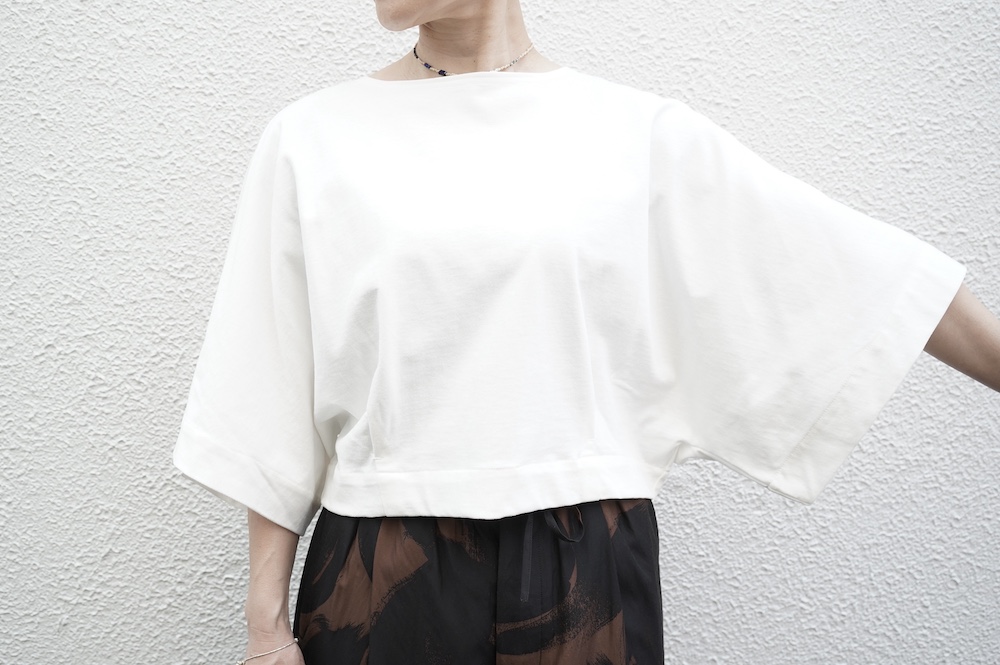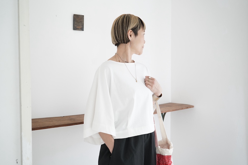 デザインは見頃から連なる大きく開いた袖口が特徴のキモノスリーブのプルオーバーTee。ネックは程よい開きのボートネックです。裾はタックを取りすっきり仕上げているので、裾が広がりすぎずに着ていただけます。ポンチョのような、風が抜ける涼やかなプルオーバーTeeです。