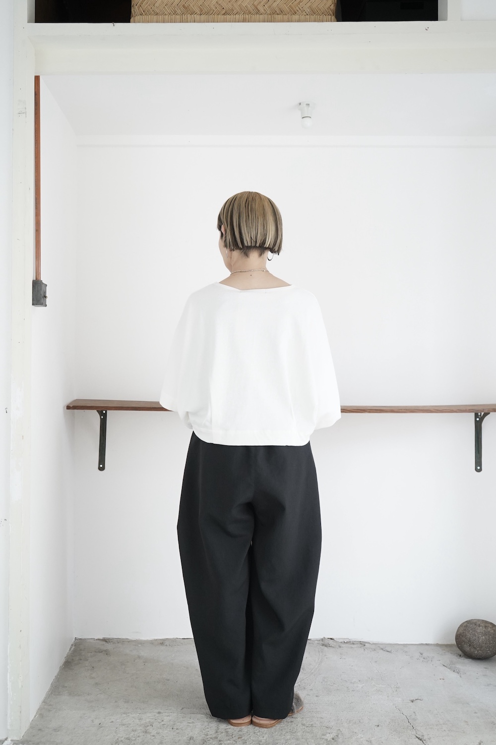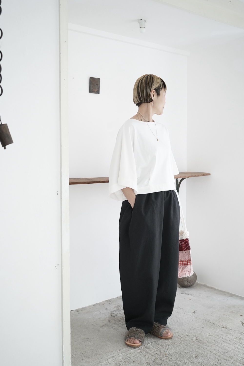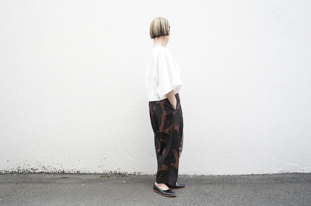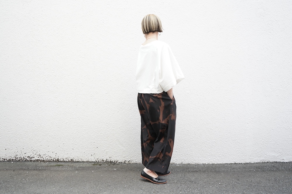 デザインは見頃から連なる大きく開いた袖口が特徴のキモノスリーブのプルオーバーTee。ネックは程よい開きのボートネックです。裾はタックを取りすっきり仕上げているので、裾が広がりすぎずに着ていただけます。ポンチョのような、風が抜ける涼やかなプルオーバーTeeです。