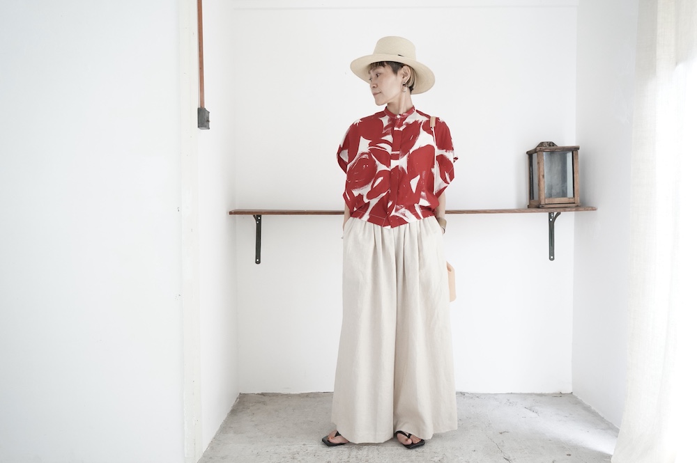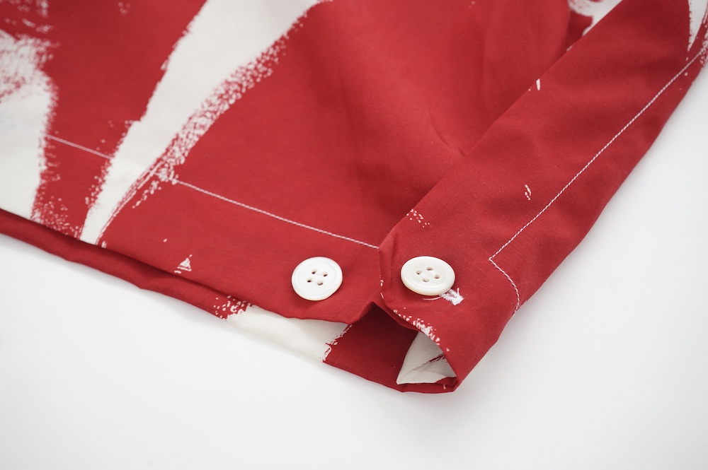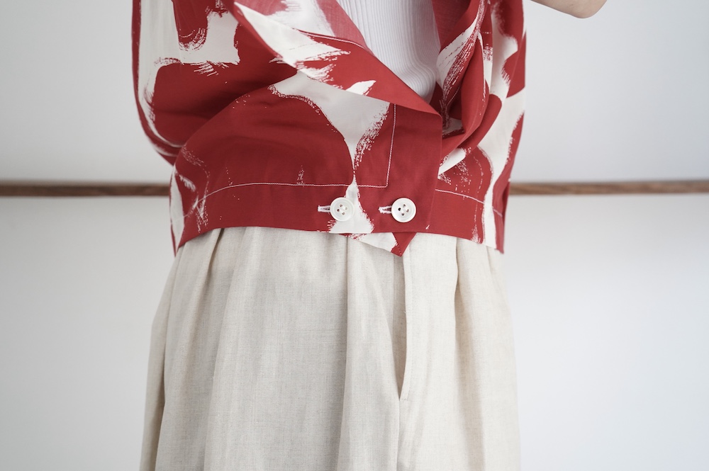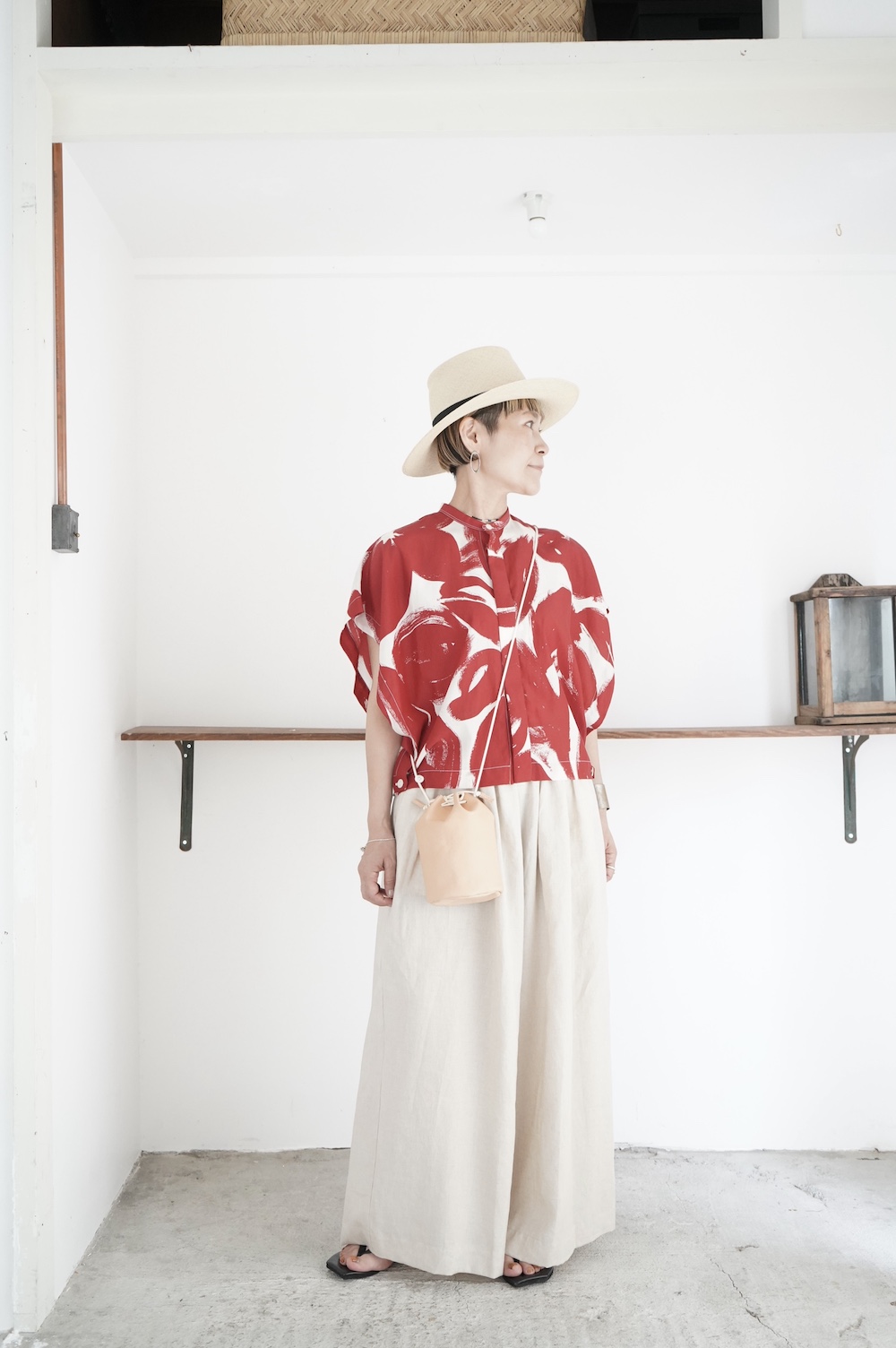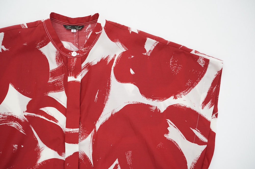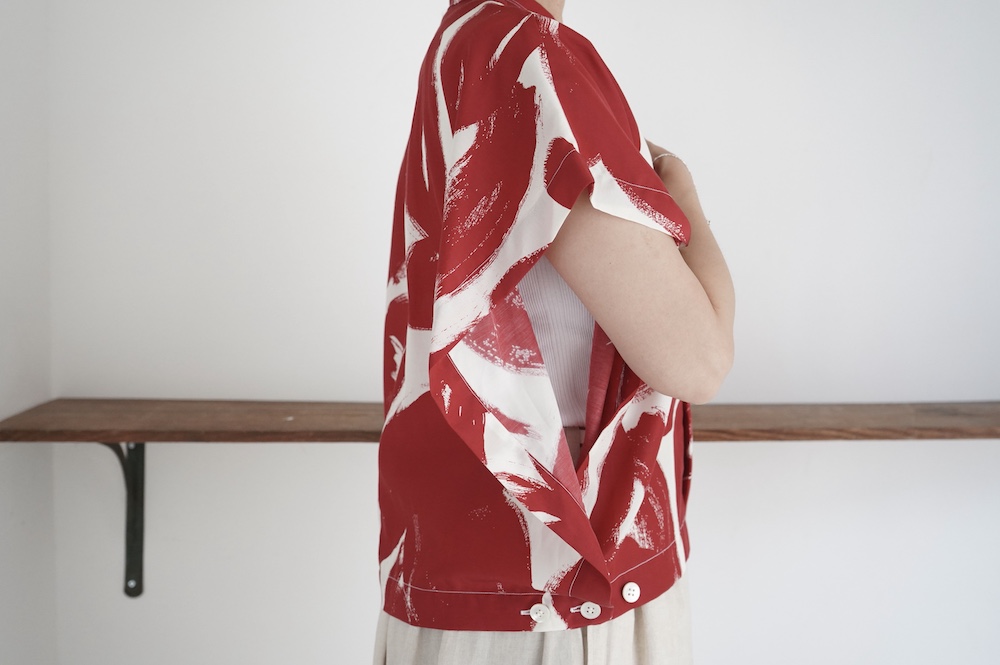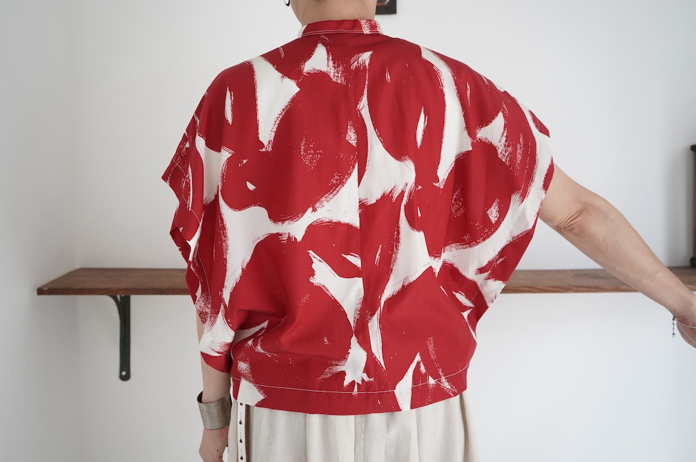 デザインは、アームホールが大きく脇はボタン留めの仕様になってるバンドカラーシャツ。脇のボタンは横並びに3つずつついているので、裾幅の調整が可能です。二の腕をカバーしてくれる、安心感のあるフレンチスリーブのような袖丈です。前立ては一番上のボタン以外は比翼仕立てになっています。鮮やかなレッドカラーが目を引く、つるっとした手触りと光沢感が素敵な気分の上がるブラウスです。