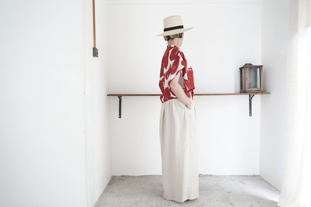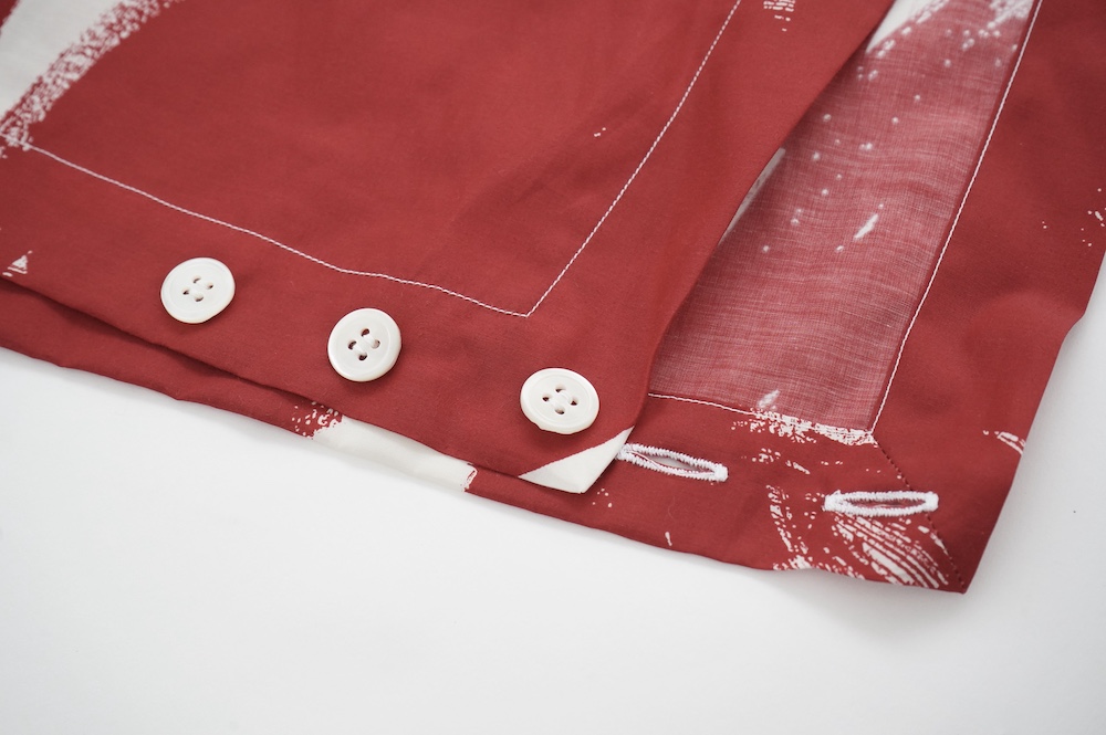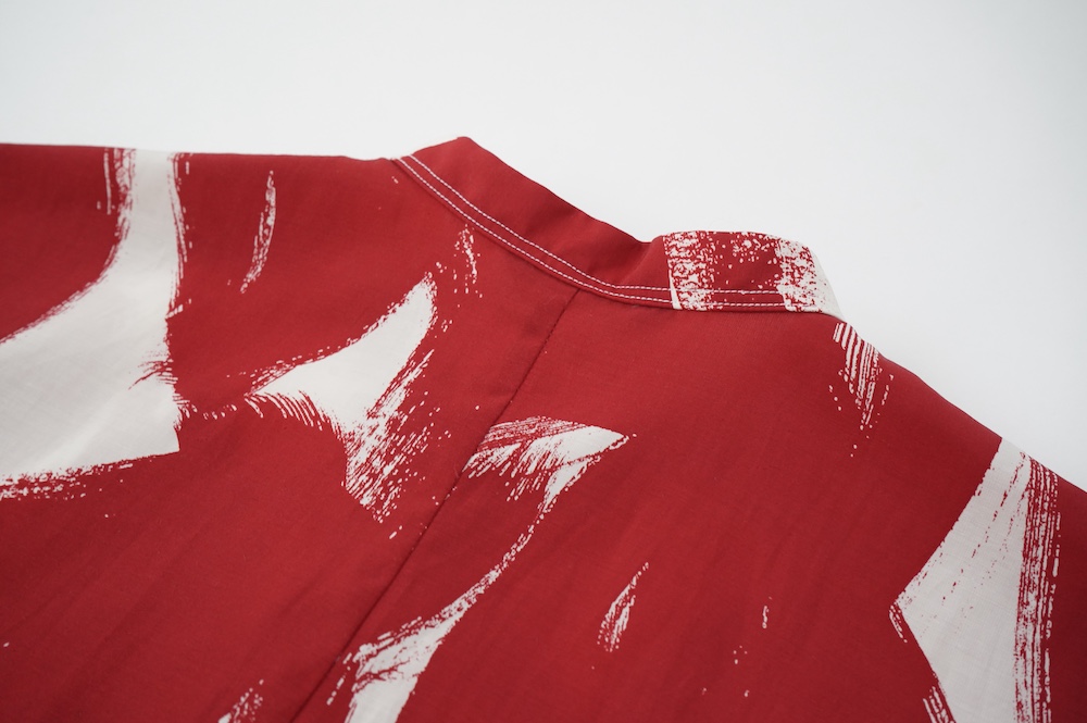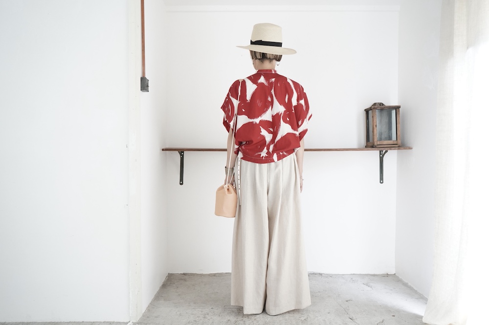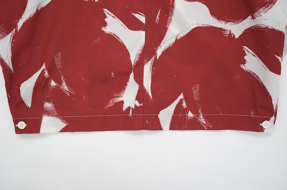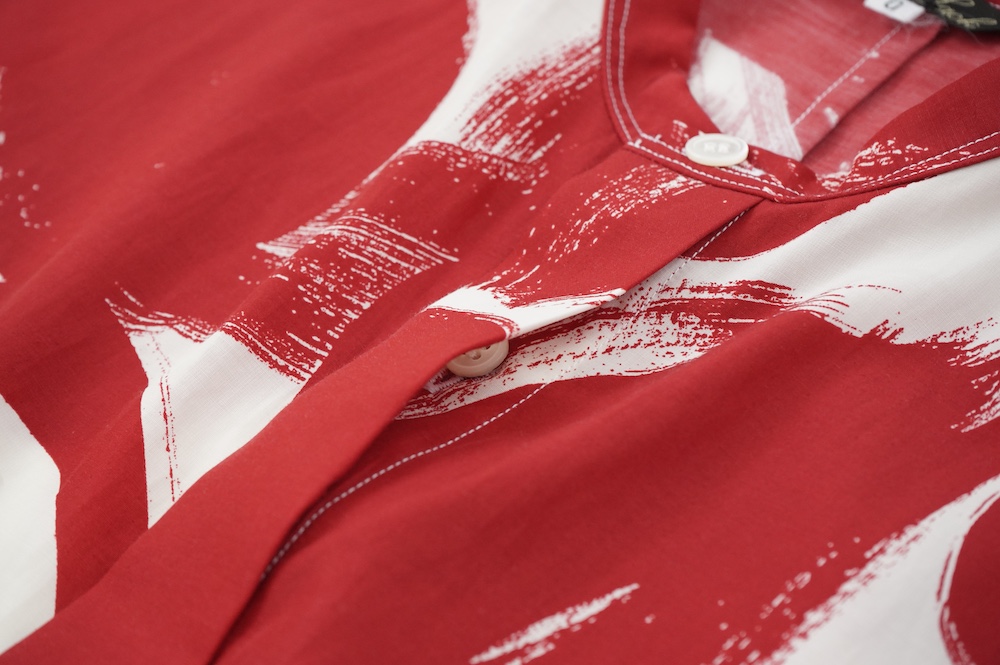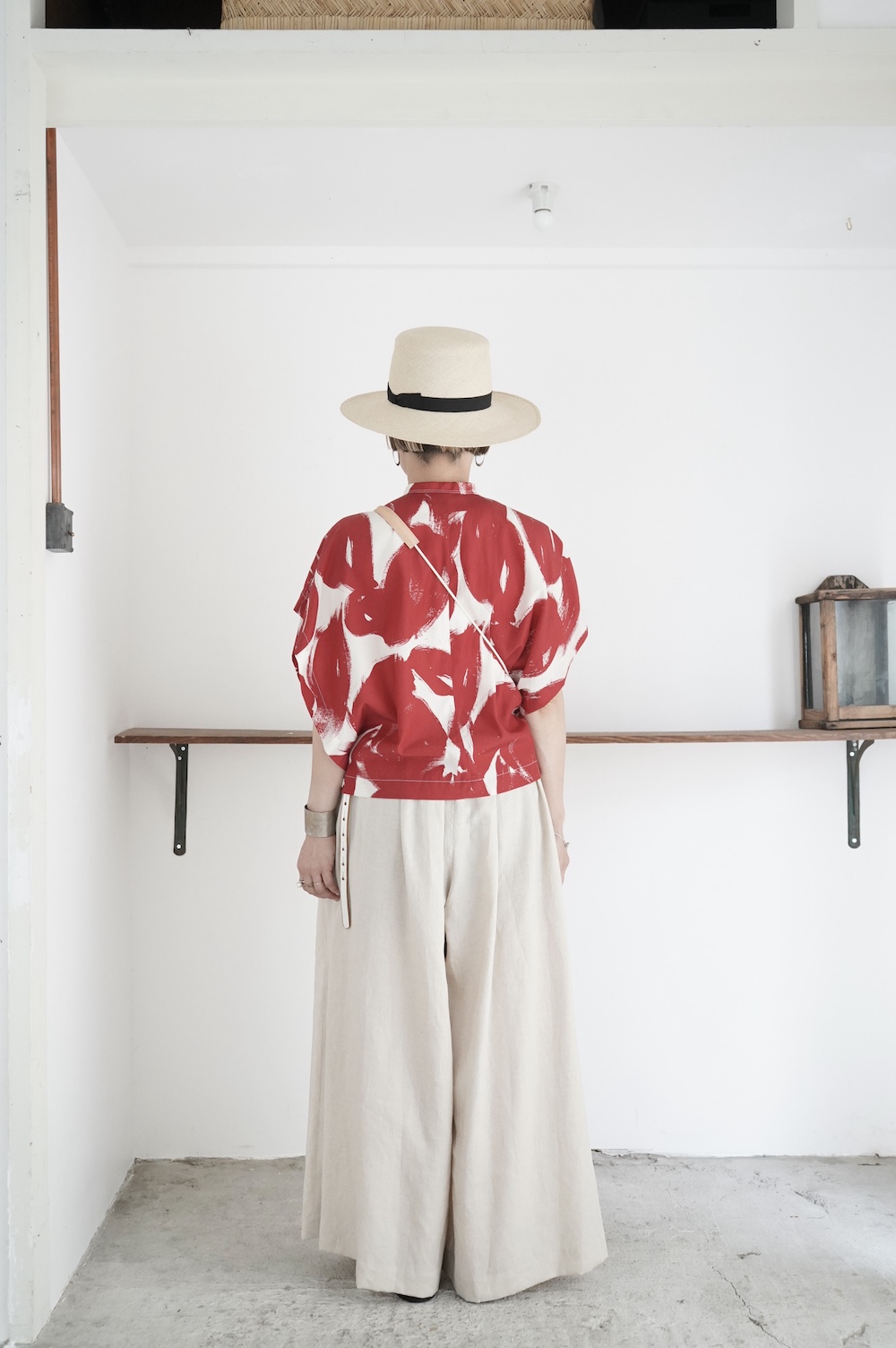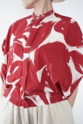 デザインは、アームホールが大きく脇はボタン留めの仕様になってるバンドカラーシャツ。脇のボタンは横並びに3つずつついているので、裾幅の調整が可能です。二の腕をカバーしてくれる、安心感のあるフレンチスリーブのような袖丈です。前立ては一番上のボタン以外は比翼仕立てになっています。鮮やかなレッドカラーが目を引く、つるっとした手触りと光沢感が素敵な気分の上がるブラウスです。