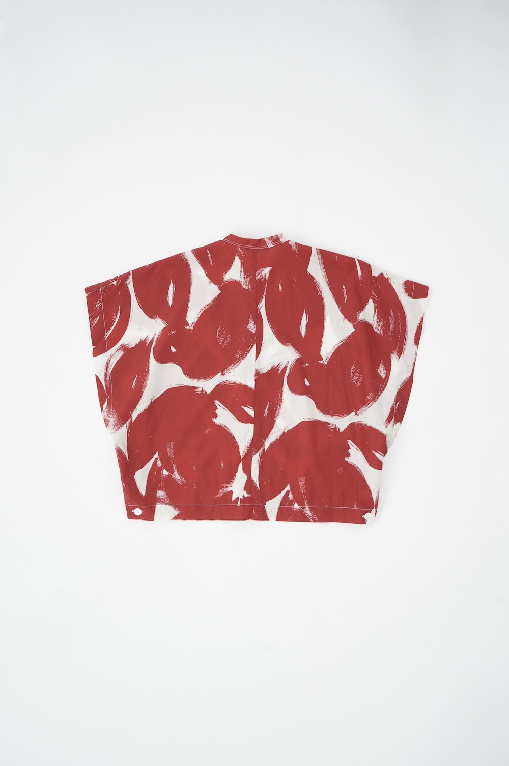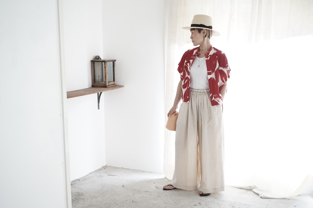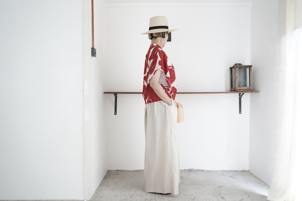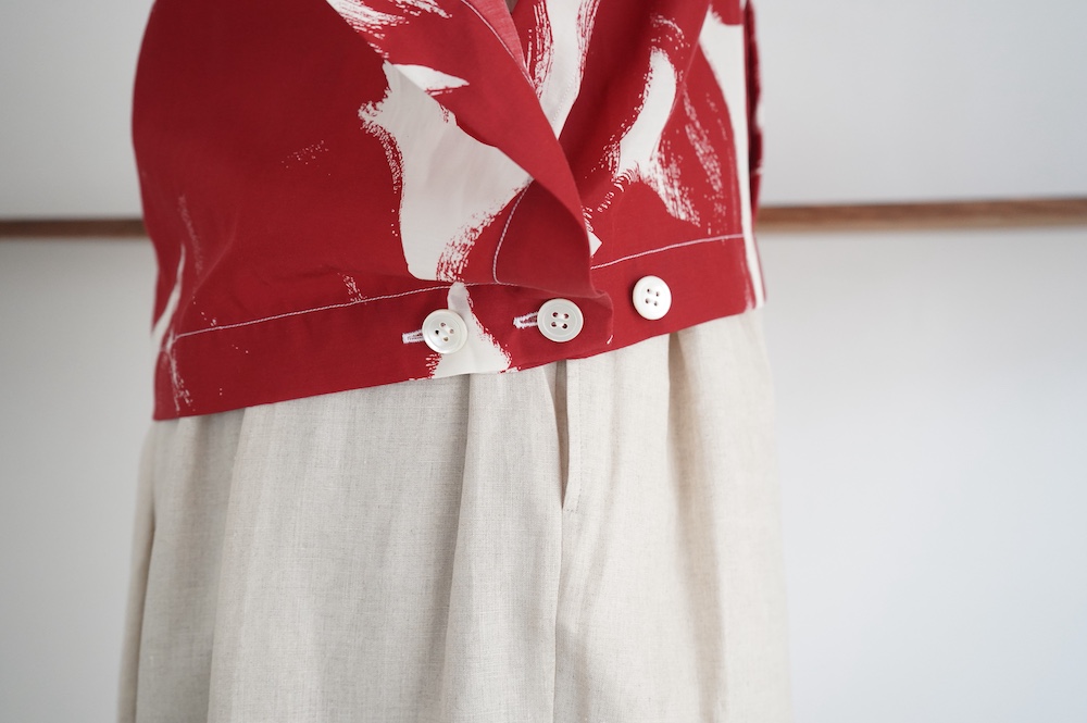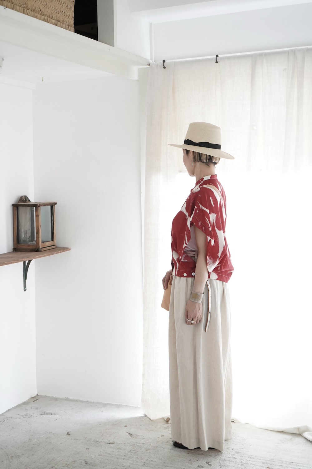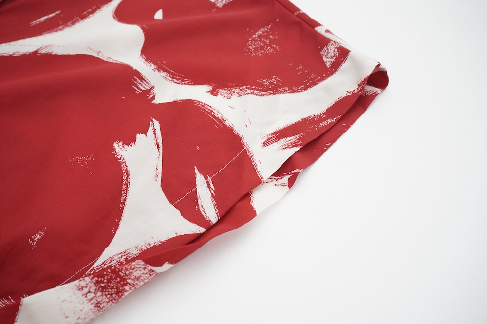 デザインは、アームホールが大きく脇はボタン留めの仕様になってるバンドカラーシャツ。脇のボタンは横並びに3つずつついているので、裾幅の調整が可能です。二の腕をカバーしてくれる、安心感のあるフレンチスリーブのような袖丈です。前立ては一番上のボタン以外は比翼仕立てになっています。鮮やかなレッドカラーが目を引く、つるっとした手触りと光沢感が素敵な気分の上がるブラウスです。