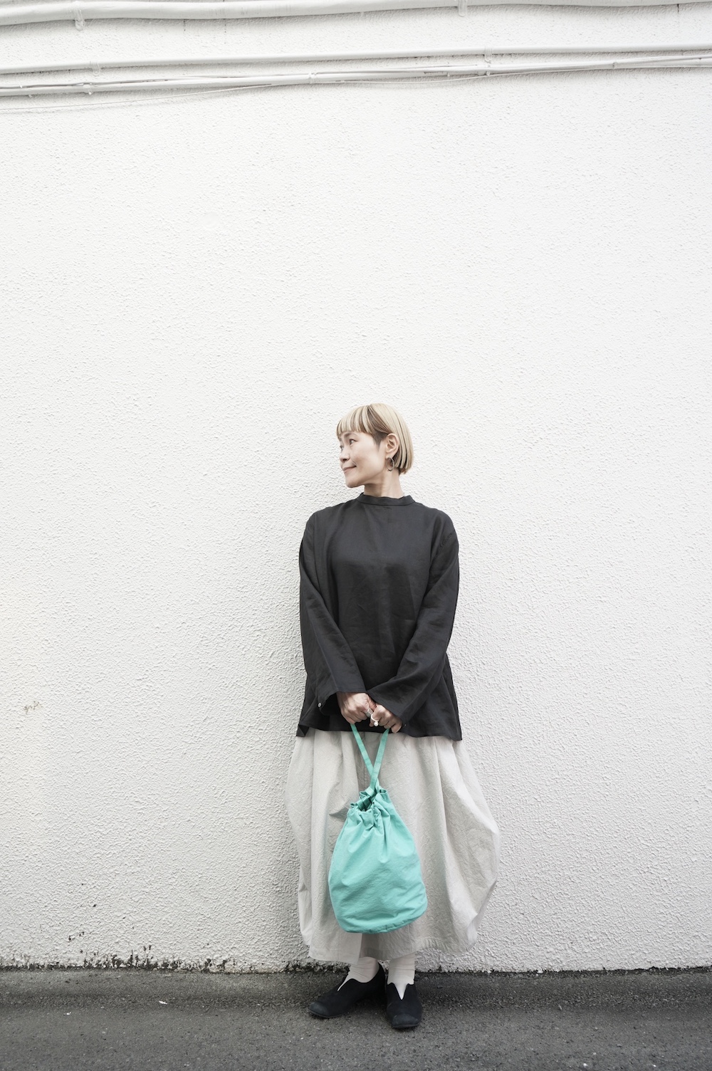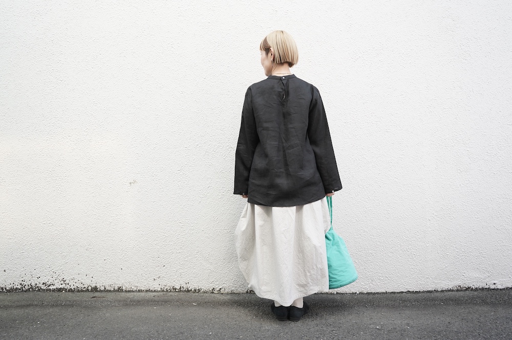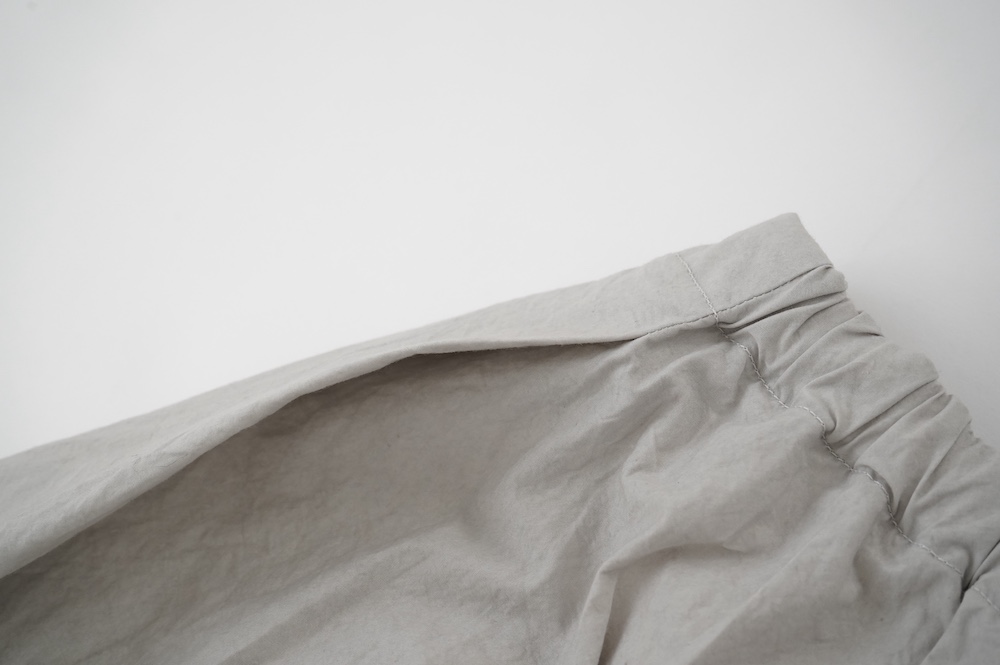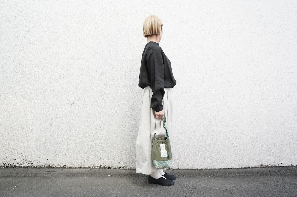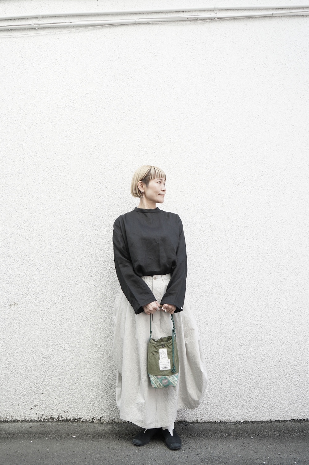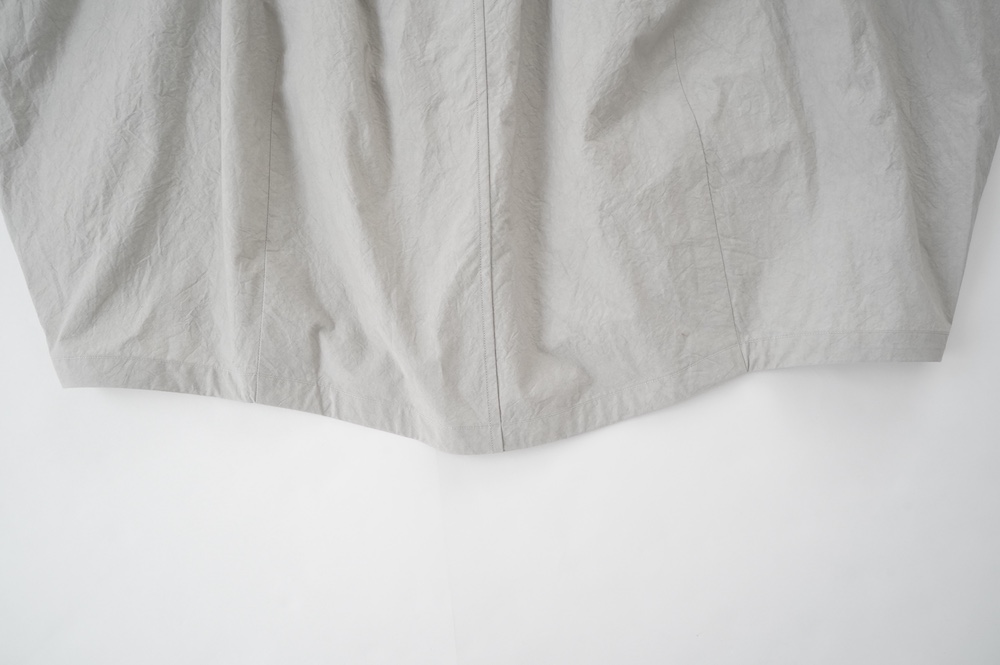 ”ハバーサック”のスカート。高密度に織り上げたコットンタイプライター生地を使用。手作業で染めたムラ感と、天日干しによるシワ感が特徴的な、ハリのあるパリッとした風合いの素材です。薄手で軽いので、夏まで楽しめそうな生地感です。