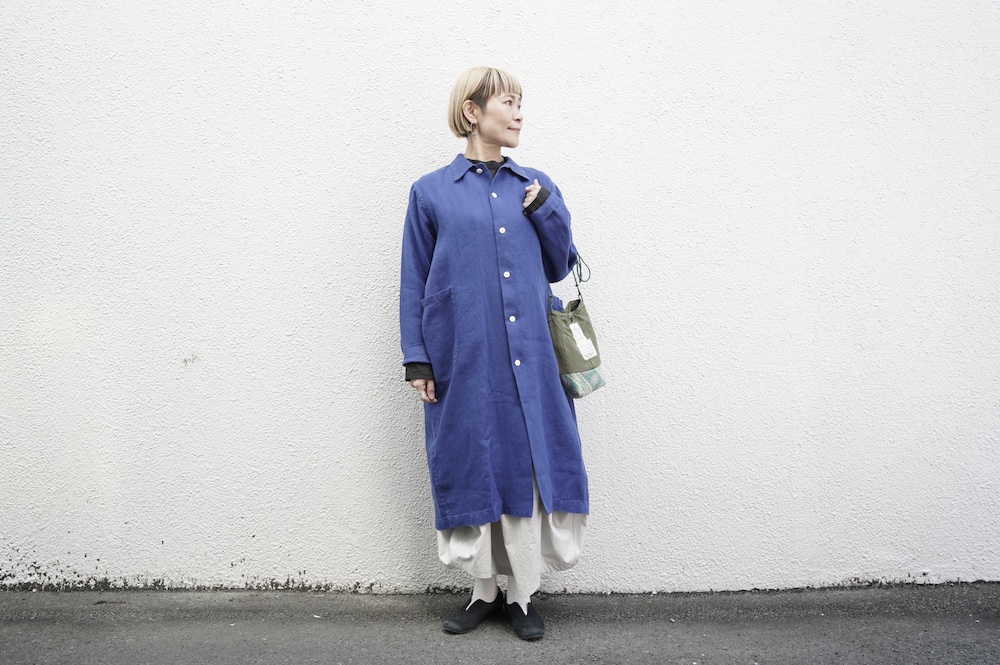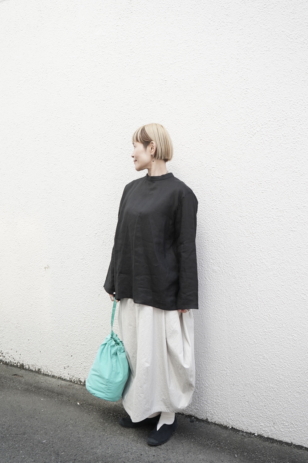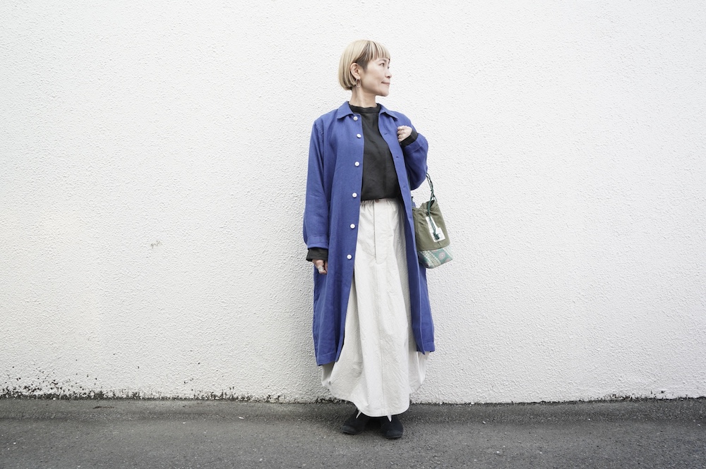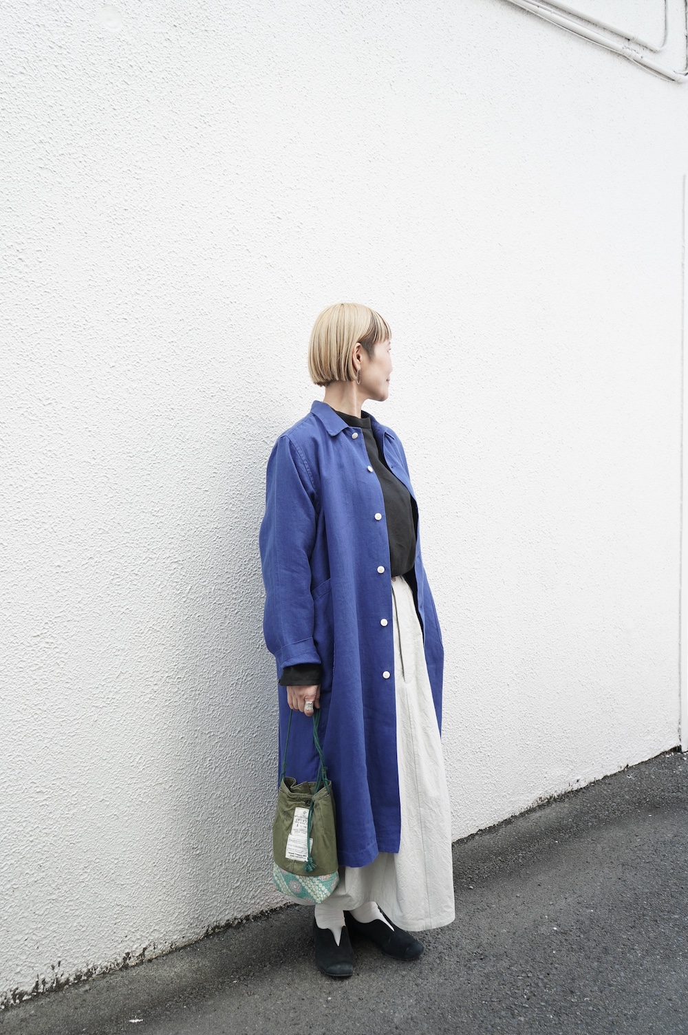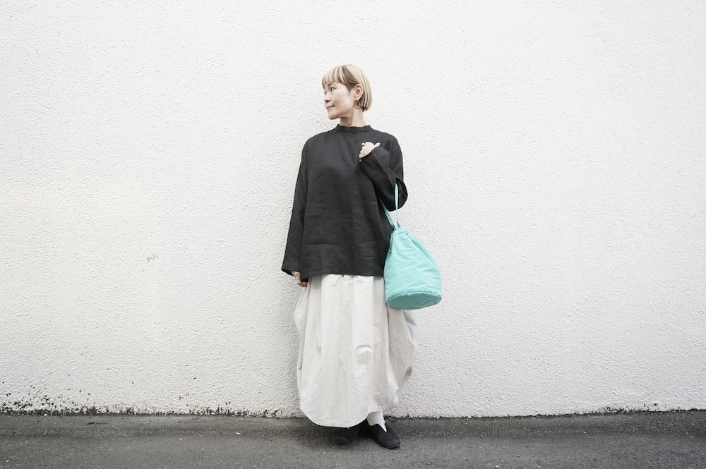 ”ハバーサック”のスカート。高密度に織り上げたコットンタイプライター生地を使用。手作業で染めたムラ感と、天日干しによるシワ感が特徴的な、ハリのあるパリッとした風合いの素材です。薄手で軽いので、夏まで楽しめそうな生地感です。