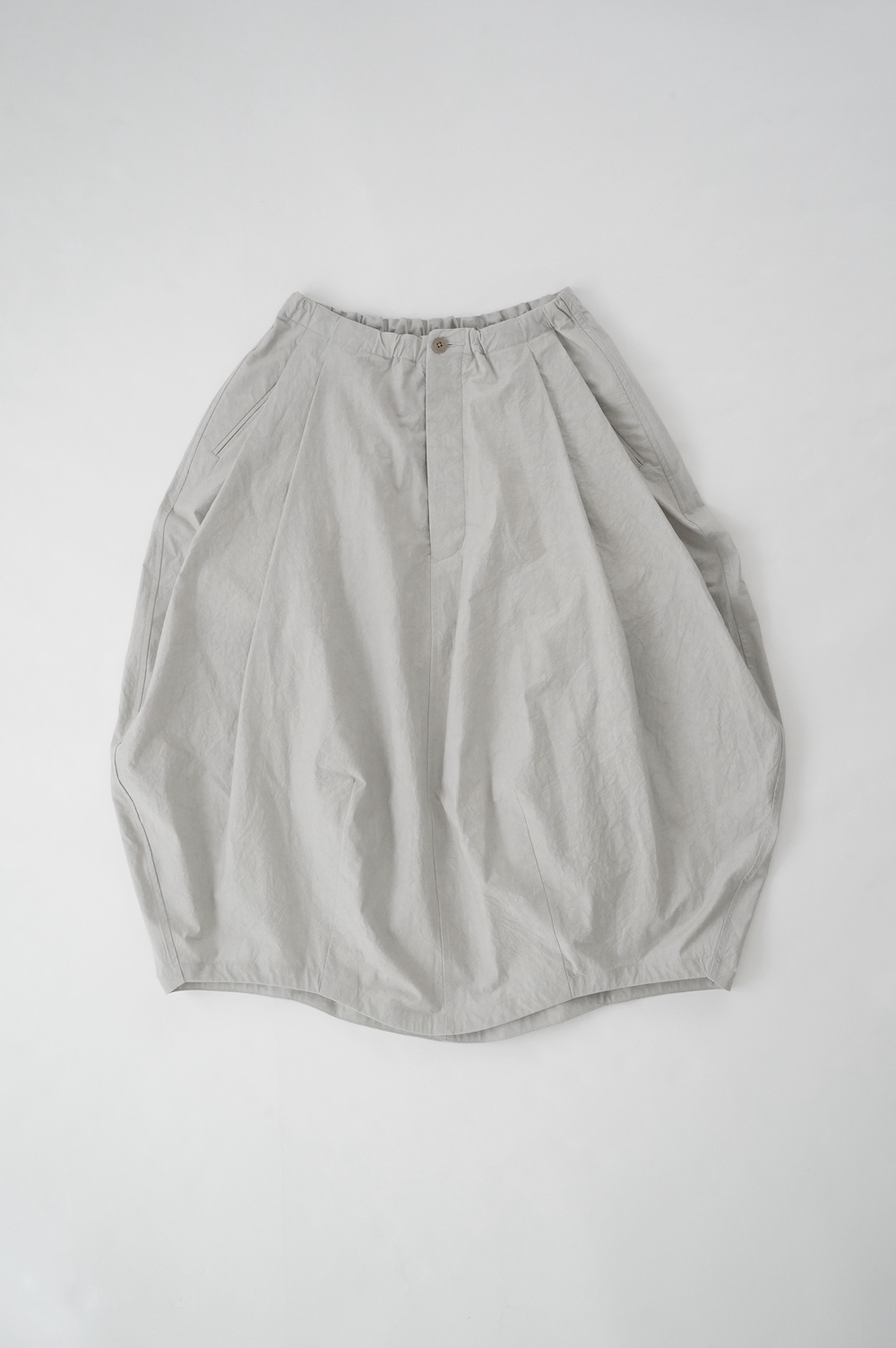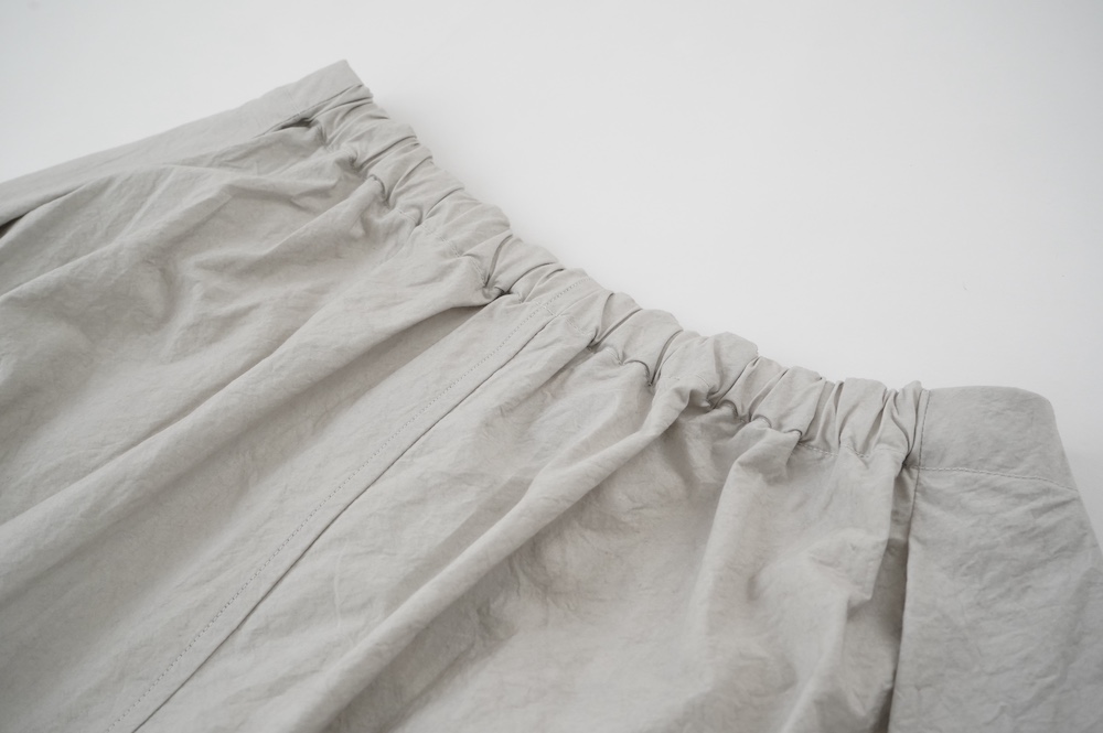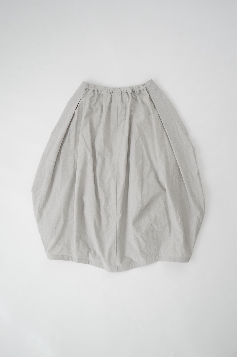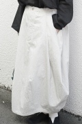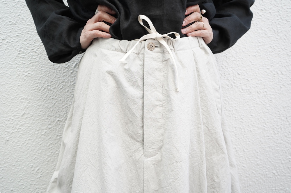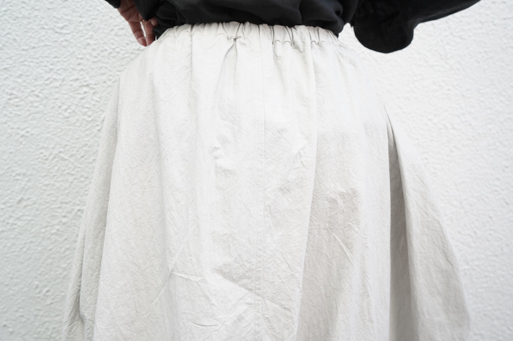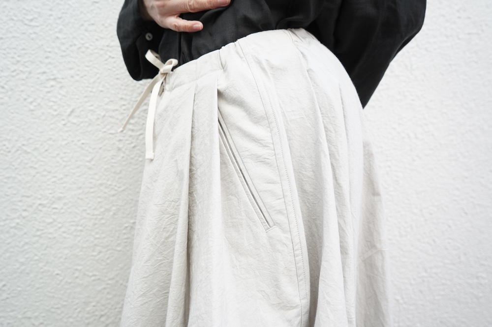 デザインはバルーンシルエットが特徴のロングスカート。深いプリーツと、プリーツに重なる5mm巾両玉縁ポケットがポイントになっています。ウエストはイージーなゴムシャーリング仕様で、ボリューム感のある仕上がりに。ボリューム感はありながら、パンツを穿いているかのような格好良い印象になるスカートです。