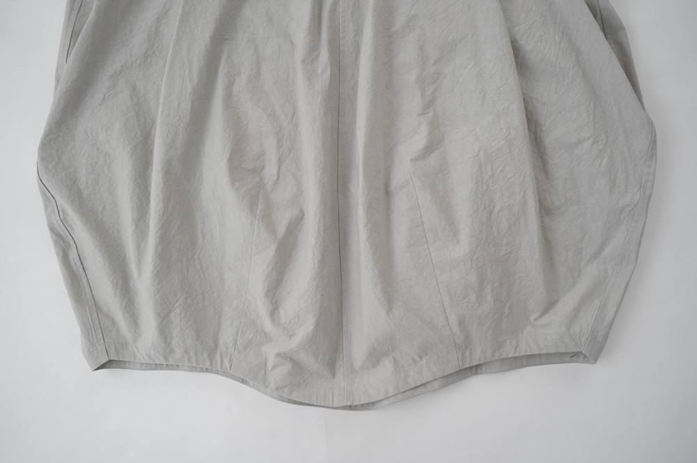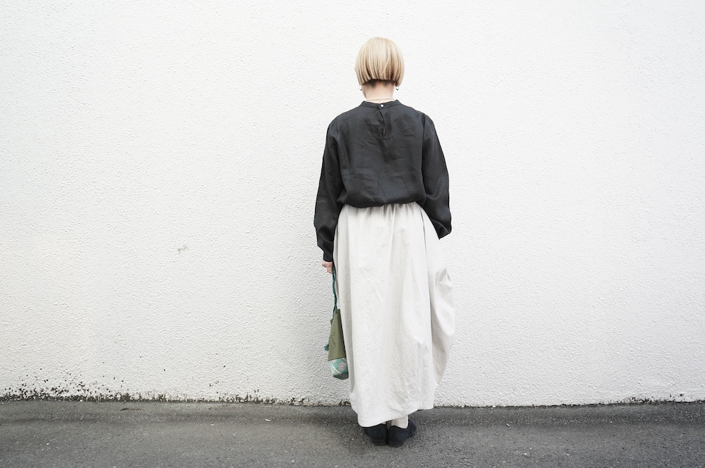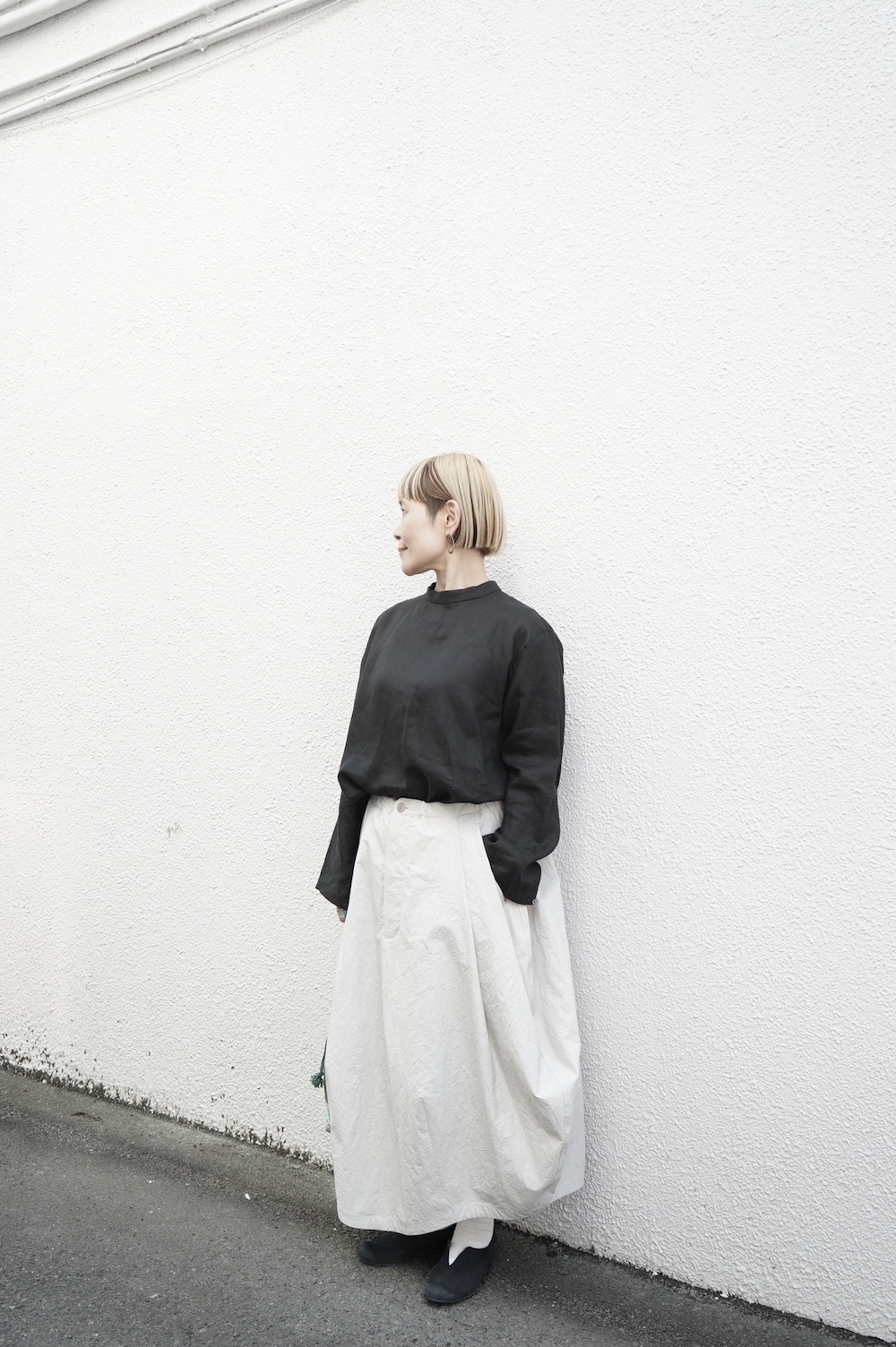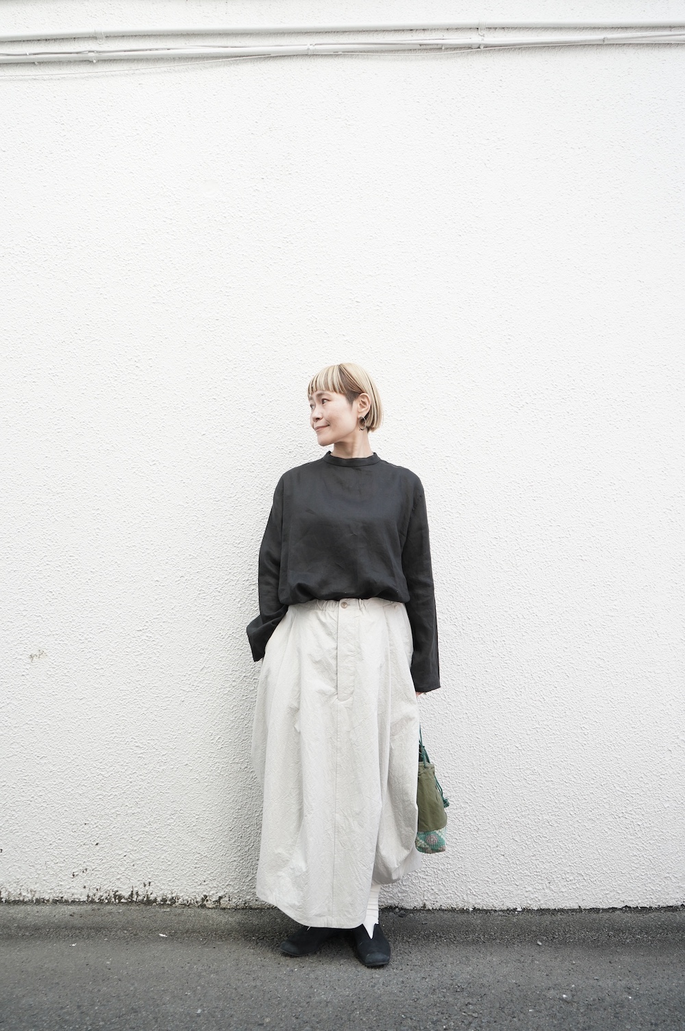 デザインはバルーンシルエットが特徴のロングスカート。深いプリーツと、プリーツに重なる5mm巾両玉縁ポケットがポイントになっています。ウエストはイージーなゴムシャーリング仕様で、ボリューム感のある仕上がりに。ボリューム感はありながら、パンツを穿いているかのような格好良い印象になるスカートです。