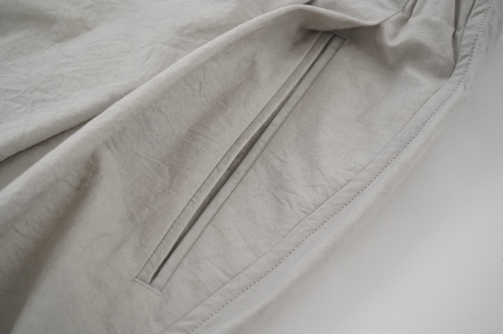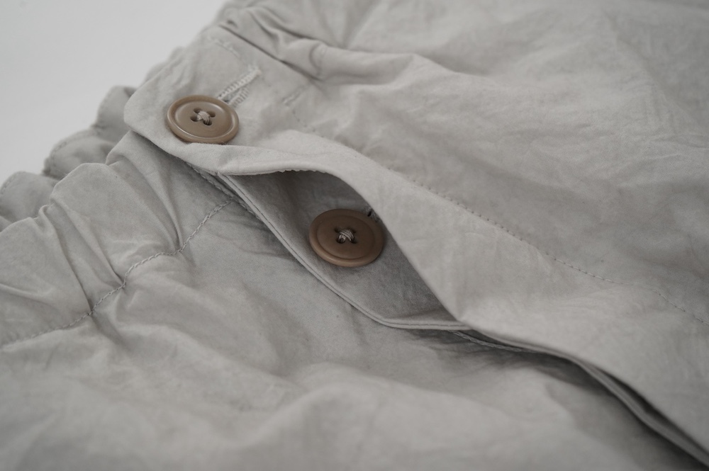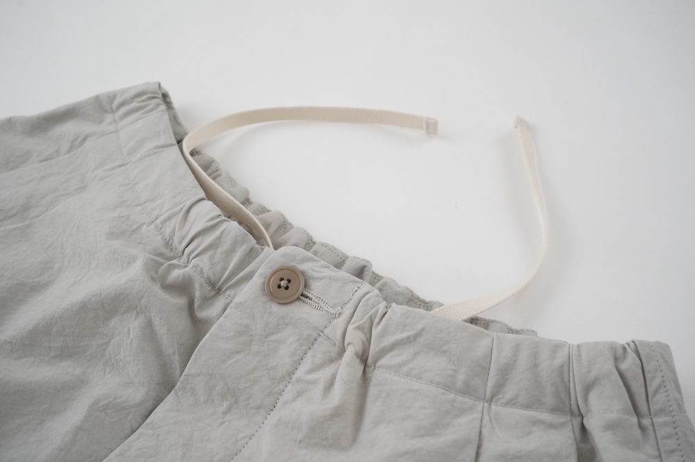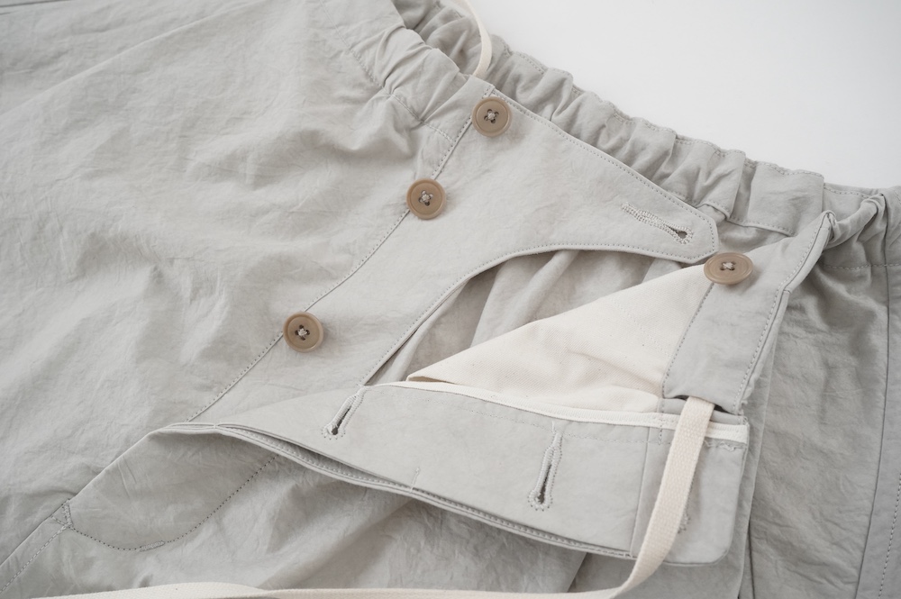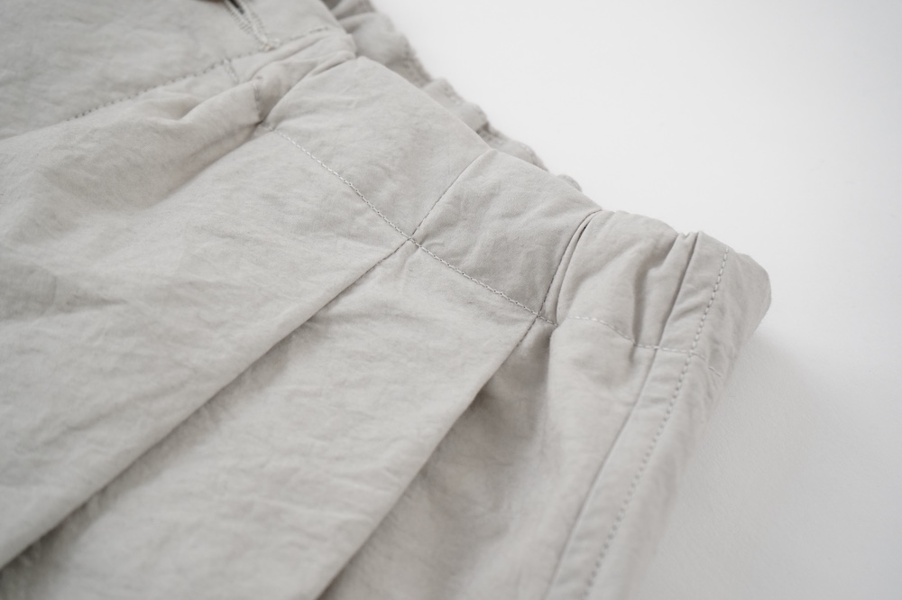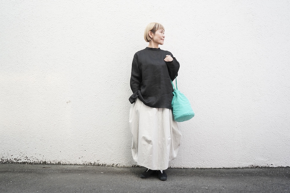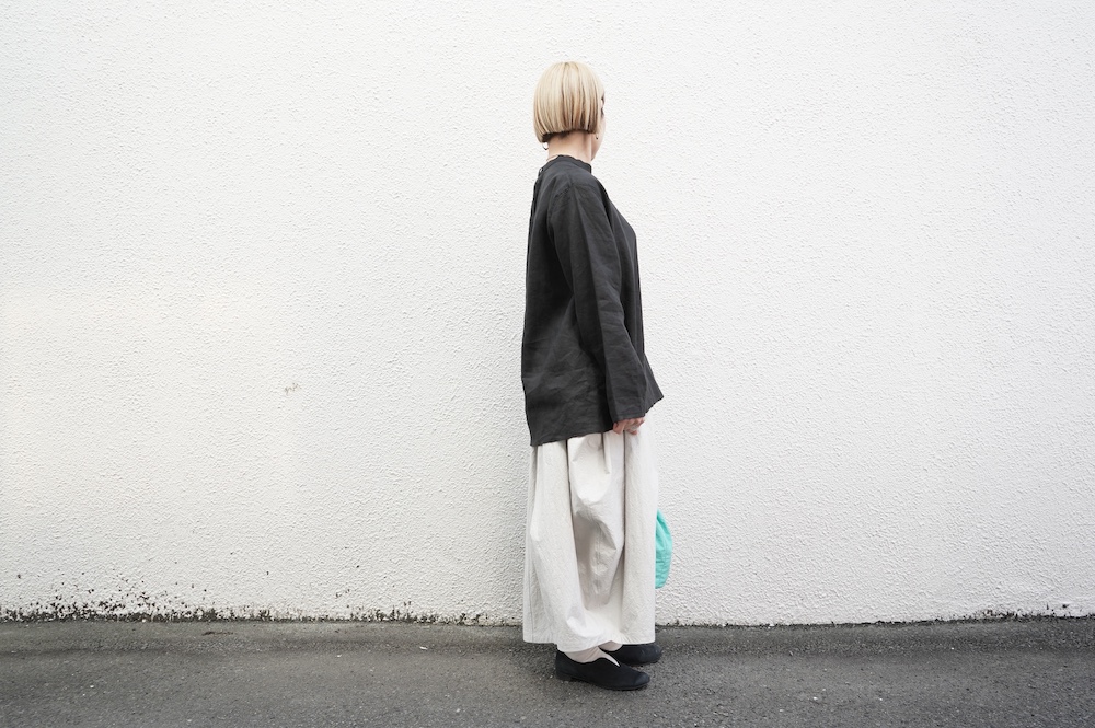 デザインはバルーンシルエットが特徴のロングスカート。深いプリーツと、プリーツに重なる5mm巾両玉縁ポケットがポイントになっています。ウエストはイージーなゴムシャーリング仕様で、ボリューム感のある仕上がりに。ボリューム感はありながら、パンツを穿いているかのような格好良い印象になるスカートです。