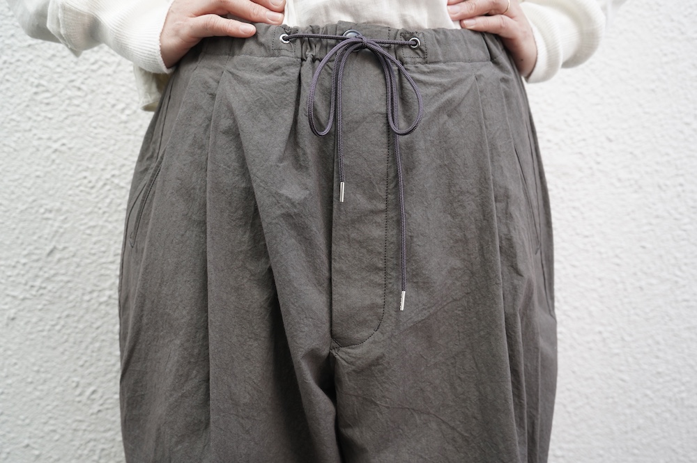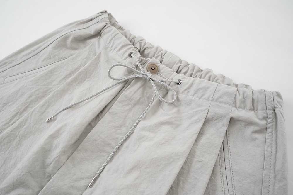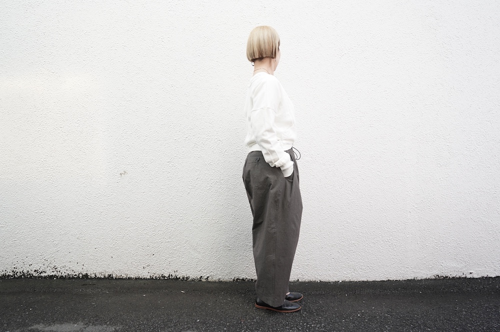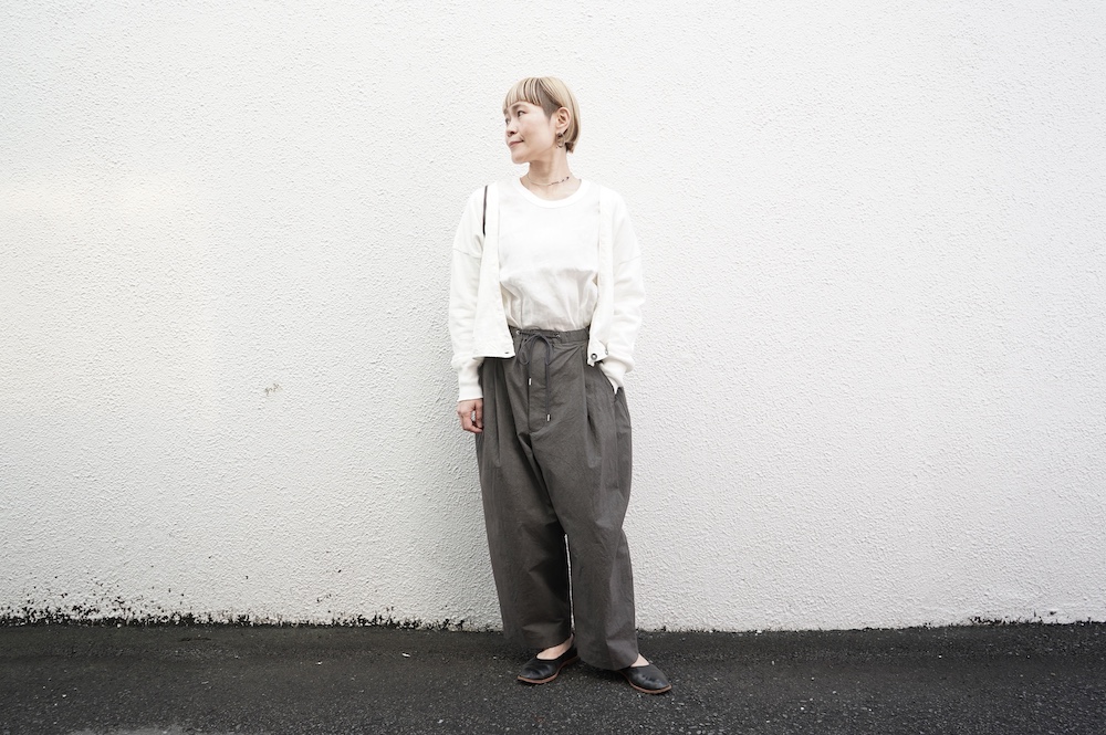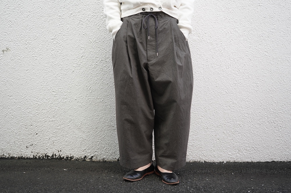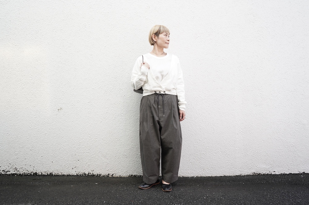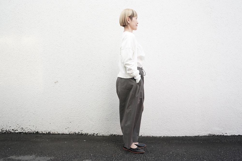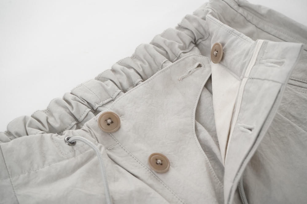 デザインは大きなタックが2本づつ入ったワイドテーパー型のパンツです。ゴムに紐のデザインで、フロントは比翼ボタンで打ち掛けには天狗とも言われる持ち出しがつきます。ワイドながら、ウエストのタックや後ろのシルエットもスッキリと収まりが良い。肌離れのいいパリッとした素材も気持ちいい、ガシガシと穿いていただけるパンツです。