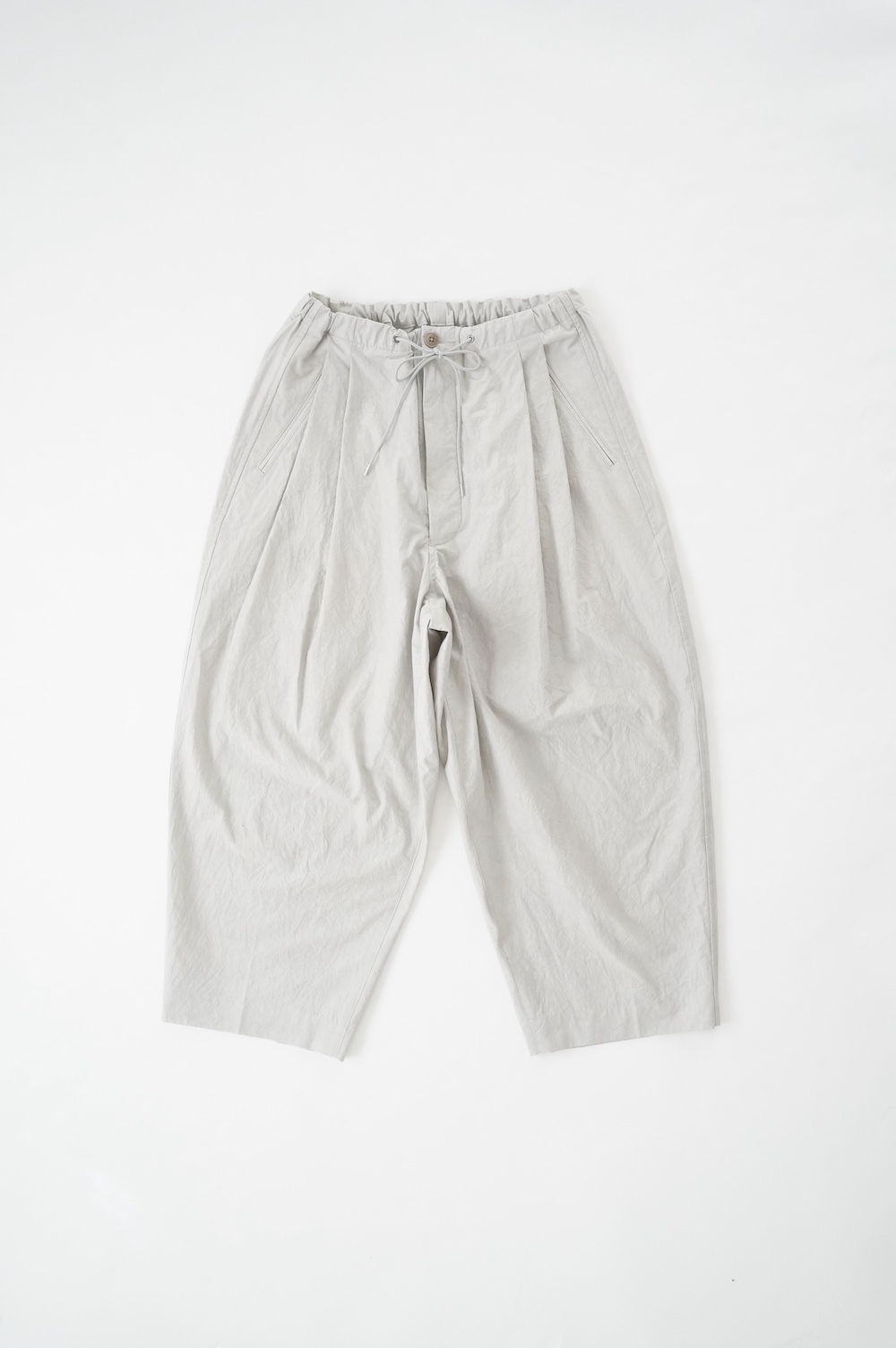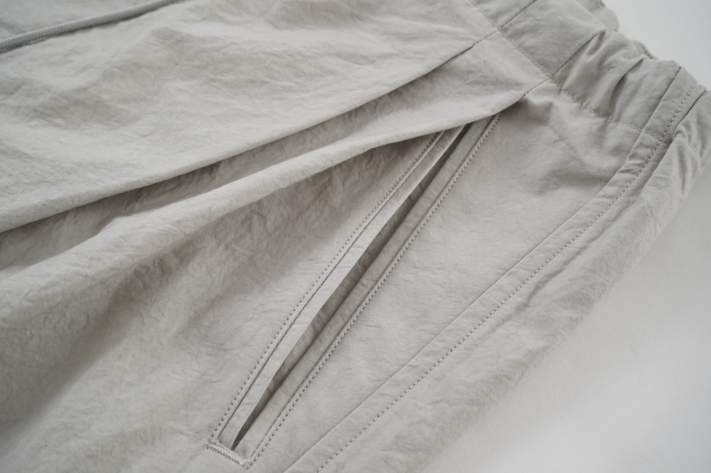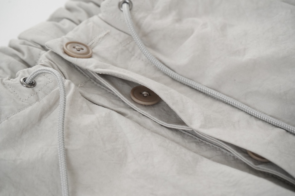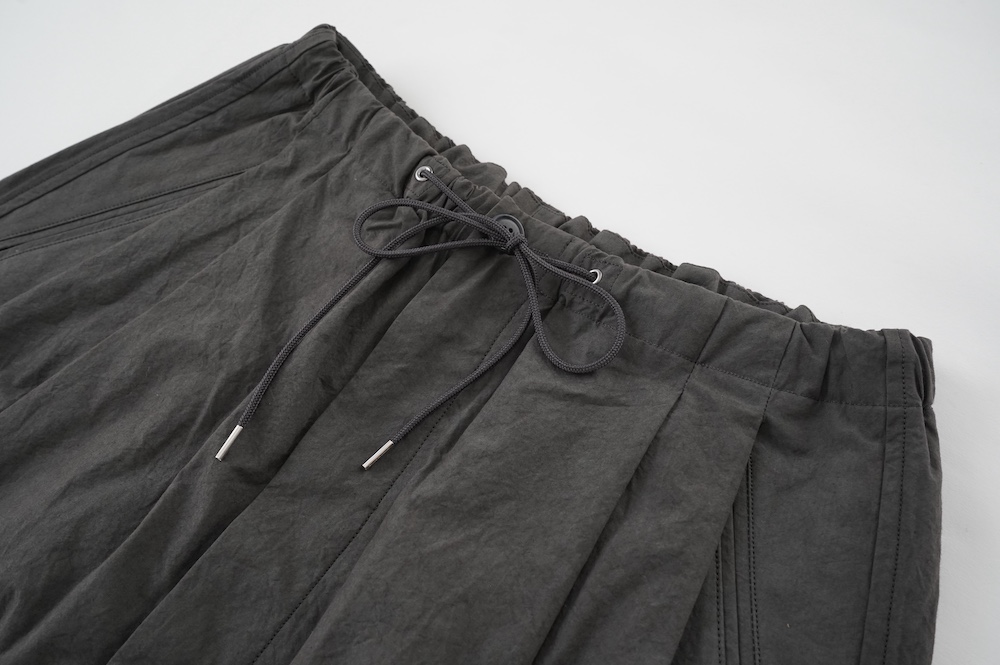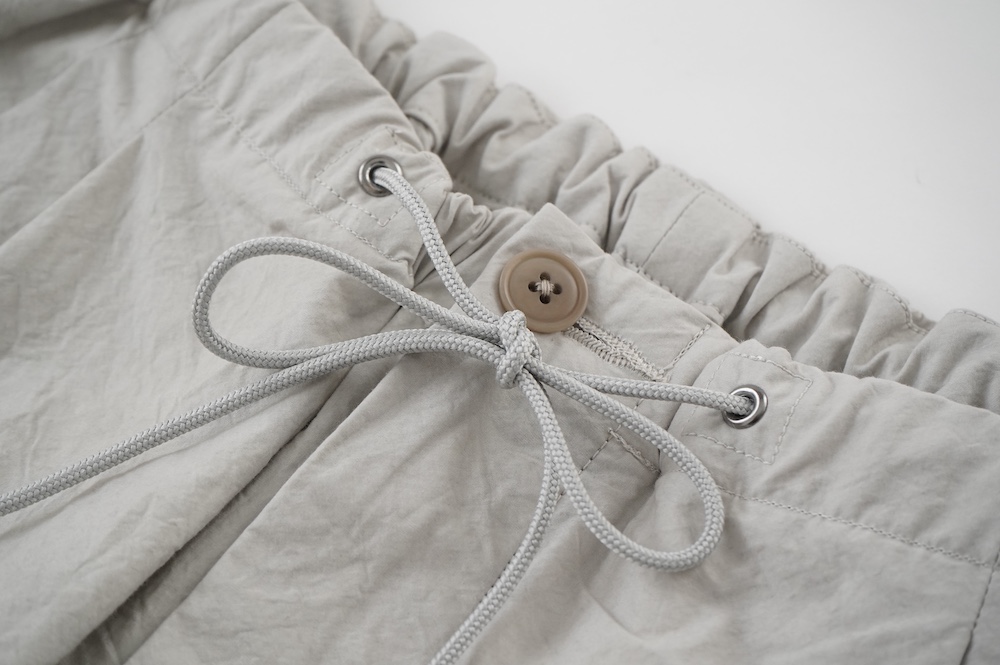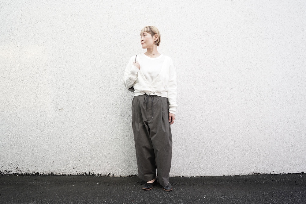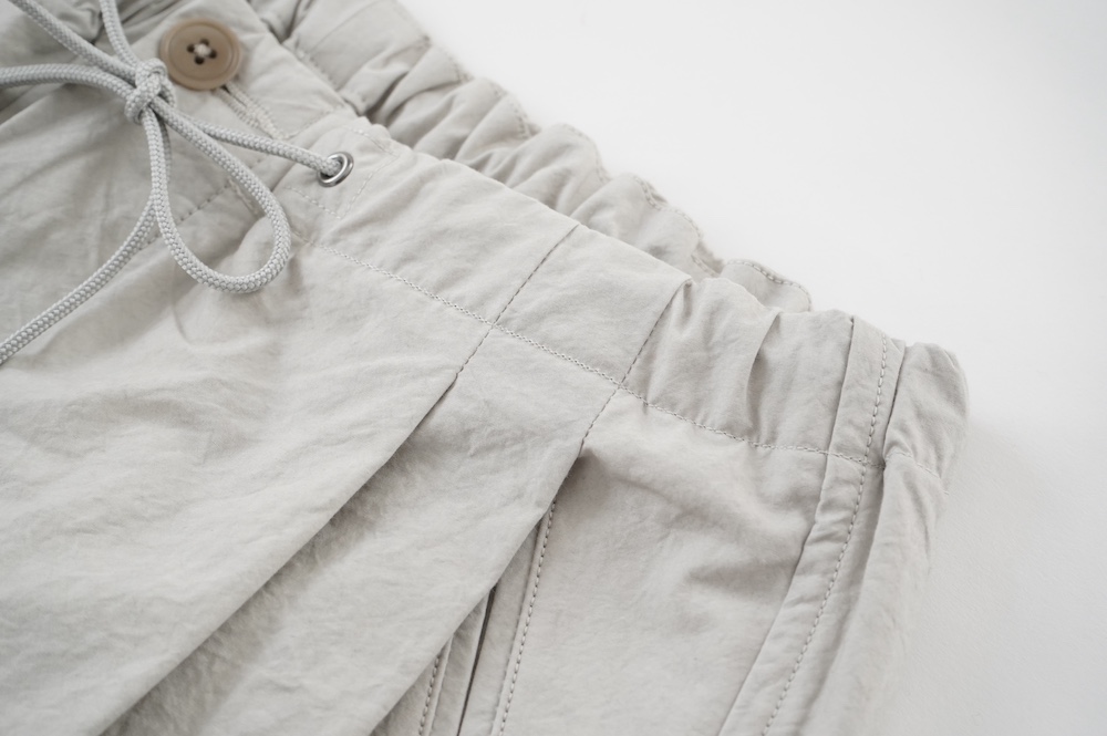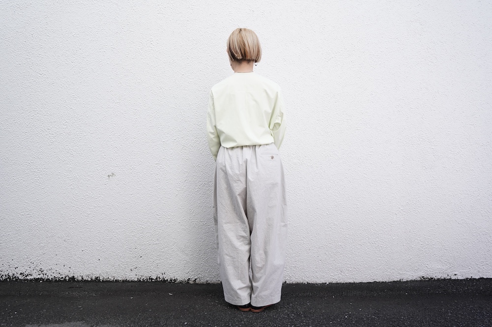 デザインは大きなタックが2本づつ入ったワイドテーパー型のパンツです。ゴムに紐のデザインで、フロントは比翼ボタンで打ち掛けには天狗とも言われる持ち出しがつきます。ワイドながら、ウエストのタックや後ろのシルエットもスッキリと収まりが良い。肌離れのいいパリッとした素材も気持ちいい、ガシガシと穿いていただけるパンツです。