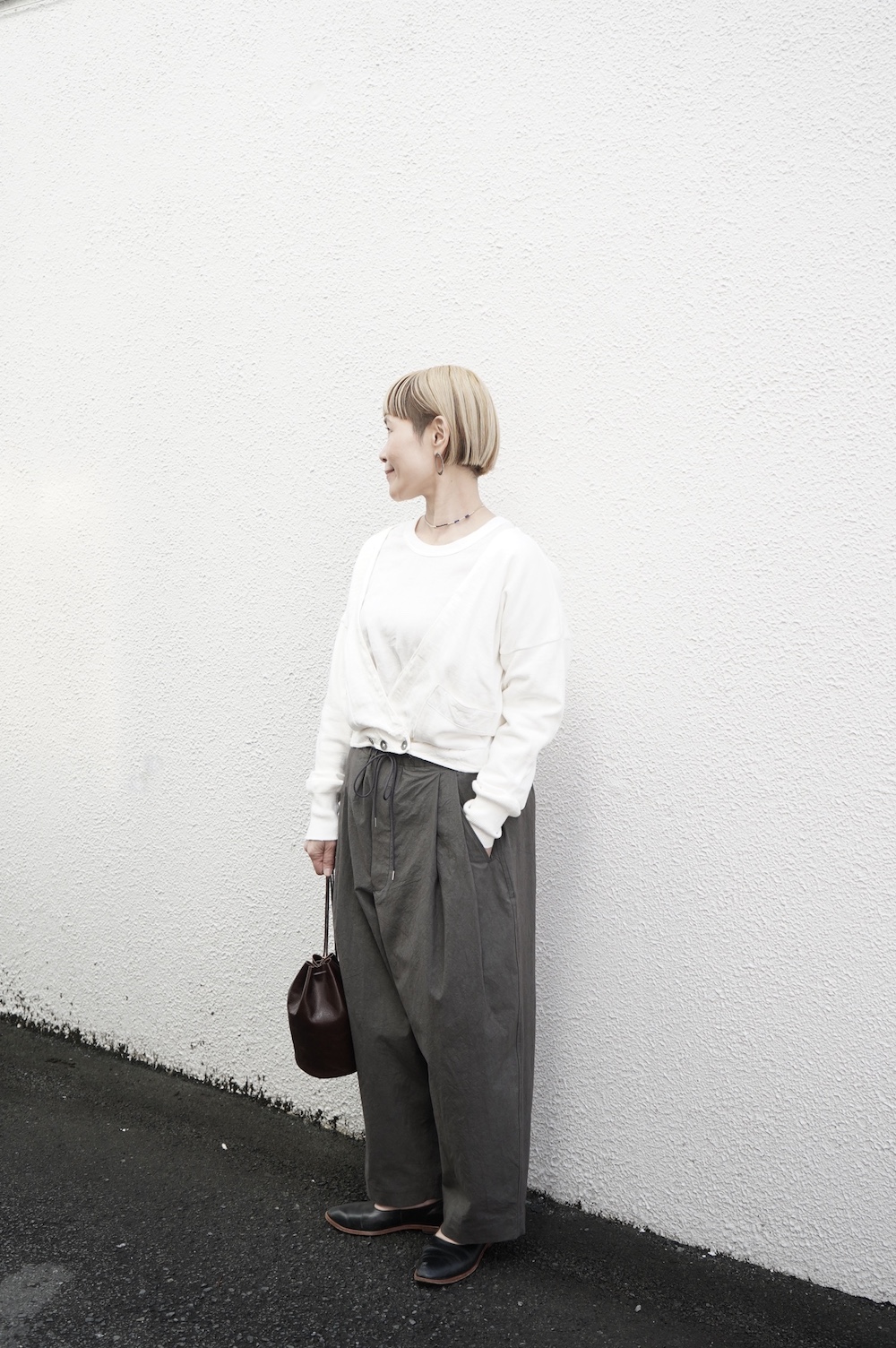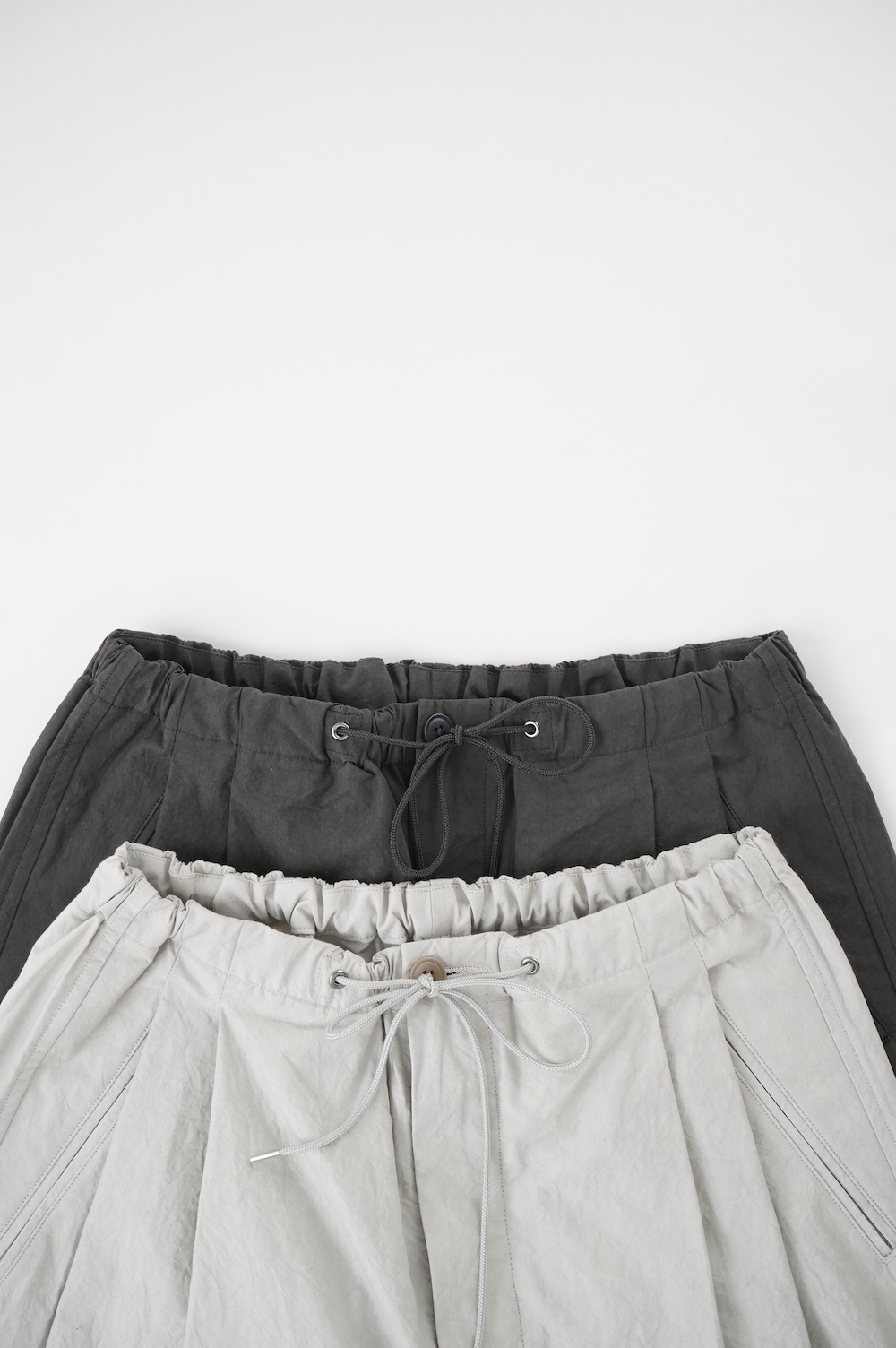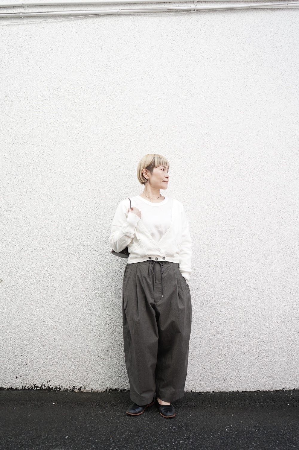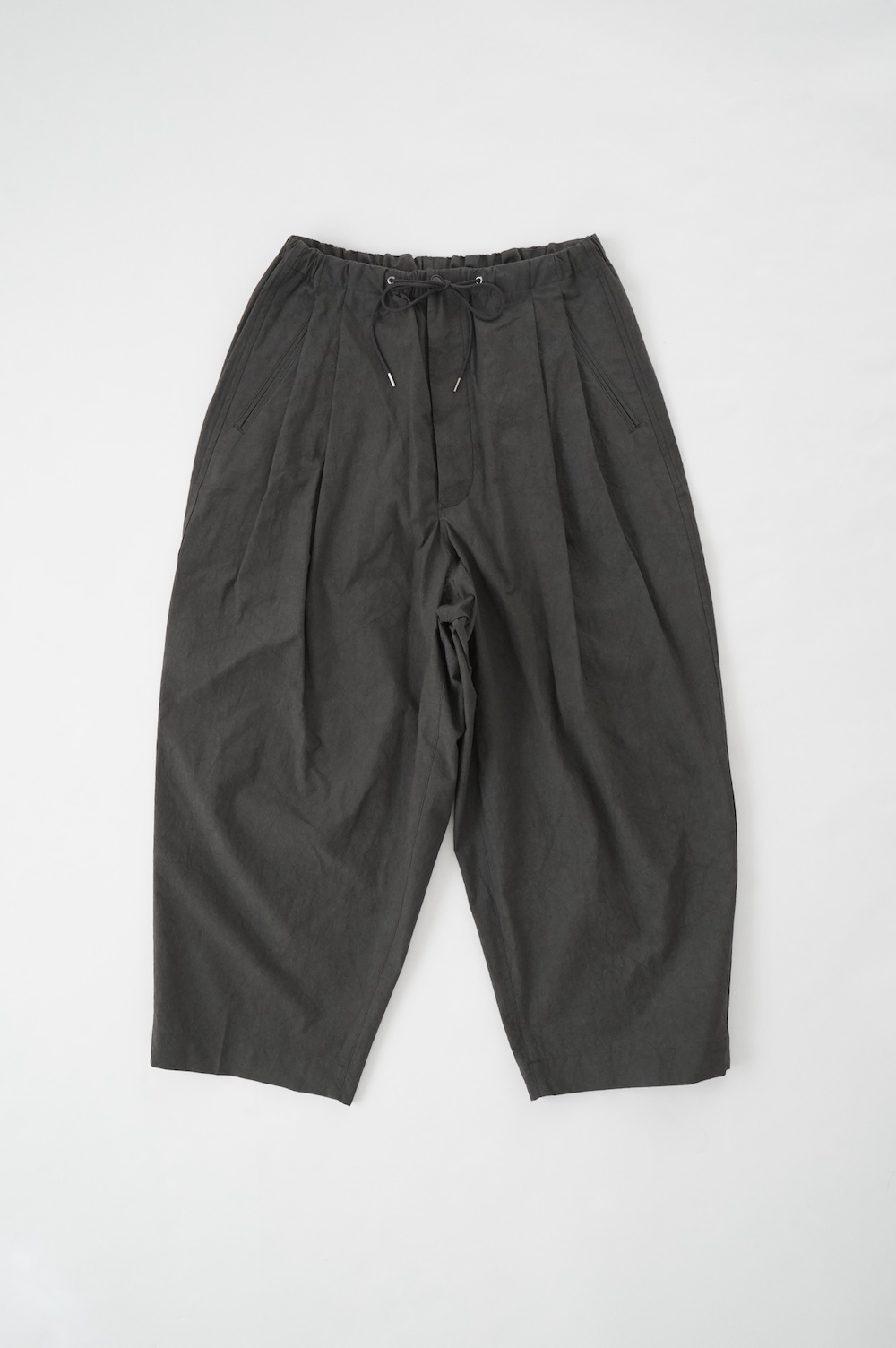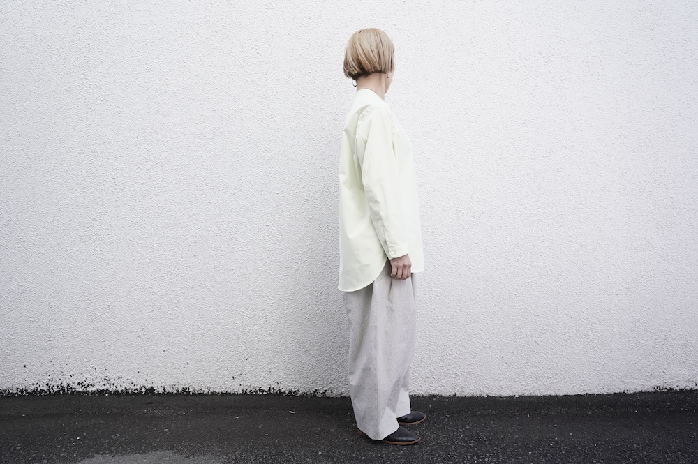デザインは大きなタックが2本づつ入ったワイドテーパー型のパンツです。ゴムに紐のデザインで、フロントは比翼ボタンで打ち掛けには天狗とも言われる持ち出しがつきます。ワイドながら、ウエストのタックや後ろのシルエットもスッキリと収まりが良い。肌離れのいいパリッとした素材も気持ちいい、ガシガシと穿いていただけるパンツです。