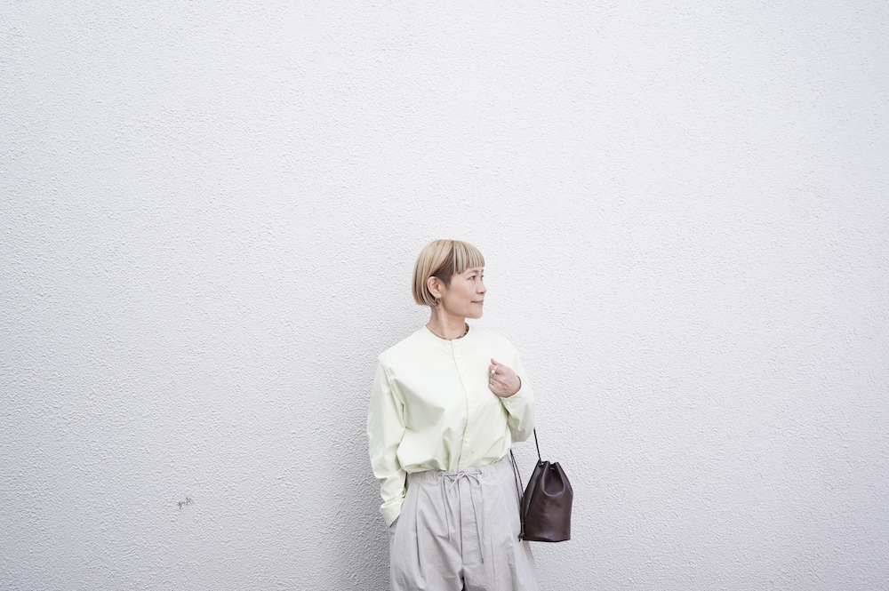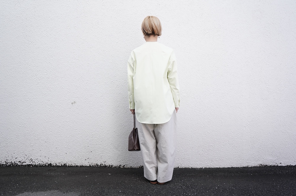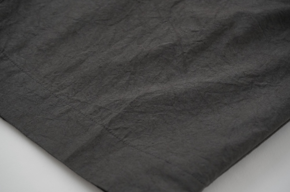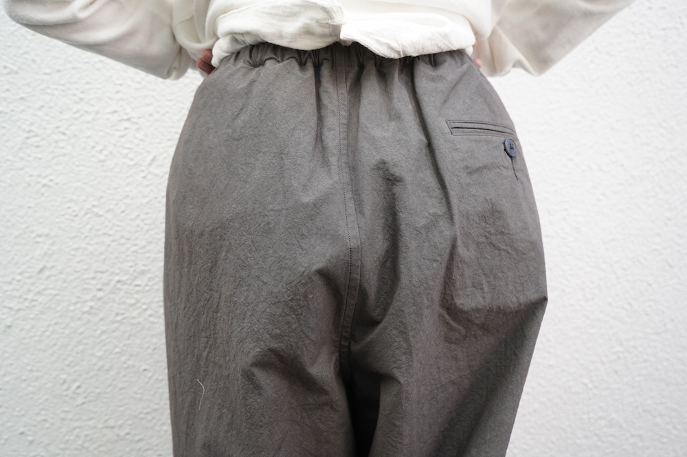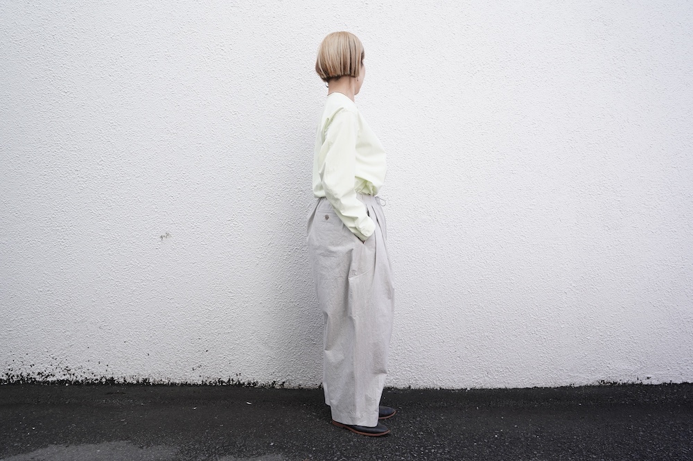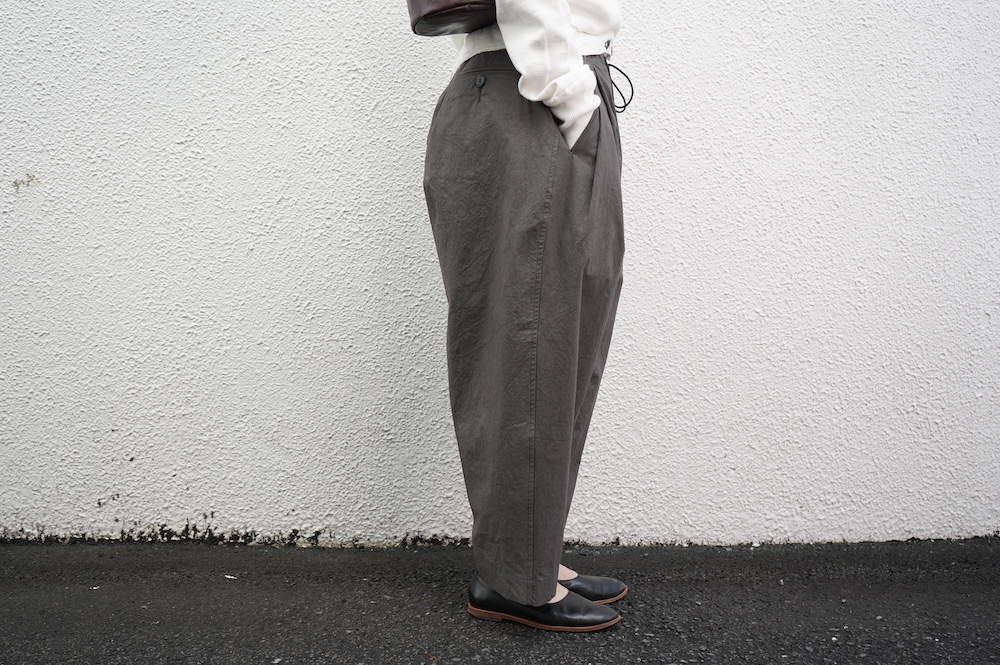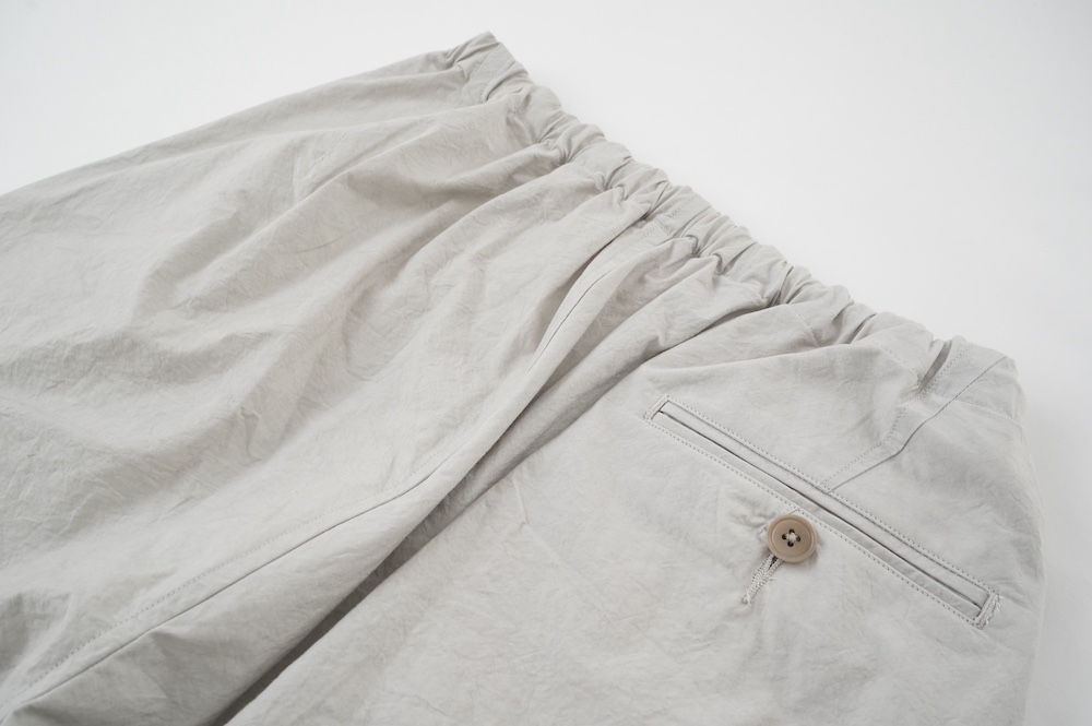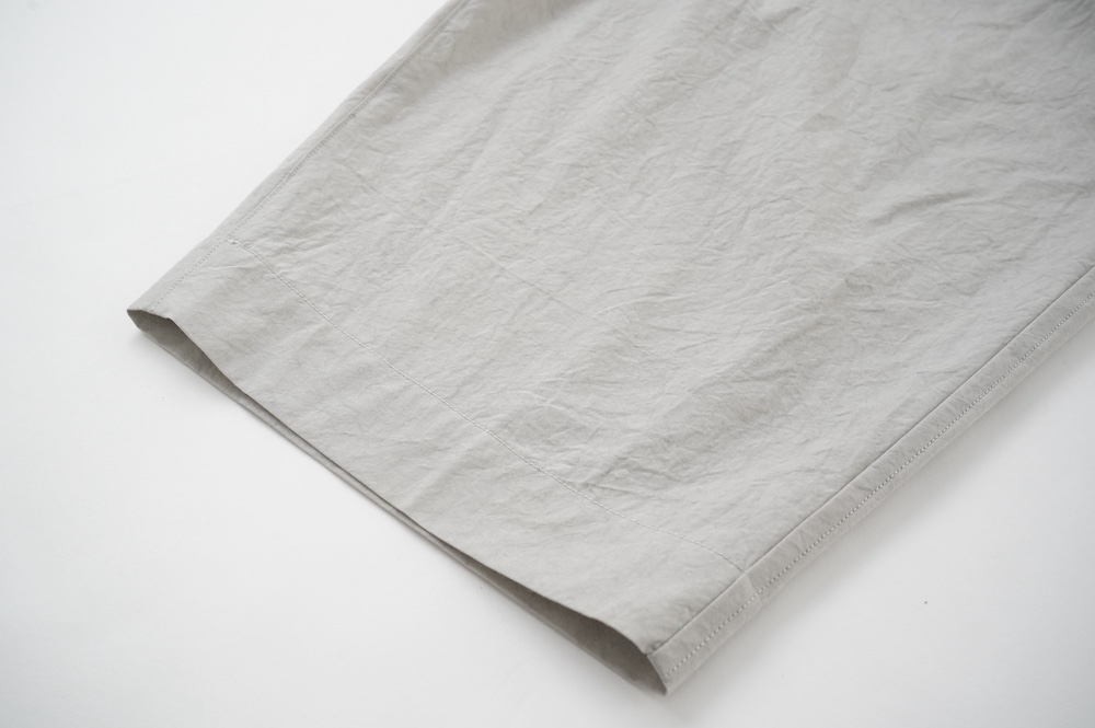 ”ハバーサック”のパンツ。高密度に織り上げたコットンタイプライター生地を使用。手作業で染めたムラ感と、天日干しによるシワ感が特徴的な、ハリのあるパリッとした風合いの素材です。薄手で軽いので、夏まで楽しめそうな生地感です。