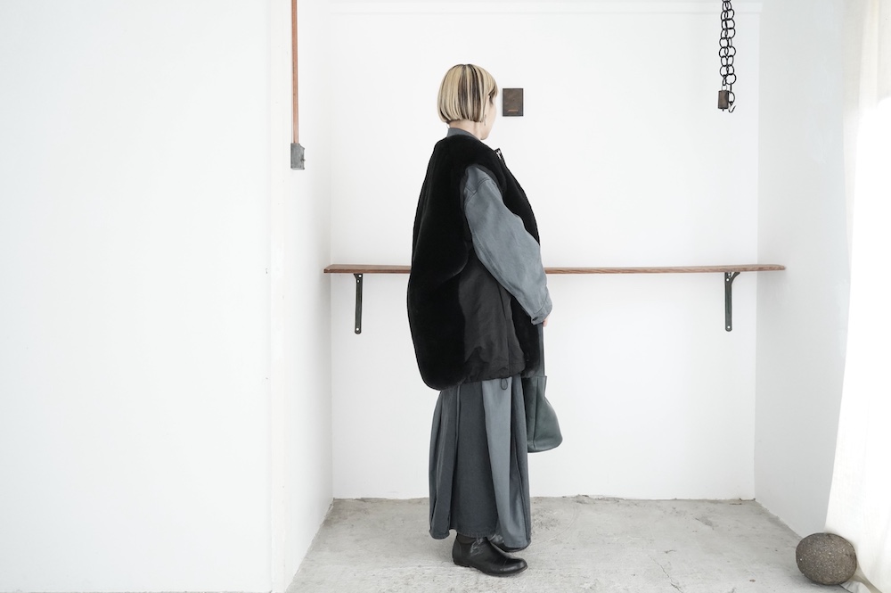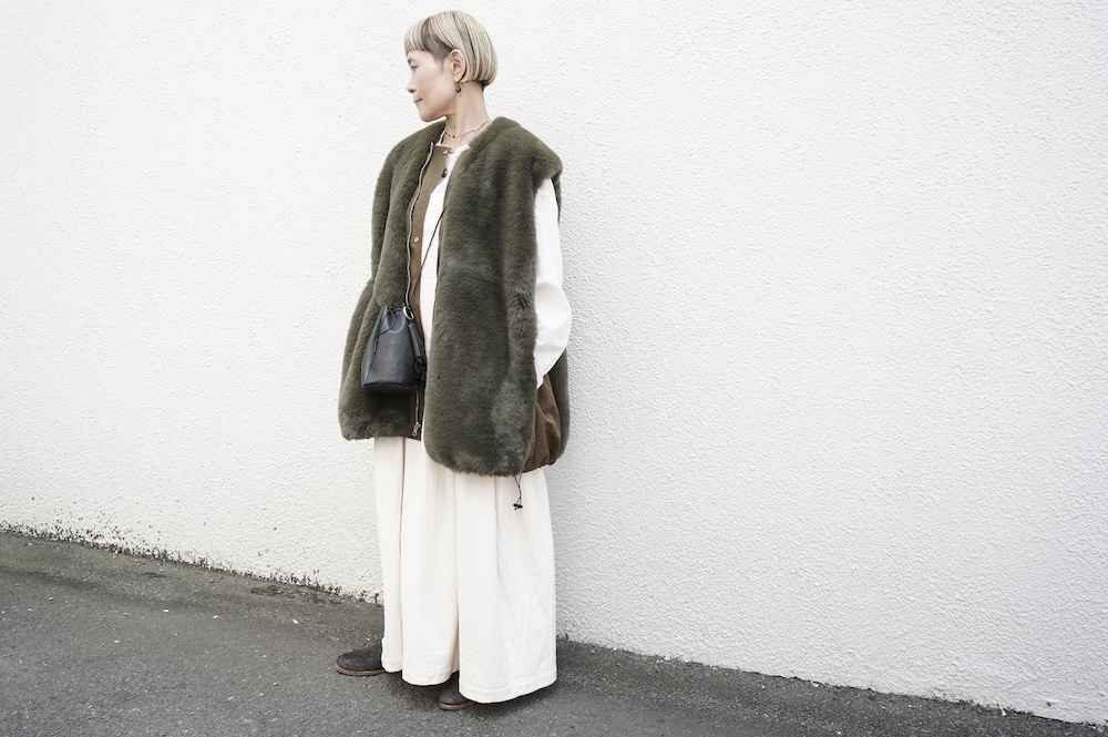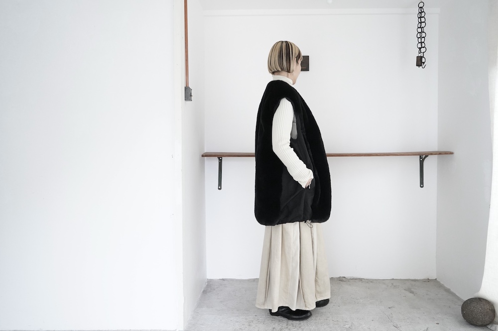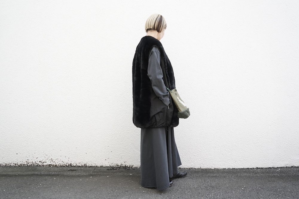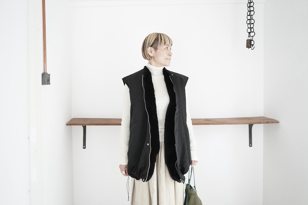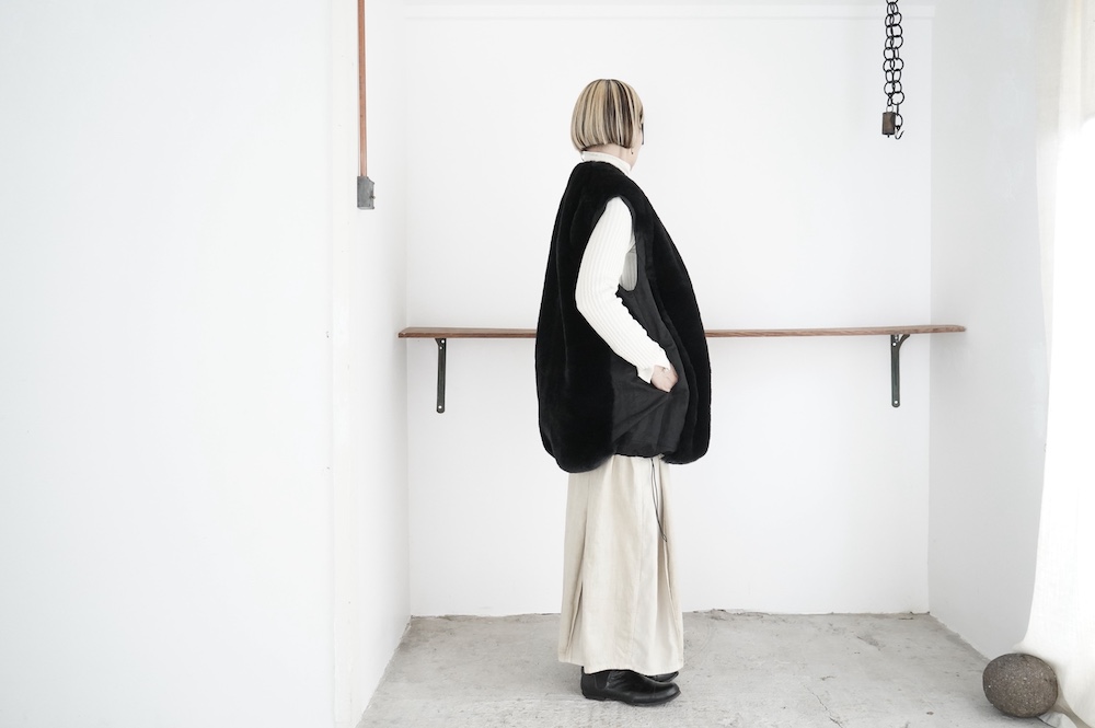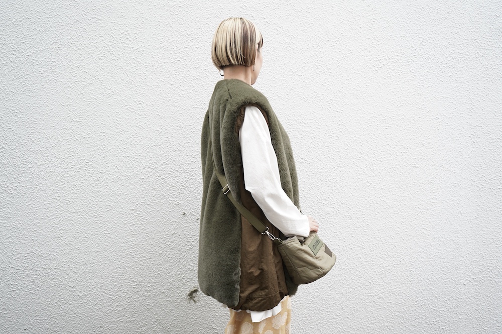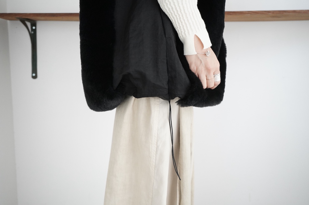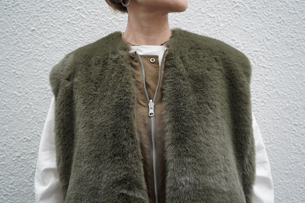 気持ちが良いふわふわファー素材と、さらりとクールなナイロン素材、気分や装いに合わせて二つの雰囲気を味わえます。アームホールは大きめなので、ボリュームのあるトップスの上からも着ていただけます。
