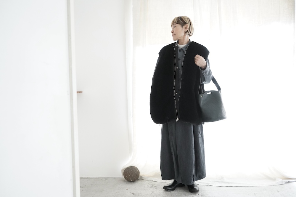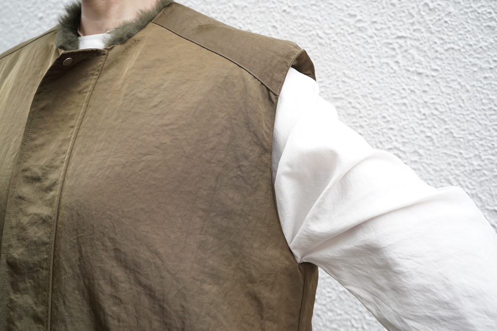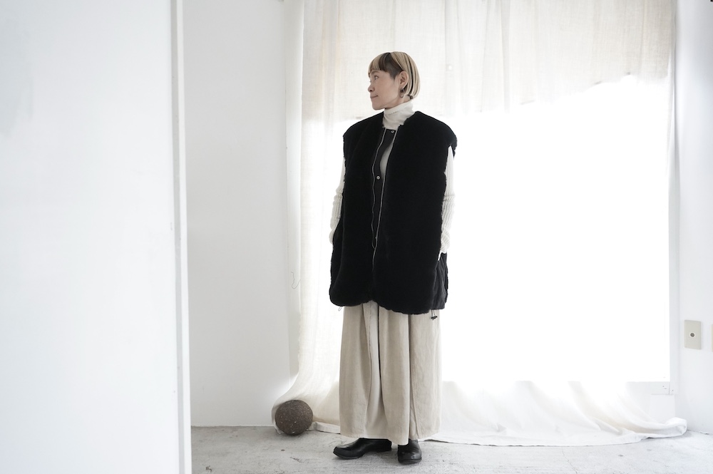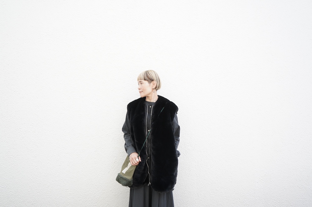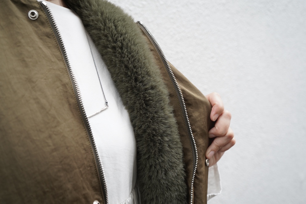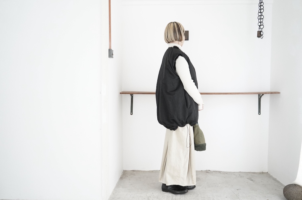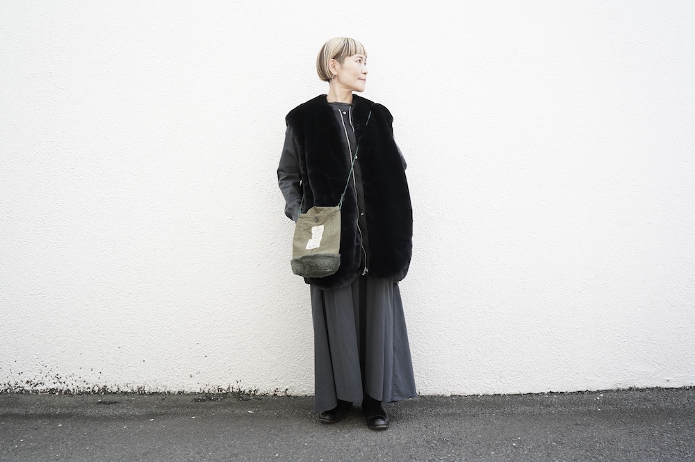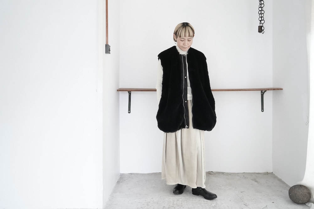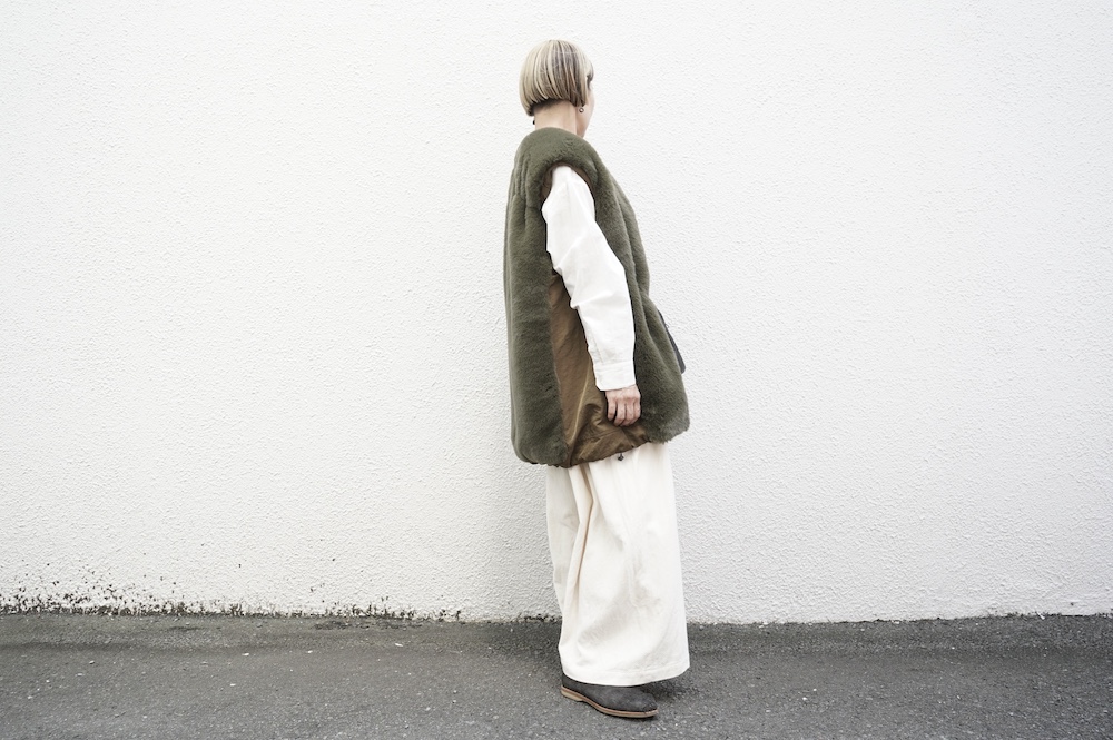 気持ちが良いふわふわファー素材と、さらりとクールなナイロン素材、気分や装いに合わせて二つの雰囲気を味わえます。アームホールは大きめなので、ボリュームのあるトップスの上からも着ていただけます。