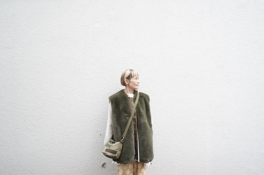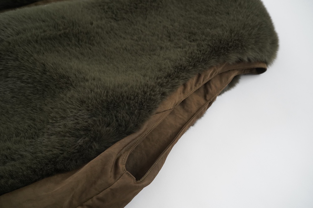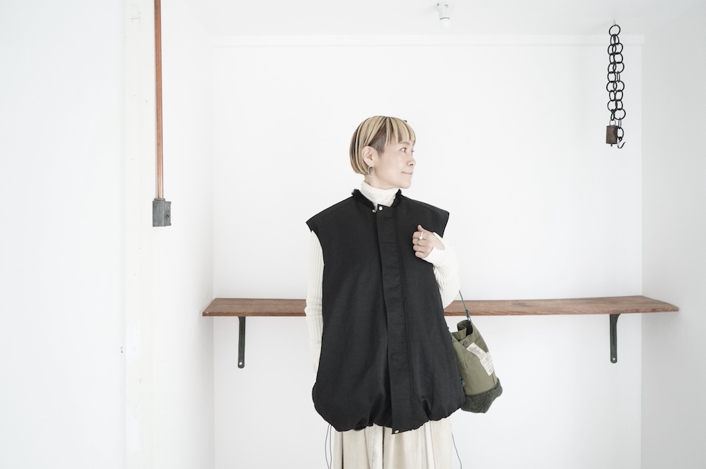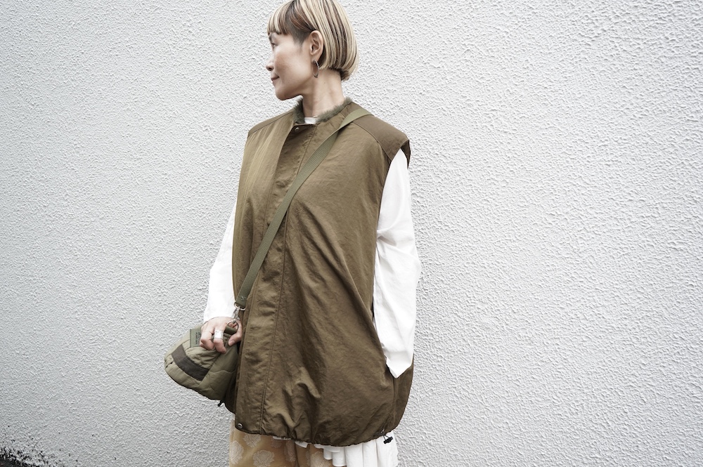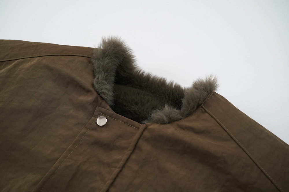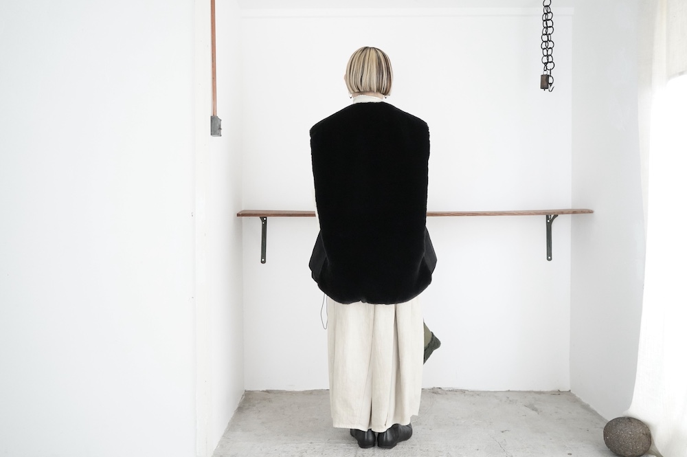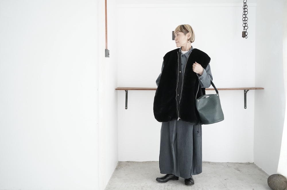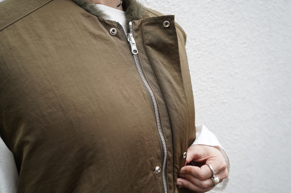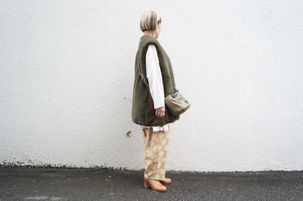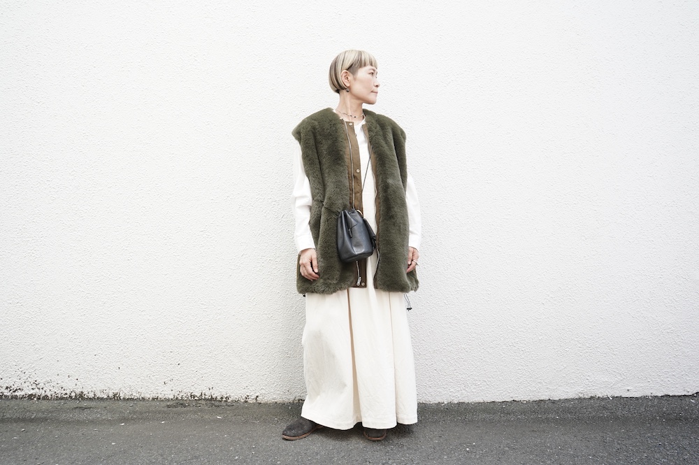 気持ちが良いふわふわファー素材と、さらりとクールなナイロン素材、気分や装いに合わせて二つの雰囲気を味わえます。アームホールは大きめなので、ボリュームのあるトップスの上からも着ていただけます。
