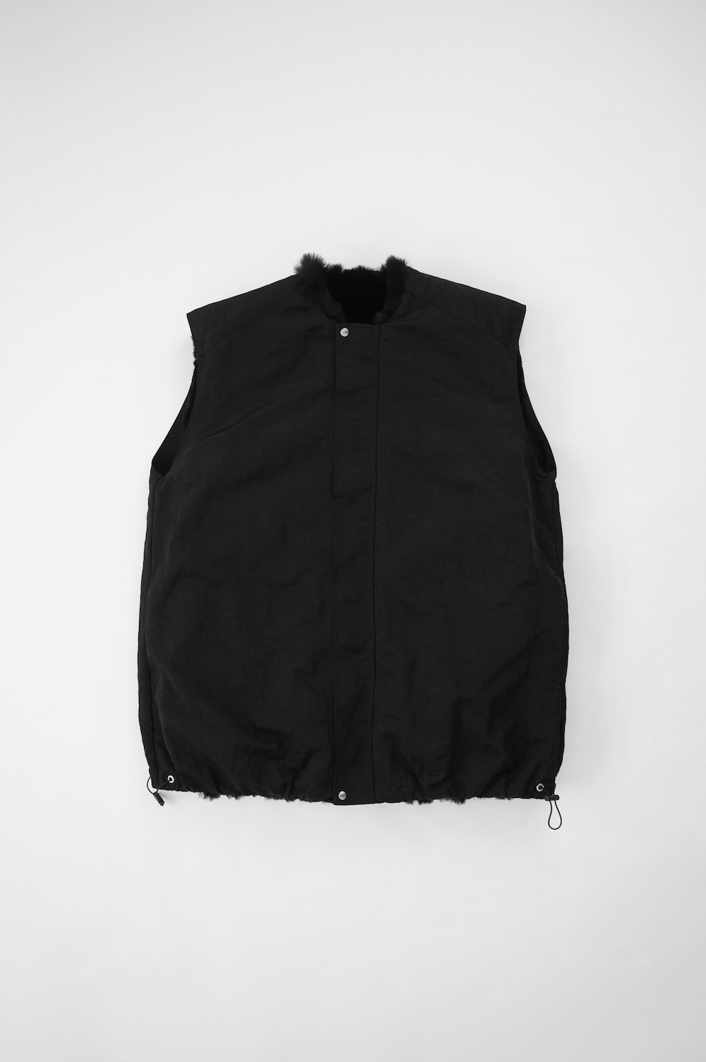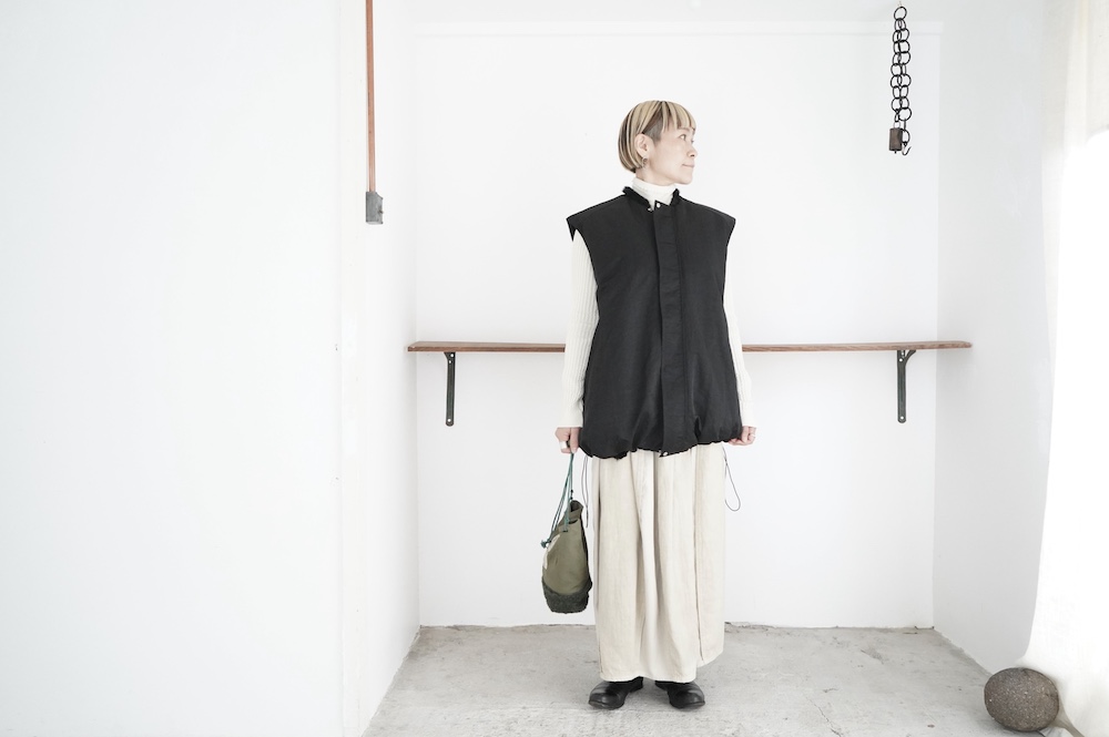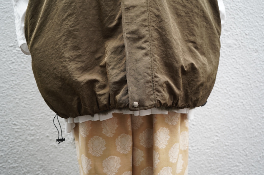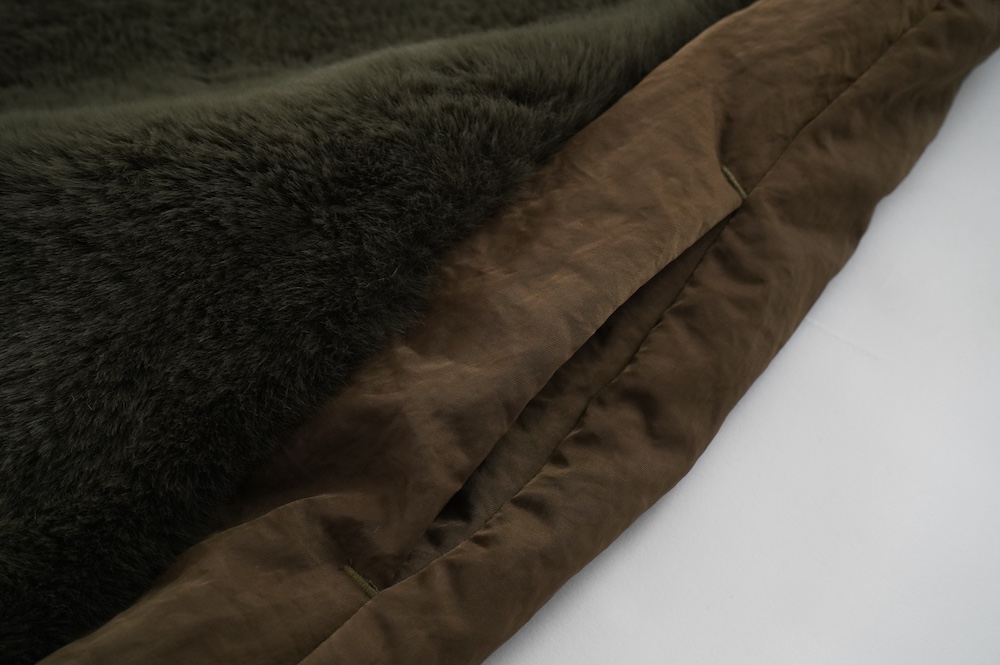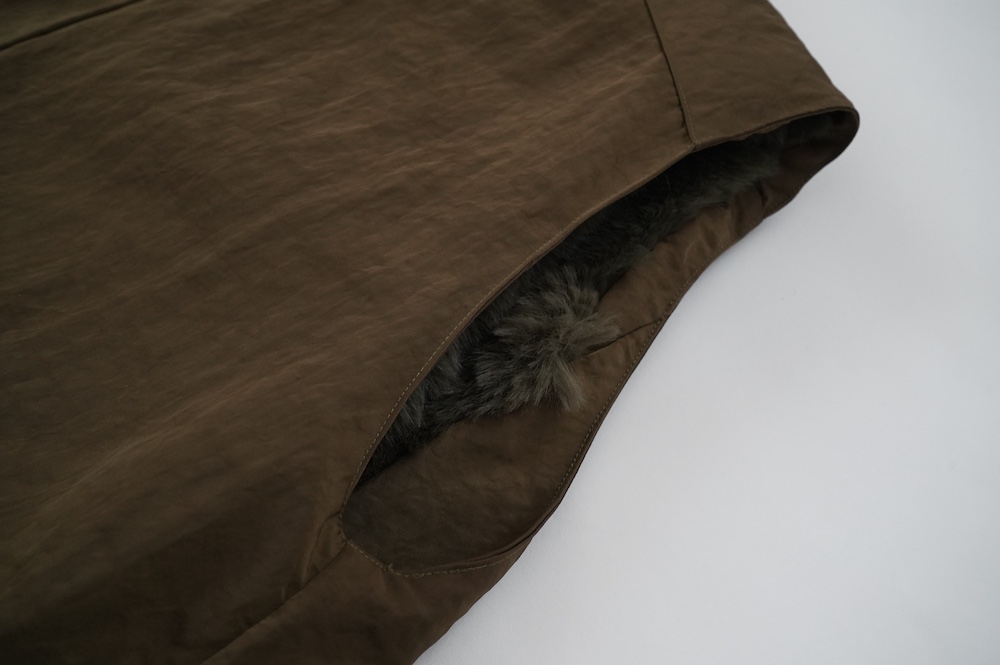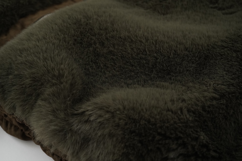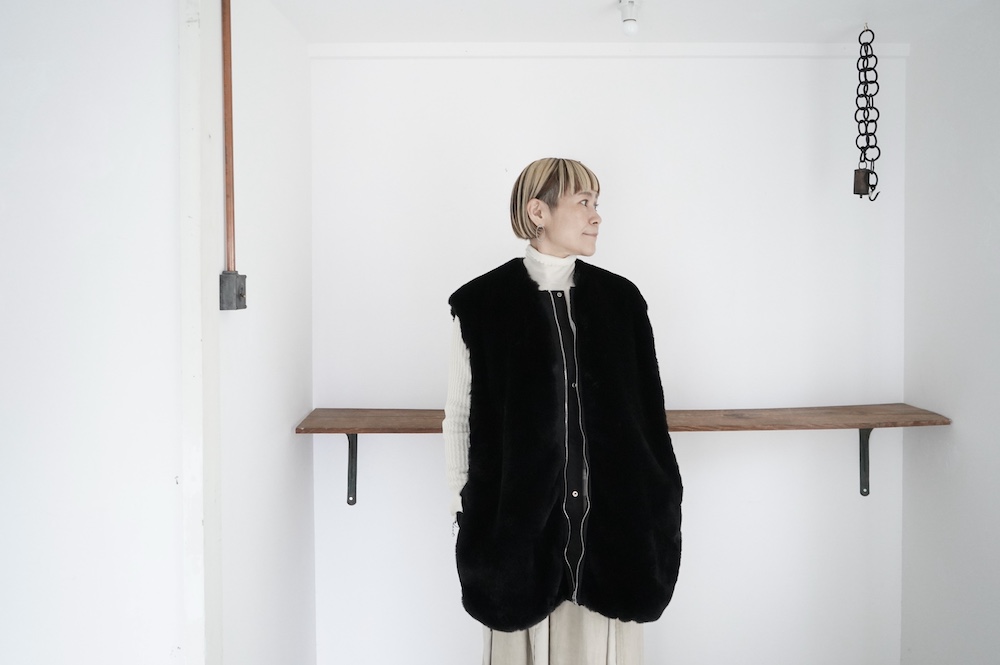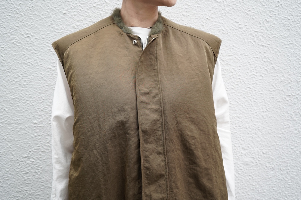 気持ちが良いふわふわファー素材と、さらりとクールなナイロン素材、気分や装いに合わせて二つの雰囲気を味わえます。アームホールは大きめなので、ボリュームのあるトップスの上からも着ていただけます。