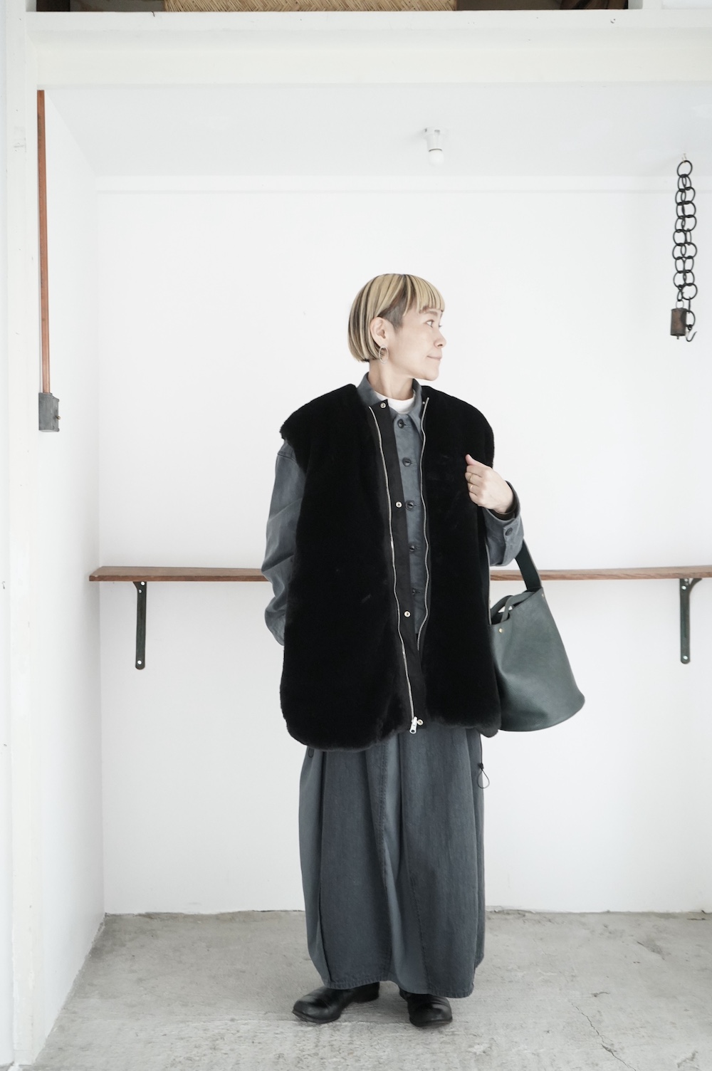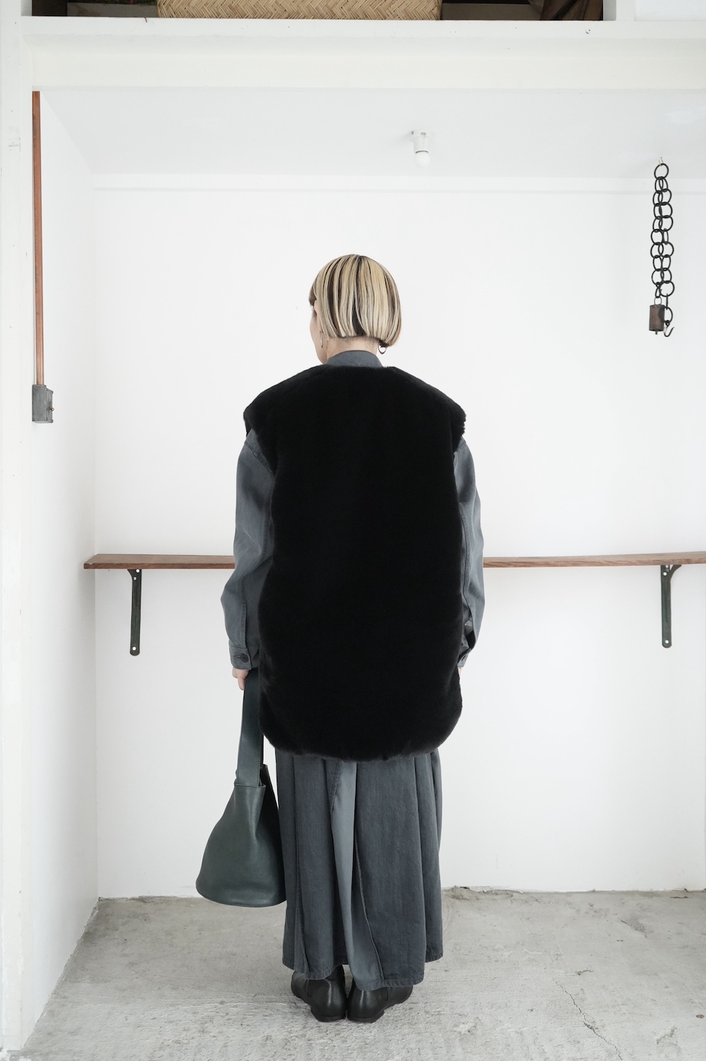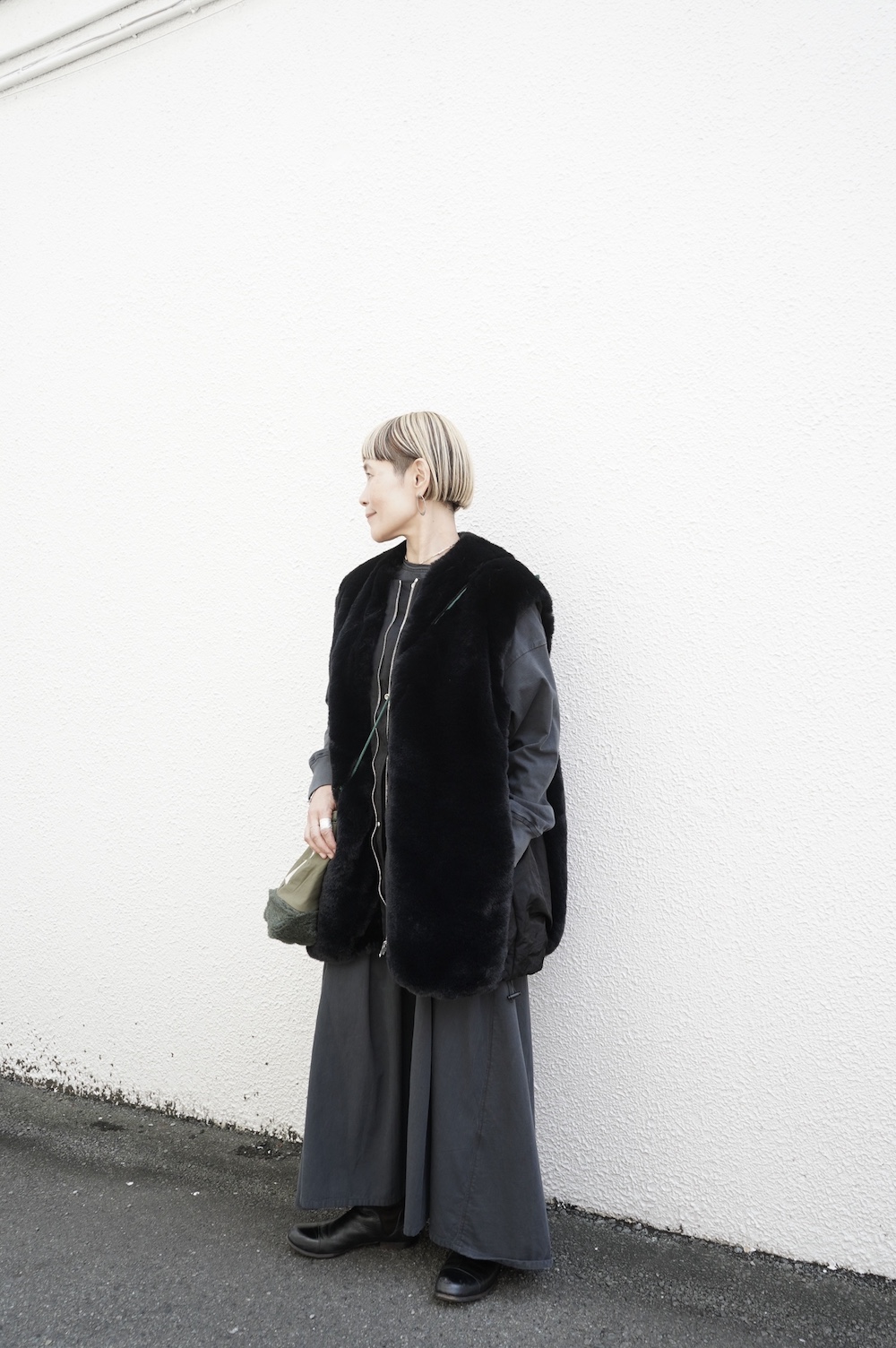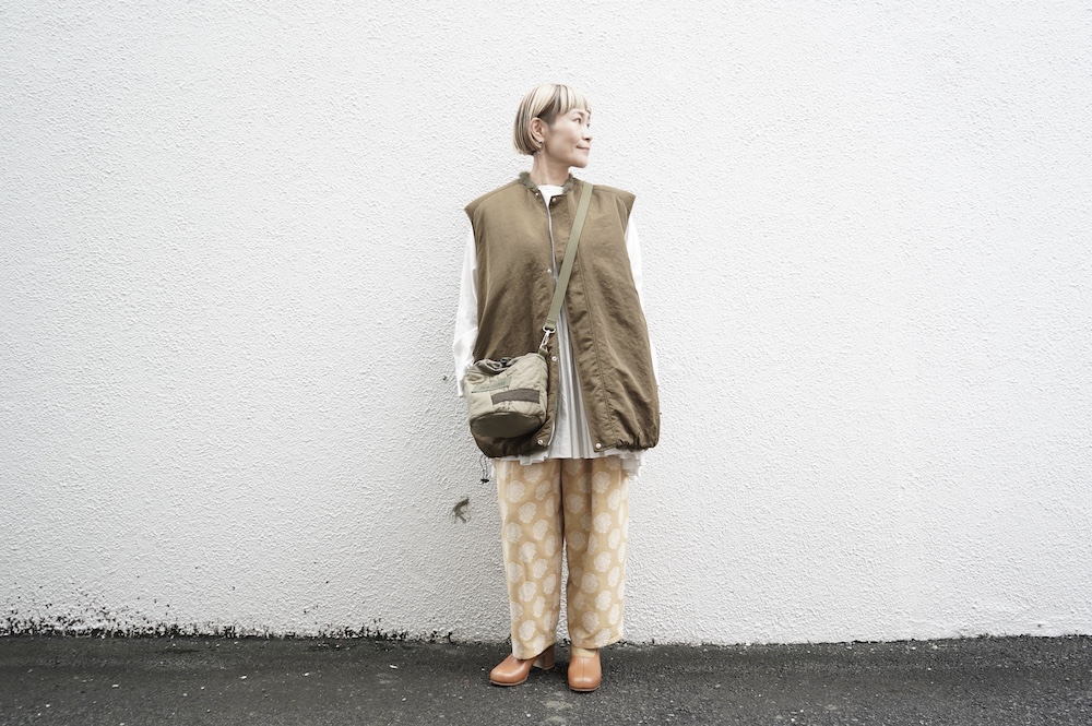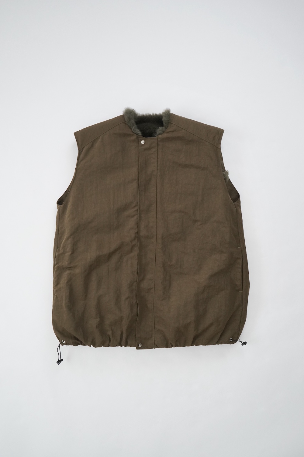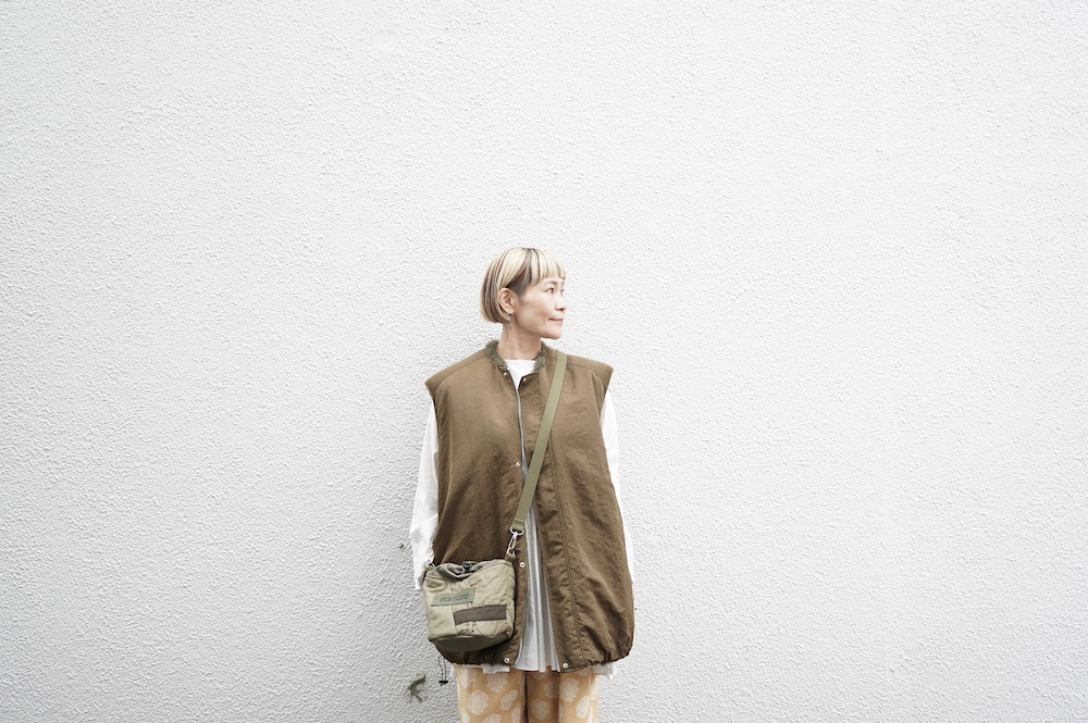 気持ちが良いふわふわファー素材と、さらりとクールなナイロン素材、気分や装いに合わせて二つの雰囲気を味わえます。アームホールは大きめなので、ボリュームのあるトップスの上からも着ていただけます。