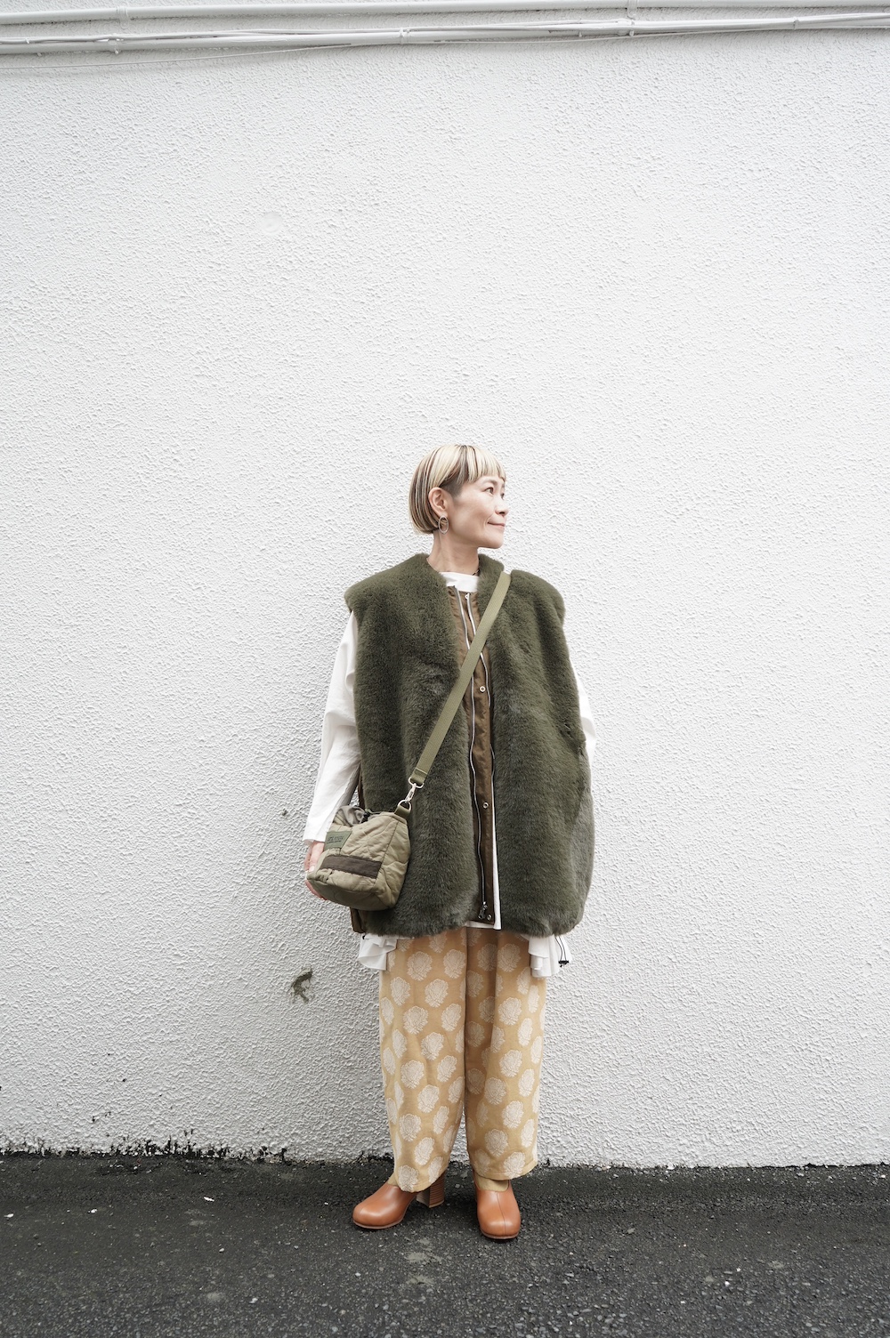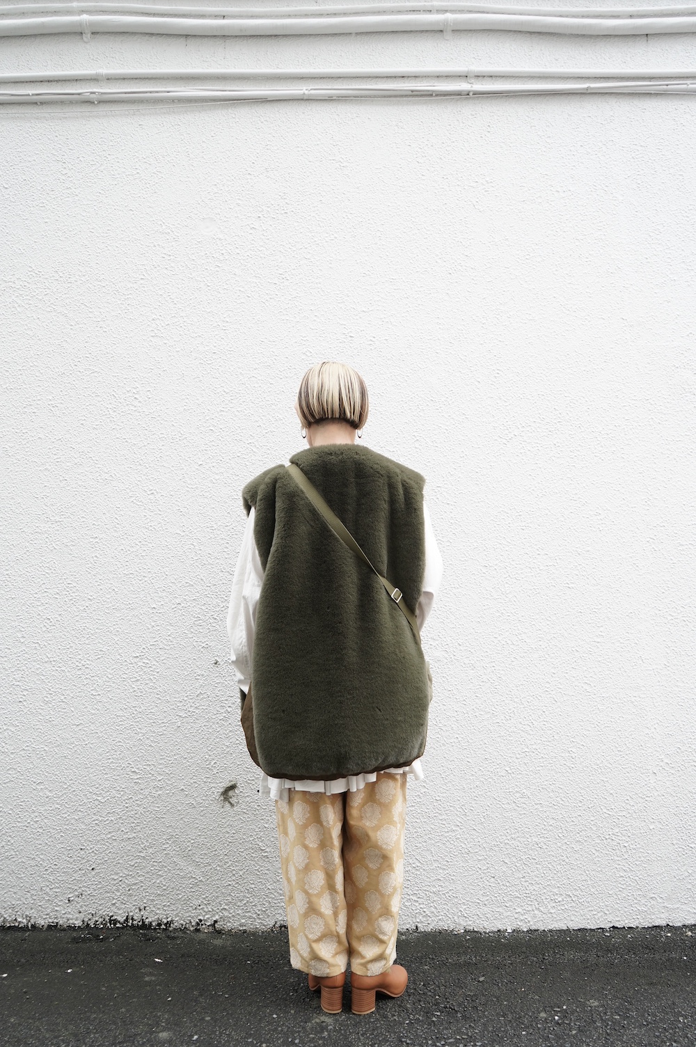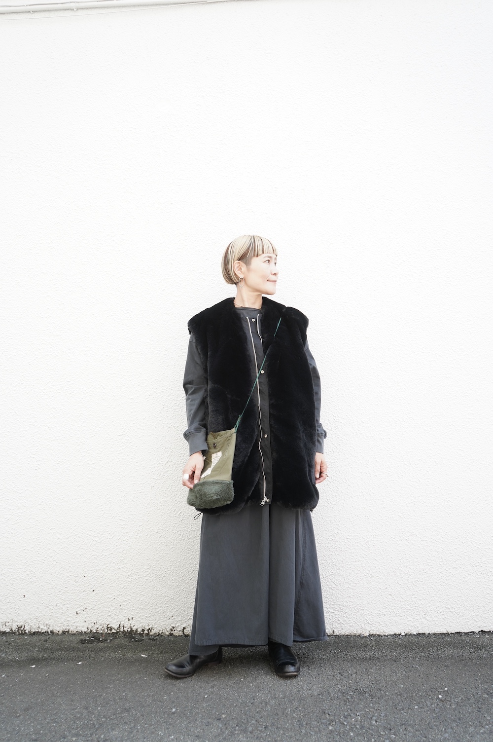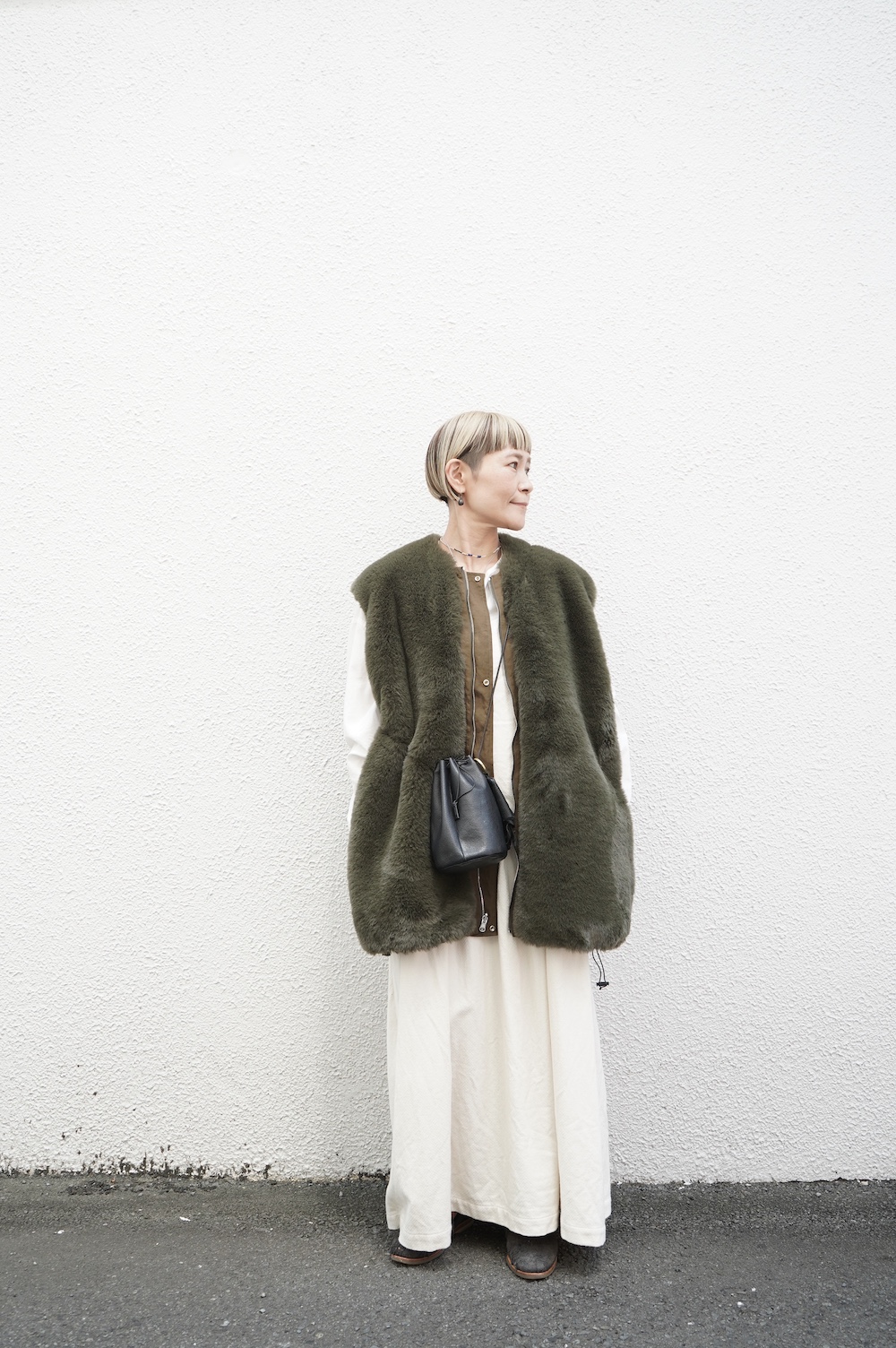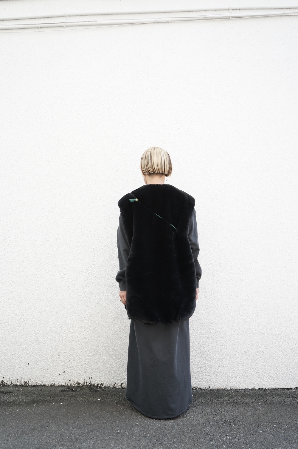 気持ちが良いふわふわファー素材と、さらりとクールなナイロン素材、気分や装いに合わせて二つの雰囲気を味わえます。アームホールは大きめなので、ボリュームのあるトップスの上からも着ていただけます。
