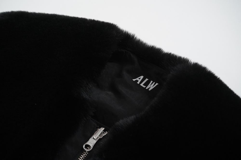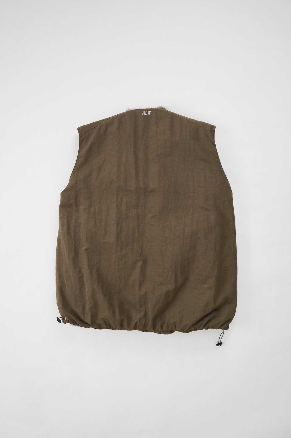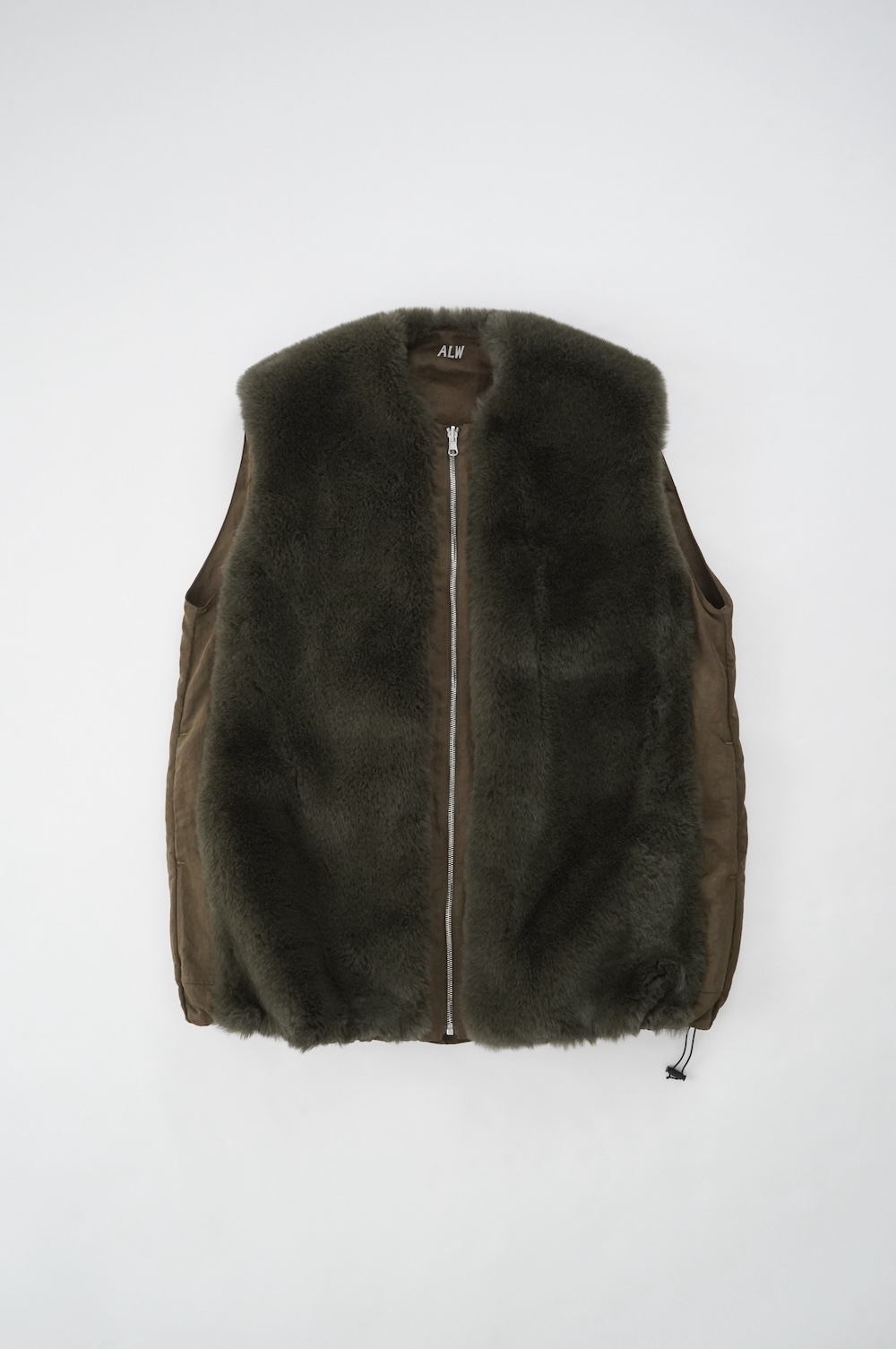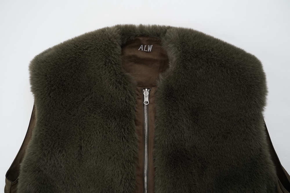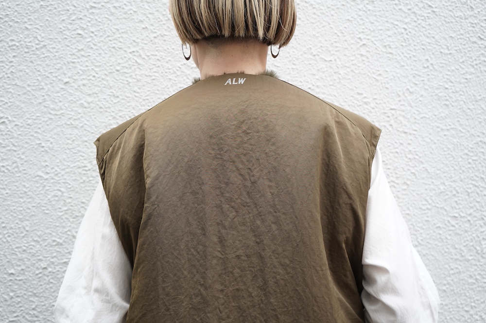 デザインは着丈が長めのボリュームのあるベスト。センターはジップとスナップ釦です。ファー面のサイド部分はファーがないのでボリュームはありますが見た目も着心地もすっきりとしています。裾の両サイドにはドローコードがついていて、絞って着ると丈も調節可能です。ナイロン部分後ろ首元にはブランド名「ALWEL」のロゴがリフレクターになっています。