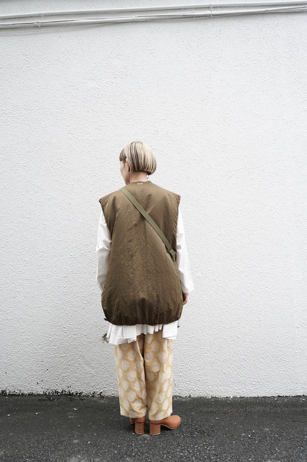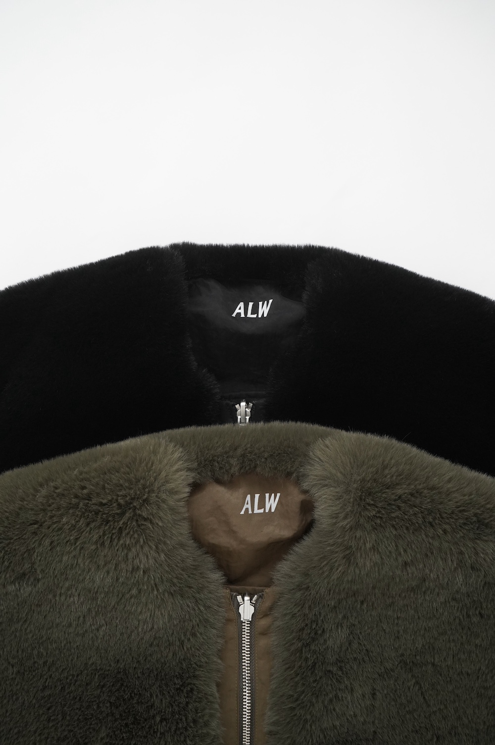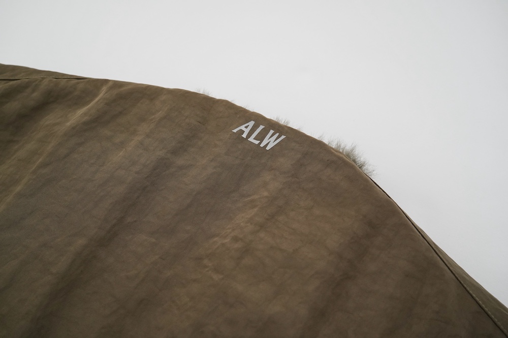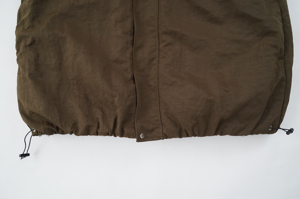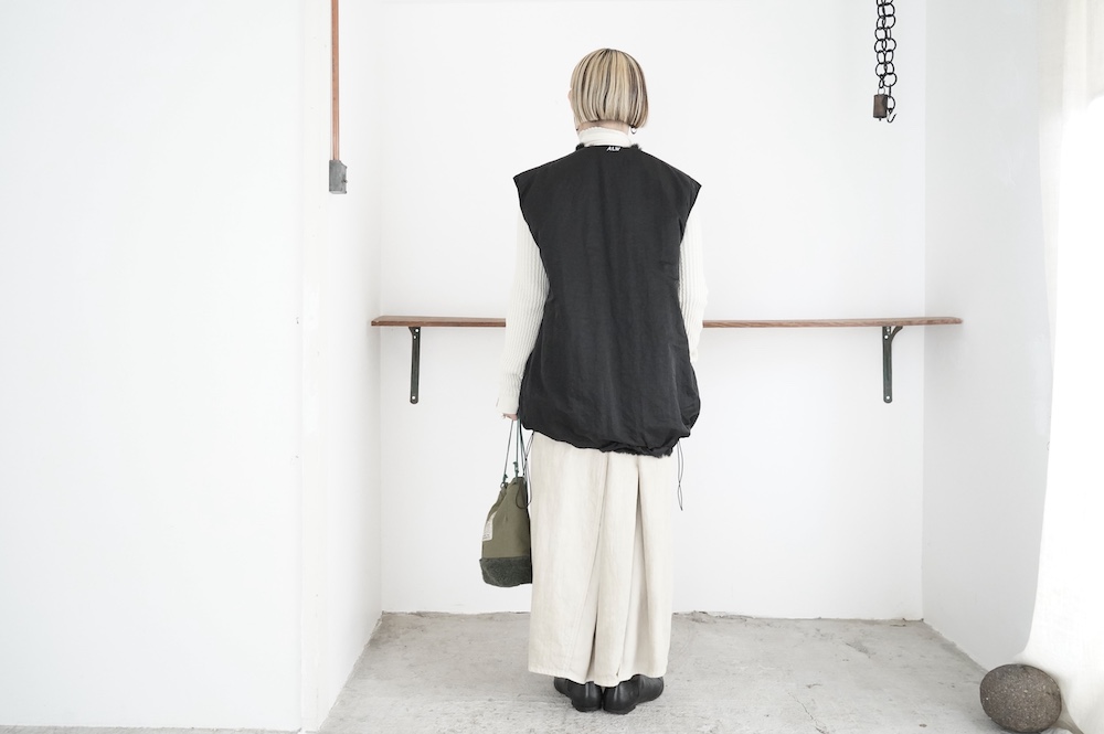 デザインは着丈が長めのボリュームのあるベスト。センターはジップとスナップ釦です。ファー面のサイド部分はファーがないのでボリュームはありますが見た目も着心地もすっきりとしています。裾の両サイドにはドローコードがついていて、絞って着ると丈も調節可能です。ナイロン部分後ろ首元にはブランド名「ALWEL」のロゴがリフレクターになっています。